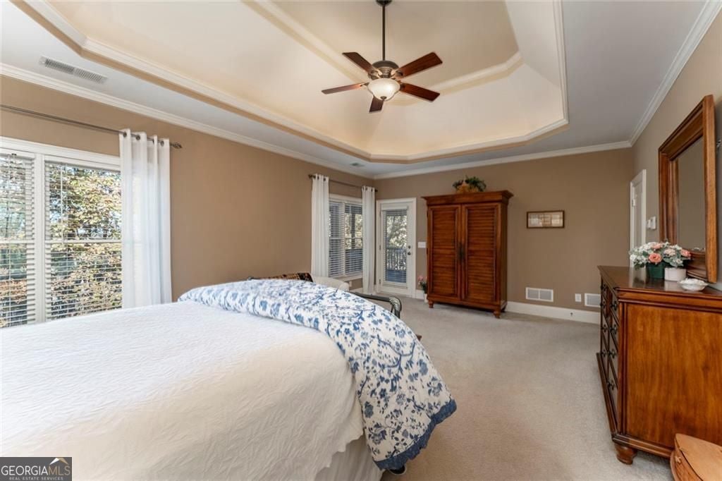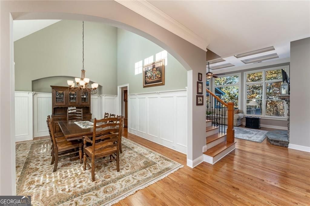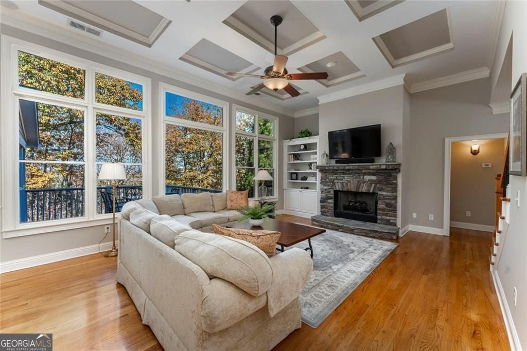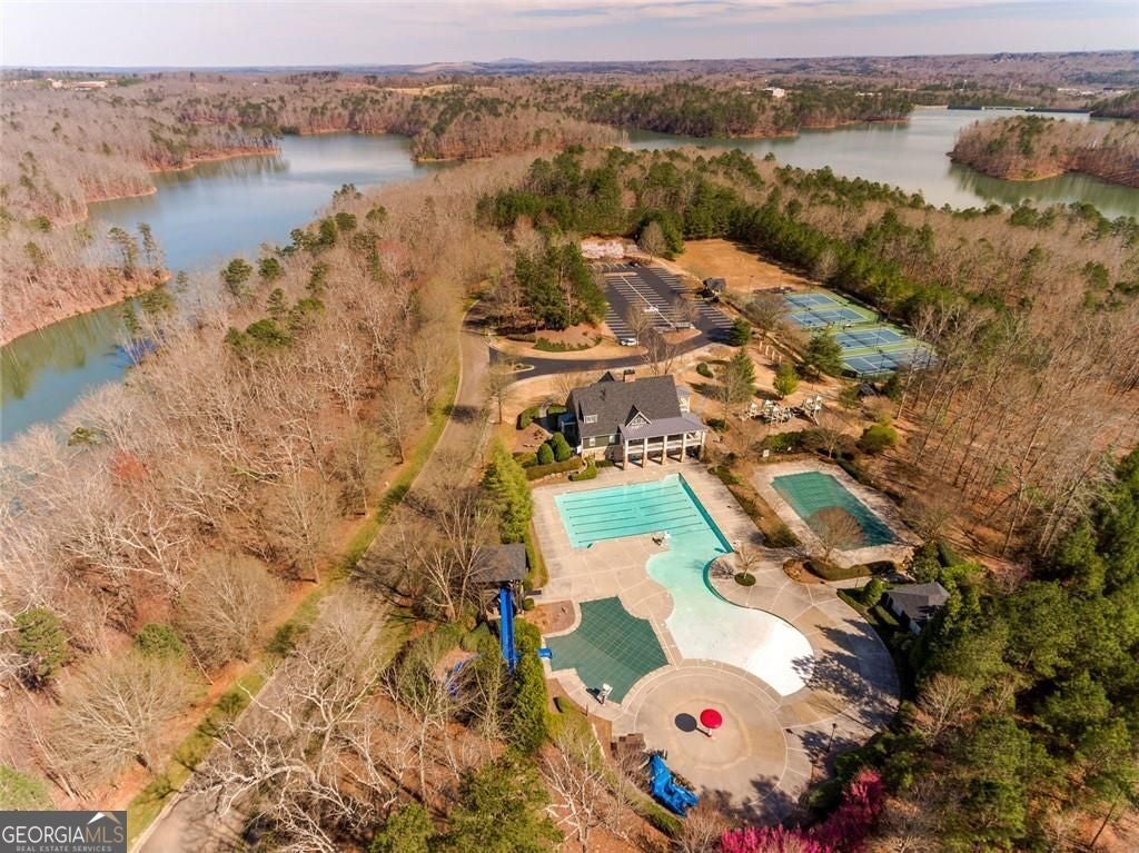 Welcome to Southern Lights in Great Sky-one of Canton's best-kept secrets. Here, you get the feel of North Georgia's natural beauty while staying just minutes from Riverstone Parkway shopping, downtown Canton, and the Mill area. Great Sky truly lives up to its name, offering elevated panoramic views, a scenic lake, mature trees, and miles of sidewalks and nature trails to explore. The amenities are exceptional: a beautiful community center, tennis and pickleball courts, multiple pools, a fun water slide, and a playful water mushroom the kids will love. Plus, the brand-new Cherokee High School is set to open in fall 2026. The home itself is filled with natural light and features an ideal, highly functional floor plan. The primary suite is conveniently located on the main level-along with two additional bedrooms. Upstairs, you'll find a private guest suite, and the terrace level offers another bedroom with its own en-suite bath. Throughout the home are high coffered ceilings, hardwood floors, and well-maintained finishes. A three-car garage, plus a terrace-level workshop with double doors, provides terrific storage and hobby space. Outdoor living is just as inviting, with a flagstone front porch perfect for sunrise views, a main-level deck, and a covered lower deck ideal for entertaining.