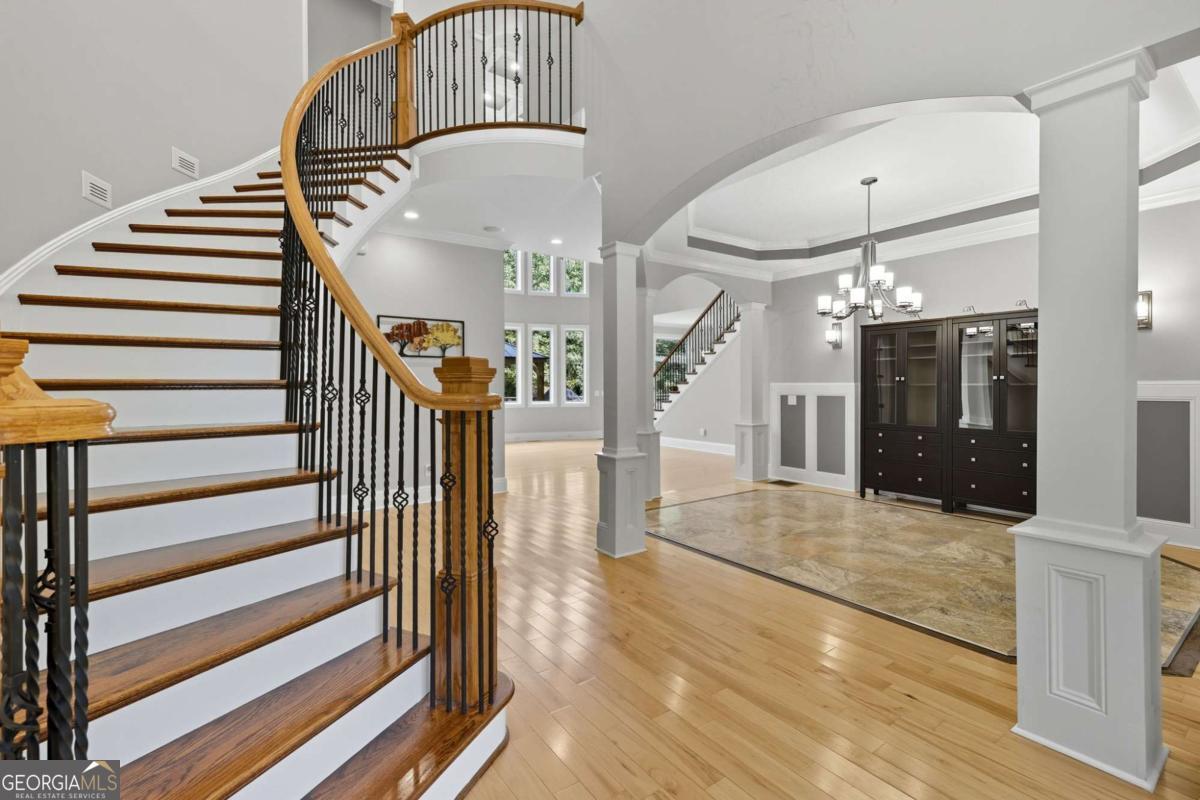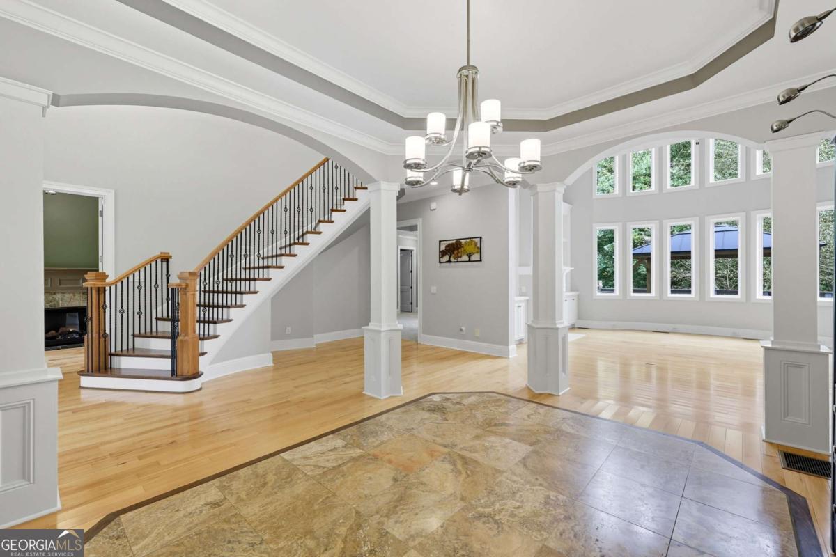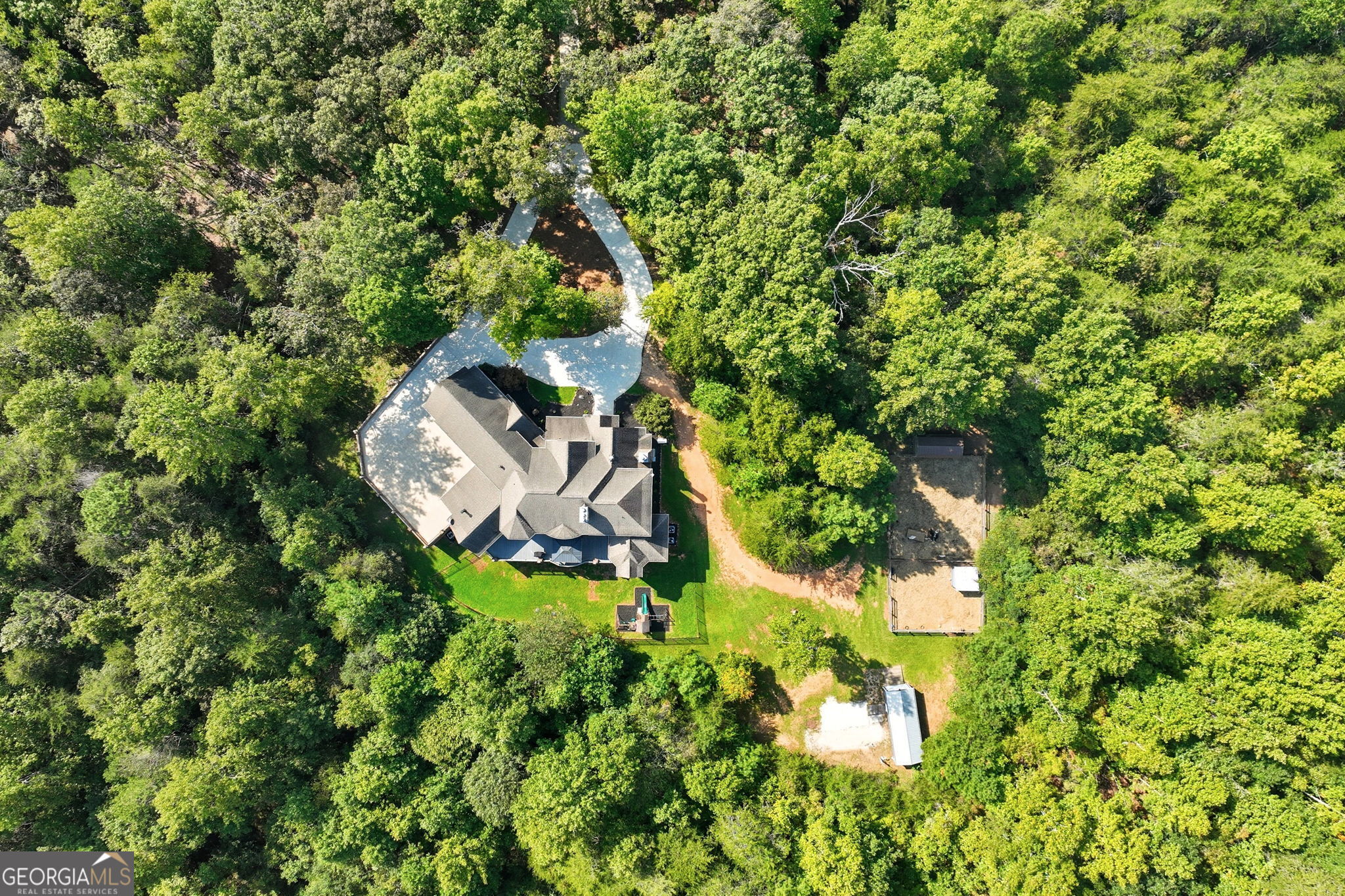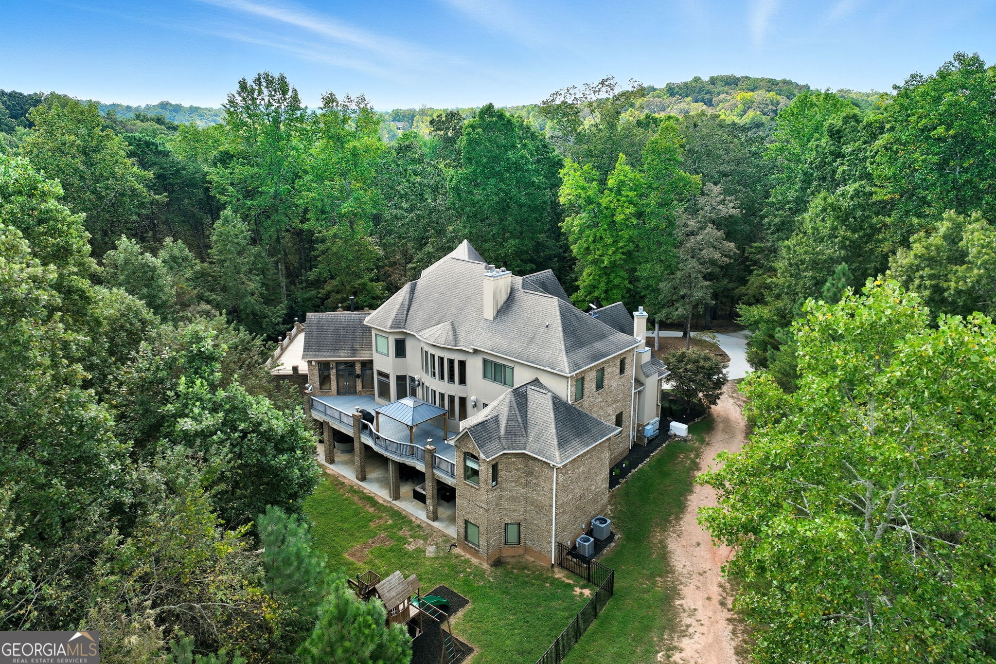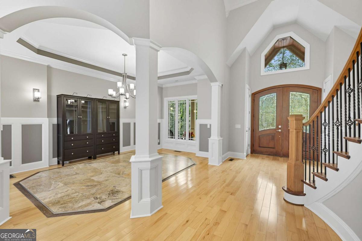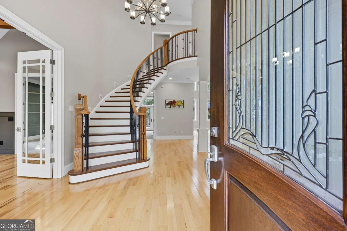 Welcome to your dream estate on the northern end of Lake Lanier and located in Hall County. This exceptional 42 acre property offers unparalleled privacy and endless possibilities, making it a unique find. Here is your opportunity to enjoy 42 acres that borders the Corp of Engineers property of Lake Lanier and access to use the 300+ feet of shoreline, non-dockable, where you can easily launch your paddle boards and canoes for afternoon adventures. The centerpiece of the estate is a stunning 8,103 sq ft custom-built home that was built in 2007. The foyer welcomes you with an open view of the dining room and an invitation to travel up the gently curved staircase or to make your way into the living room, adorned with natural light. Step inside to discover the inviting and airy interior with expansive floor-to-ceiling windows in the living room that cascade the space with natural light, built-in bookcases, and a fireplace. Here you can access the expansive back deck to soak up some sunlight or relax under a covered seating area and enjoy the breeze. As you walk toward the kitchen, the natural wood touches throughout and the detailed cabinetry welcomes you to a spacious kitchen with plenty of room to entertain. Off the kitchen, a keeping room provides a cozy yet sophisticated atmosphere with built-in bookcases, large windows, and another fireplace. Also located on the main level, you will be drawn to an exquisite primary suite complete with a fireplace and spacious en suite with separate custom vanities, a jetted spa tub, and a fully tiled shower. You can access the office/library from the primary suite or the foyer. Move from floor to floor with ease on an elevator, accessing all levels of the home. Upstairs, you will find 3 additional bedrooms and 3 roomy bathrooms, and to complete the upstairs, there is a large flex room and semi-private reading nook. Now, let's head down to the lower level, sit back, and enjoy the movie theater experience with a projector and multi-level seating options, and there's plenty of room for your family gatherings and a designated game room or workspace. Here you also have easy access to the lower patio with endless outdoor seating and entertaining options, a hot tub, and in the fenced backyard, you will find a child's swing set and plenty of room to run, play games, and enjoy. At the gated entrance of this property, there is a fenced area with a small shed for feeding livestock, and near the back of the home, you will find another perfectly fenced area for small livestock to roam, as well as a building complete with power suitable for storing a large RV, off-road vehicles, and mowers. This home is also equipped with a backup generator. Conveniently located just 12 miles from downtown Gainesville, 9 miles from the North Georgia Premium Outlets in Dawsonville, 30 miles from Alpharetta, and 59 miles from Hartsfield-Jackson Atlanta Airport via GA-400, this property allows you to enjoy the peaceful seclusion of nature while still being close to many essential amenities. Whether you're seeking a peaceful retreat, a hobby farm, or an investment opportunity, this property is ready to deliver! Property is under Hall County Timber Conservation until December 2031.