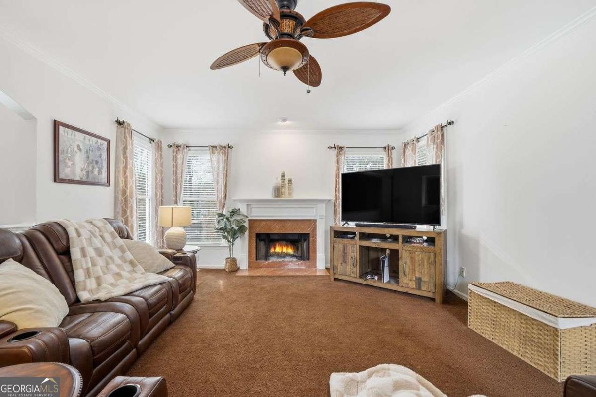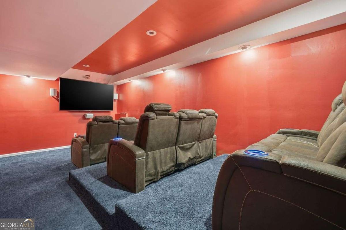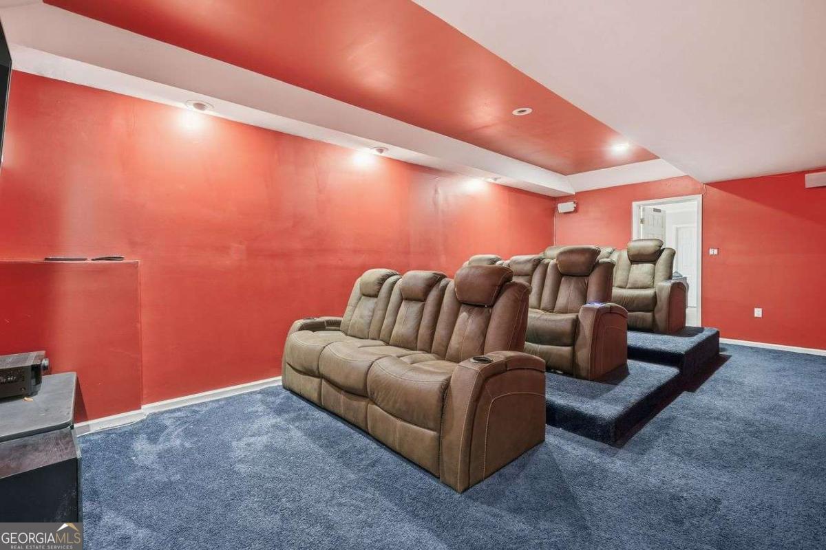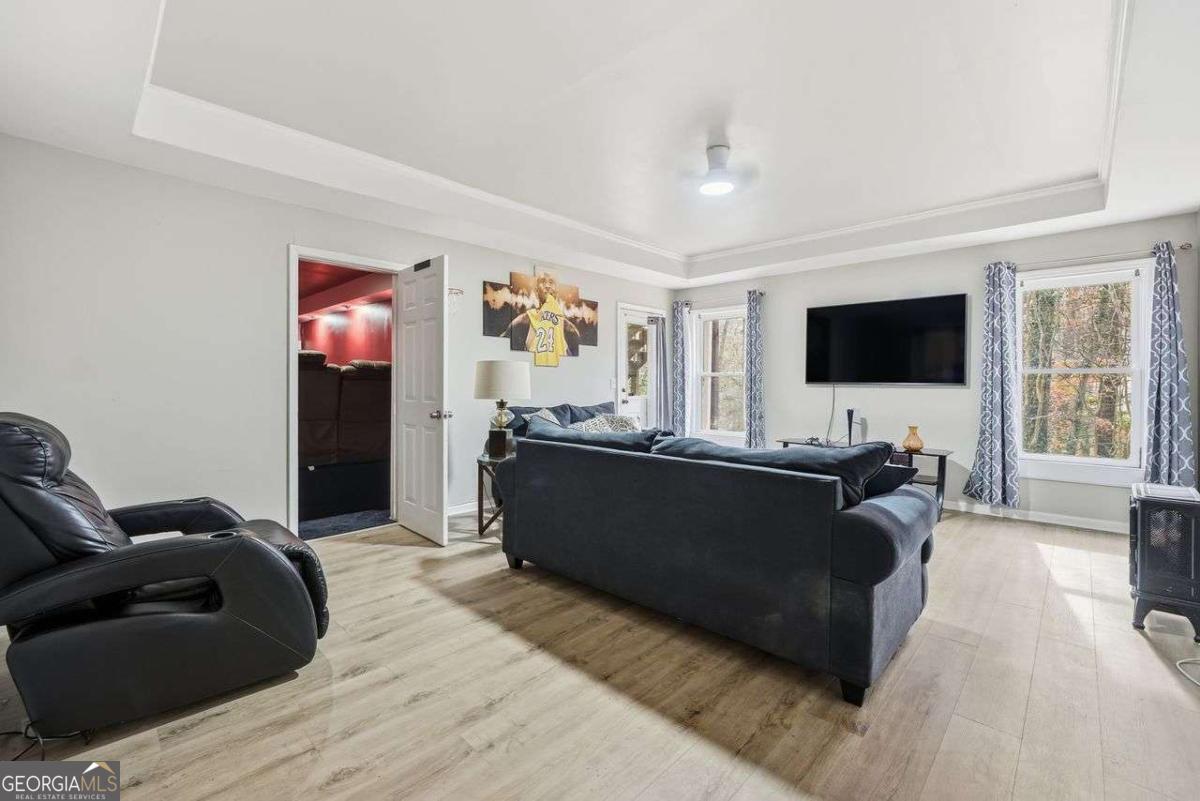 Tucked away at the end of a quiet cul-de-sac in the desirable Lakeside at Waters Edge community, this spacious 6BR/4BA Stone Mountain retreat sits on nearly half an acre with partial lake views and access to resort-style amenities including a lake for fishing, pool, tennis, and a playground. With over 4,600 sq ft, the home features a bright two-story foyer, designated office with bay window, formal dining room, and a welcoming fireside living room. The large kitchen includes an island cooktop, abundant storage, and a breakfast area leading directly to the back deck, perfect for seamless entertaining. The upper level hosts an oversized primary suite with a private fireplace, sitting area, and a generous bath with a separate tub & shower. Additional bedrooms provide excellent comfort and flexibility. The finished daylight basement adds incredible value with a full bath, bedroom, second living room, storage/bonus rooms, and a dedicated media room set up as a home theater-ideal for movie nights, gaming, or a private entertainment space. Updates include new vinyl flooring and fresh interior paint on select areas. Relax on the back deck overlooking the wooded yard and lake, or enjoy the serenity of a cul-de-sac lot with an extended driveway and 2-car garage. A rare opportunity in a beautiful lake community.