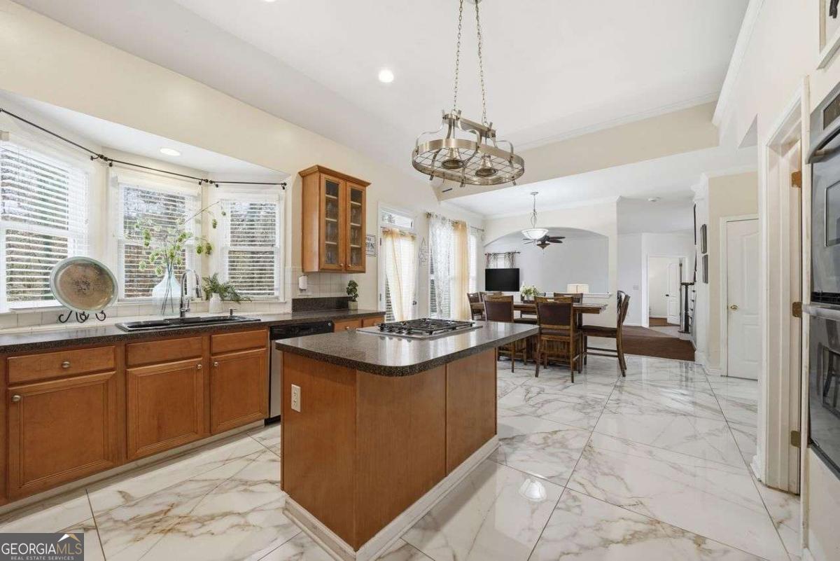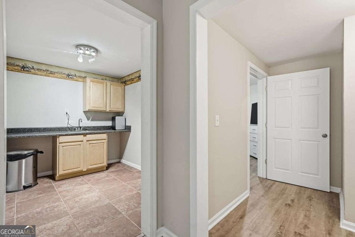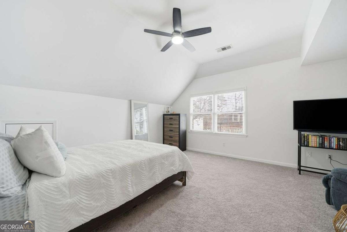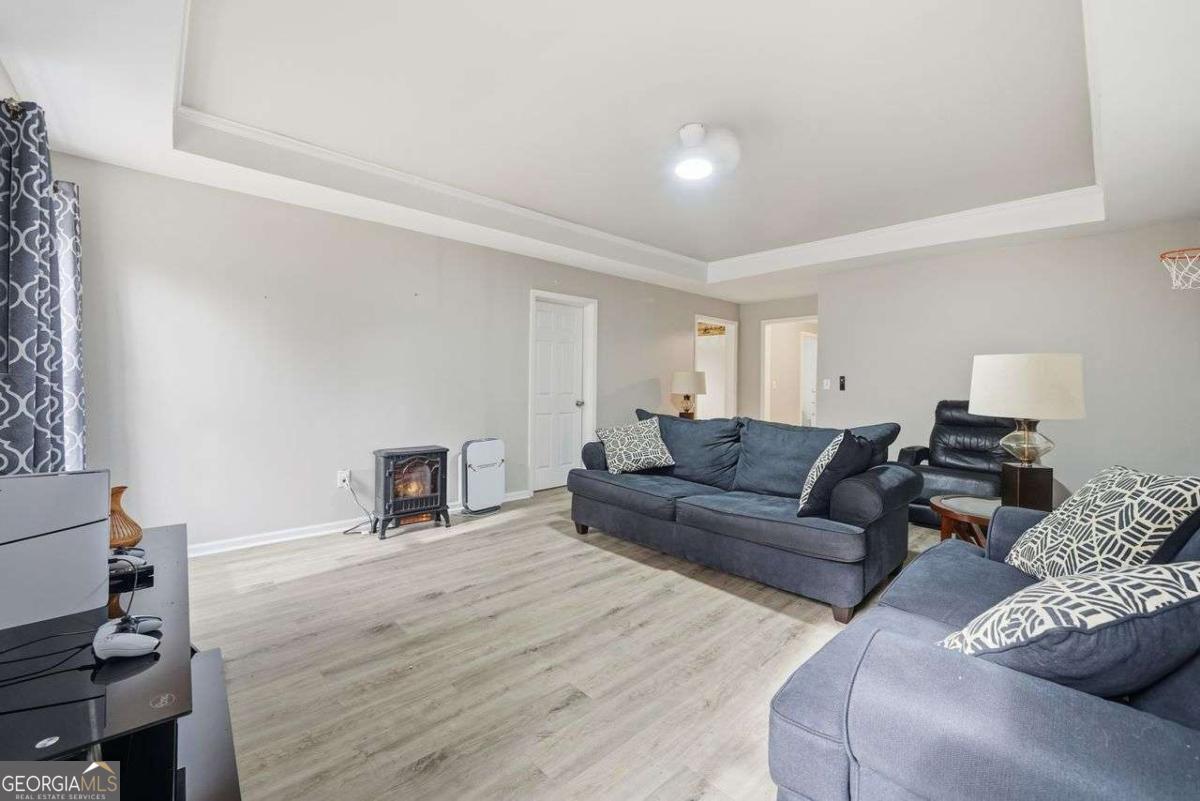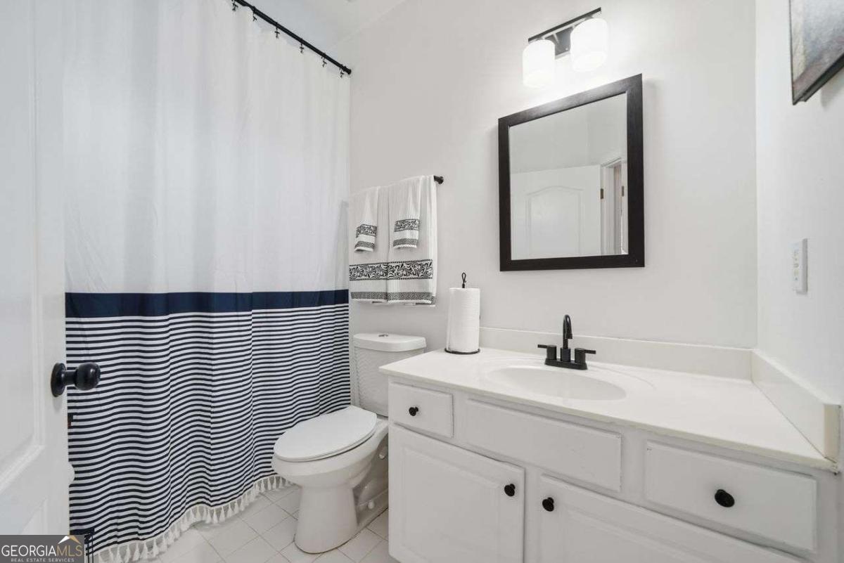 Tucked away at the end of a quiet cul-de-sac in the desirable Lakeside at Waters Edge community, this spacious 6BR/4BA Stone Mountain retreat sits on nearly half an acre with partial lake views and access to resort-style amenities including a lake for fishing, pool, tennis, and a playground. With over 4,600 sq ft, the home features a bright two-story foyer, designated office with bay window, formal dining room, and a welcoming fireside living room. The large kitchen includes an island cooktop, abundant storage, and a breakfast area leading directly to the back deck, perfect for seamless entertaining. The upper level hosts an oversized primary suite with a private fireplace, sitting area, and a generous bath with a separate tub & shower. Additional bedrooms provide excellent comfort and flexibility. The finished daylight basement adds incredible value with a full bath, bedroom, second living room, storage/bonus rooms, and a dedicated media room set up as a home theater-ideal for movie nights, gaming, or a private entertainment space. Updates include new vinyl flooring and fresh interior paint on select areas. Relax on the back deck overlooking the wooded yard and lake, or enjoy the serenity of a cul-de-sac lot with an extended driveway and 2-car garage. A rare opportunity in a beautiful lake community.