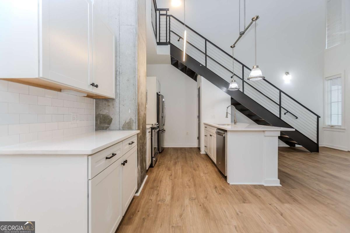 **Luxury living awaits** Experience the ultimate Live-Work-Play lifestyle in this one-of-a-kind 2BR/2BA modern loft in West Midtown's coveted District Lofts. Soaring 22' industrial-chic ceilings, expansive floor-to-ceiling windows, and exposed architectural details set the tone for a space that is both stylish and sophisticated. The open main level features a spacious great room, a sleek kitchen with island, dining area, and a cozy workspace. Step out onto the covered double balcony and enjoy breathtaking southern city skyline views-perfect for relaxing evenings or morning coffee. The main level also offers a generously sized bedroom with city views and an upgraded full bath. Upstairs, the owner's suite impresses with a spa-inspired en-suite with soaking tub and frameless glass shower. Luxury finishes throughout include quartz countertops, soft-close cabinetry, fully tiled baths, stainless-steel appliances, fresh paint, upgraded lighting and fixtures, and bidet toilets. Two gated, assigned parking spaces near the elevator provide unbeatable convenience, and the seller's bonus storage unit on the second floor is an added rarity. Residents enjoy a stylish lobby, glass-enclosed conference room, and discounts to Atlantic Station shops and dining. Located in the heart of West Midtown/Atlantic Station-just steps from premier shopping, dining, entertainment, public transit, and fitness options-this home is minutes from Georgia Tech, GA State, I-75/I-85, major venues, and only 11.6 miles from Atlanta Airport.