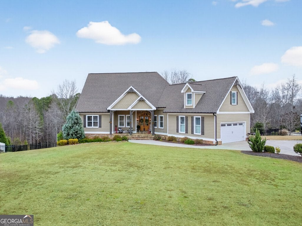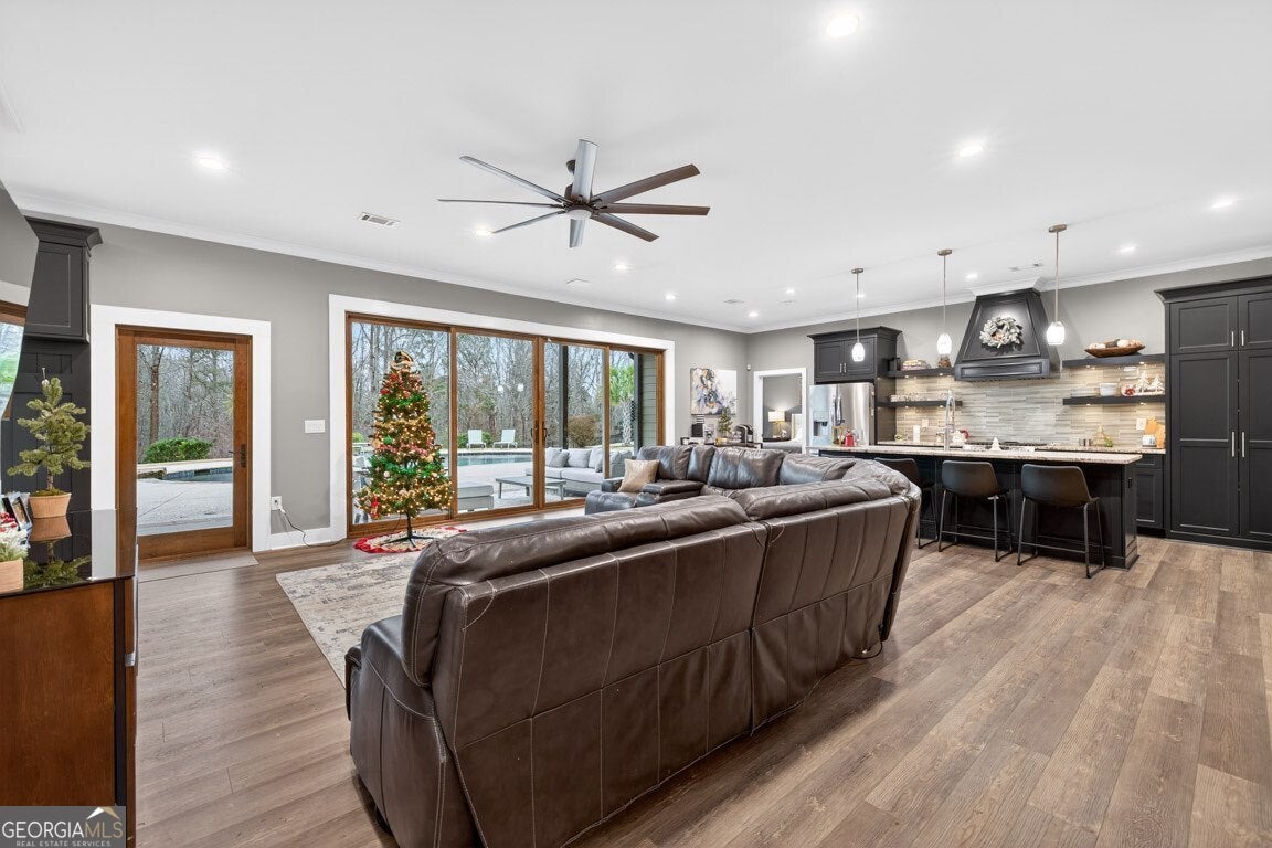Discover this exceptional ranch home on almost 2.5 private, fenced-in acres with no HOA, offering resort-style living, elegant finishes, and an ideal Flowery Branch location. This property features a welcoming rocking-chair front porch, high ceilings throughout, and an open, functional layout on the main level. Inside, you will find gleaming hardwood floors, a spacious primary suite with an elegant spa-style bath, an open dining room, a private office, and a family room with a stack-stone fireplace. The kitchen opens seamlessly to the family room, creating an effortless flow for everyday living and entertaining. Two secondary bedrooms share a convenient Jack-and-Jill bath, and the home includes a teen suite upstairs with a private full bath. Outdoor living is outstanding, featuring a saltwater pool with spa and waterfall, a covered back porch, and a full outdoor kitchen overlooking your peaceful acreage. The finished terrace level offers 10-foot ceilings and a complete secondary living space, including a full kitchen, a glass-wall luxury wine room with industrial wine cooler, a media/theater room, an additional bedroom, a full bath, and flexible entertaining areas. With three kitchens total (main level, terrace level, and outdoor kitchen), the home provides unmatched versatility. Additional upgrades include a central vacuum system, two laundry rooms (main level and terrace level), abundant storage, and a fully fenced backyard. This home combines privacy, acreage, and luxury amenities rarely found together.