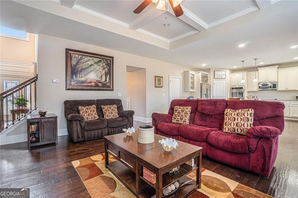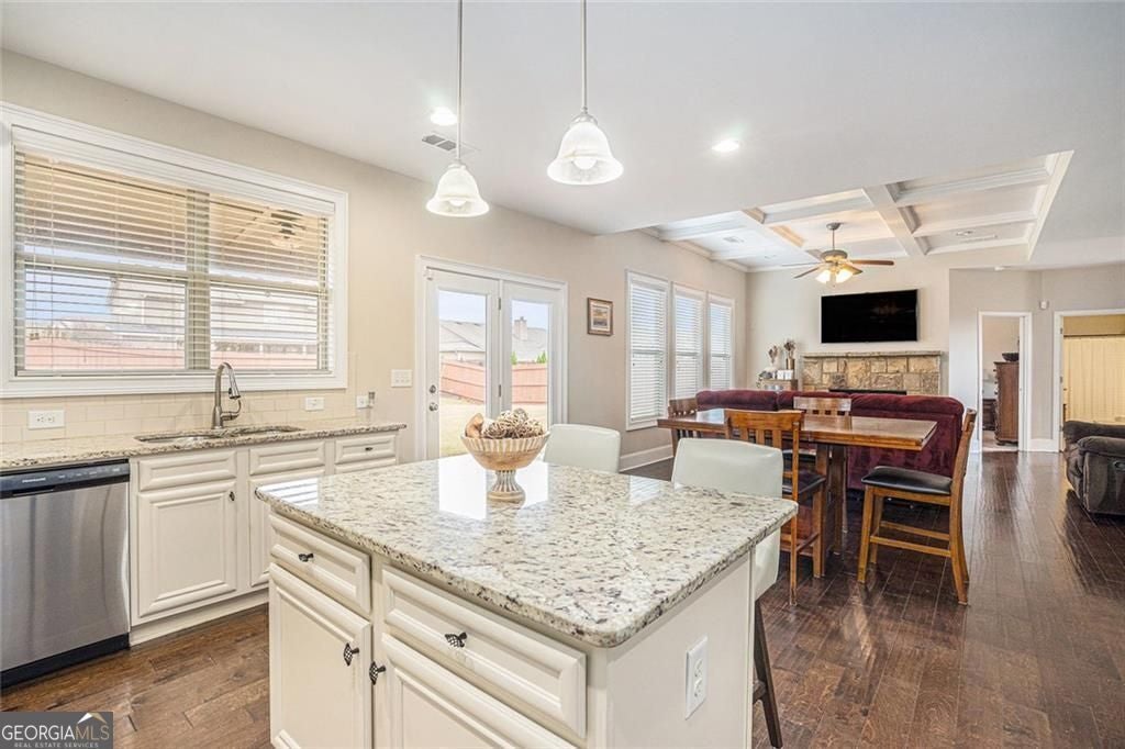 Welcome to this Wildflower Park Beauty! This 5-bedroom, 3-bath home offers space, style, and lifestyle in one perfect package. A brick front and welcoming front porch set the tone, while the three-car garage with an EV Vehicle charger add practical luxury. Step inside to coffered ceilings, LVP floors, and a stone fireplace that instantly draws the eye. The gourmet kitchen features double ovens, granite counters, stainless appliances, and a large island for cooking and entertaining. A main-level bedroom and bath provide private accommodations for guests or multigenerational living, and a flex/office space supports work-from-home or creative needs. Upstairs, a loft adds versatile living space, and the spacious primary suite boasts a spa-inspired bath, soaking tub, separate large shower, double vanity and daylight walk-in closet. Three additional bedrooms and a full bath complete the upper level. Enjoy the outdoors on the covered patio or explore the community with swim, tennis, pickleball amenities and direct trail access to Mulberry Park. Conveniently located near shopping, Mall of GA, Exchange at Gwinnett, Top Golf, Chateau Elan Winery and easy access to I-85 and 316, this home blends comfort, convenience, and recreation. This move-in-ready home is perfect for move-up buyers, multigenerational families, or anyone wanting space to live, work, and play.