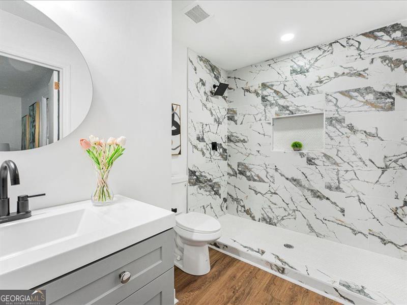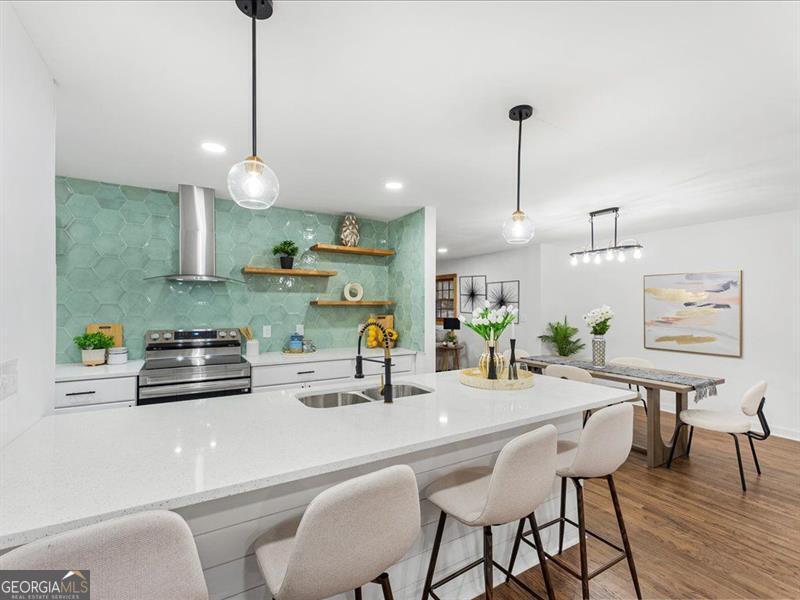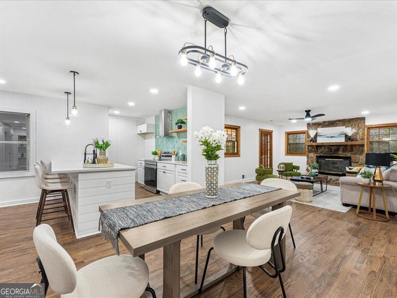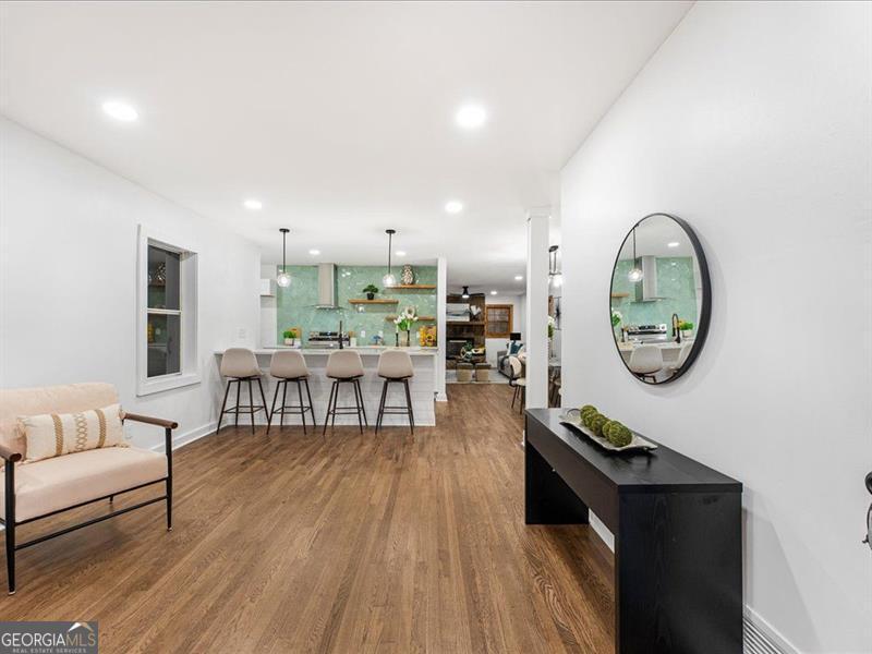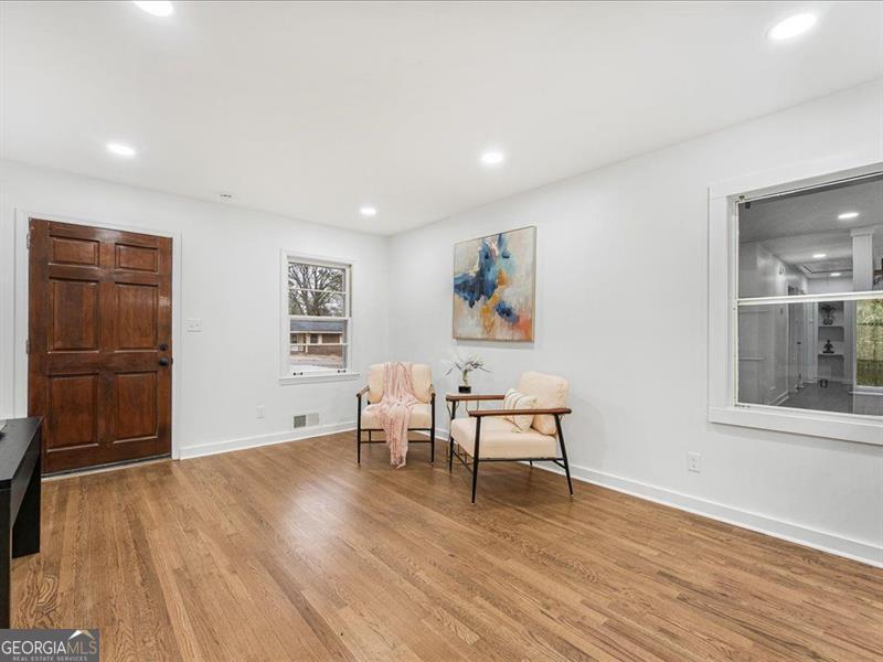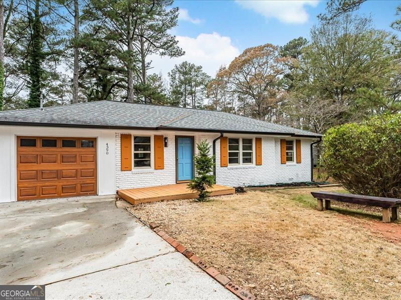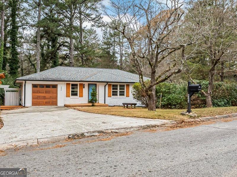 Location, location, location! This cozy ranch-style home offers 3 bedrooms and 2 bathrooms with an inviting open-concept layout. The modern kitchen features quartz countertops, a beautiful glass tile backsplash, and an extended island perfect for seating. Enjoy hardwood floors throughout, a charming stone fireplace, and a bonus room ideal for an office or additional bedroom. The home also includes a fairly new roof, a private backyard ready for your final touches, a one-car garage, and a newly built pergola. A separate backyard structure provides excellent storage or the potential for a guest room. Conveniently located near the East-West Connector, close to major shopping areas, and offering easy access to I-285, this home truly has it all!