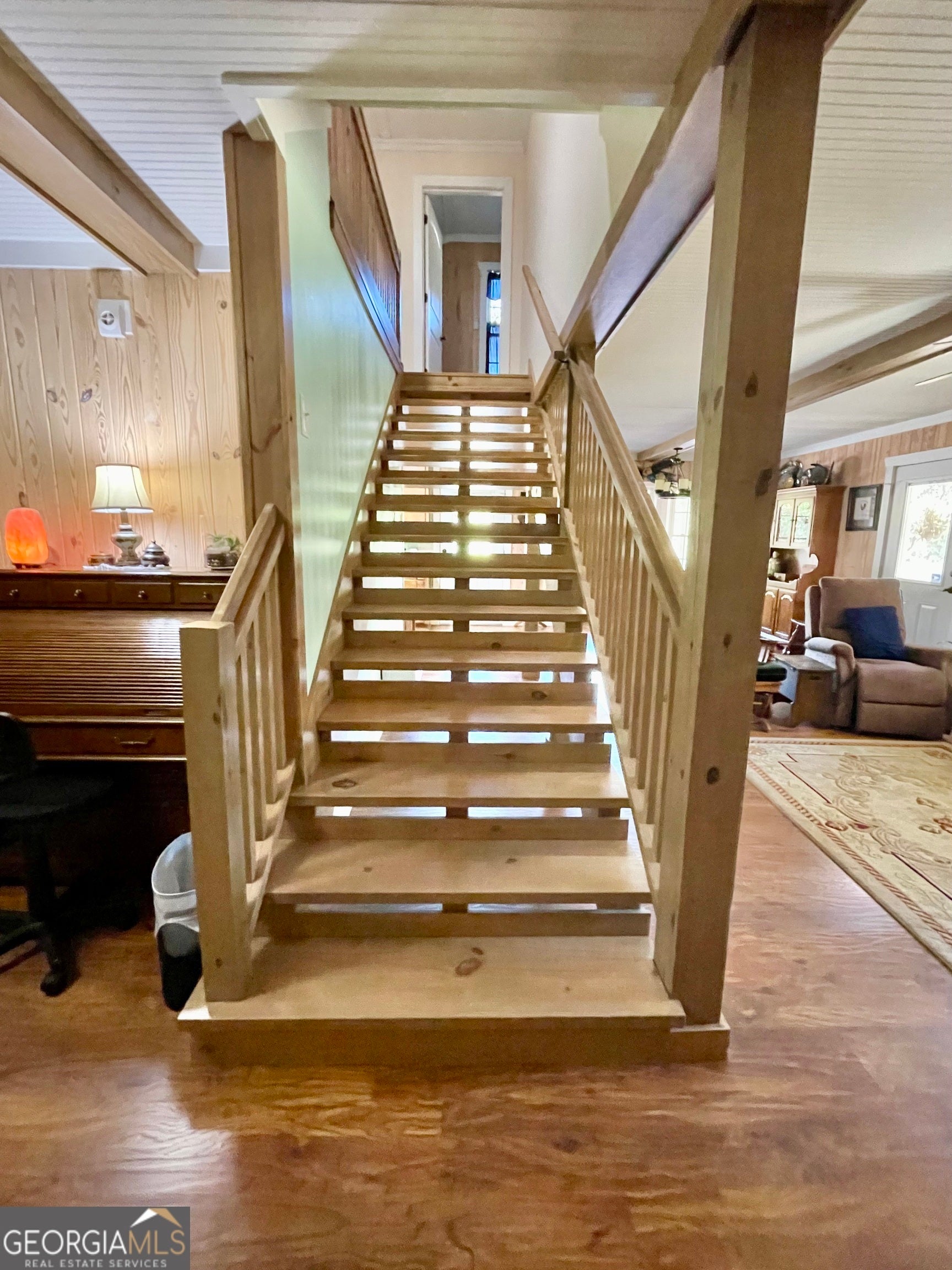 Step into this charming 3-bedroom, 2.5-bath home tucked away on a peaceful cul-de-sac, offering over 2,000 sq ft of inviting living space on a beautiful 1-acre lot. Inside, you'll find updated floors and rich wood paneling throughout, adding warmth and character in every corner. The kitchen features abundant cabinet space, all appliances included, and a cozy breakfast area overlooking the backyard. The primary suite is conveniently located on the main floor and offers a full bath with handicap-accessible features for added comfort. The spacious living room is filled with natural light and showcases beamed ceilings and a fireplace perfect for relaxing evenings. Just off the living area is a dedicated study/office-ideal for working from home or managing daily tasks. Upstairs, you'll find two generously sized bedrooms and a full bath. The finished basement provides even more flexibility, whether you need an additional living space, exercise room, playroom, or hobby area. Surrounded by mature trees, the backyard feels like a private retreat. A fenced-in area adds the perfect setup for pets to play freely. This beautiful home has so much to offer-you won't want to miss it!