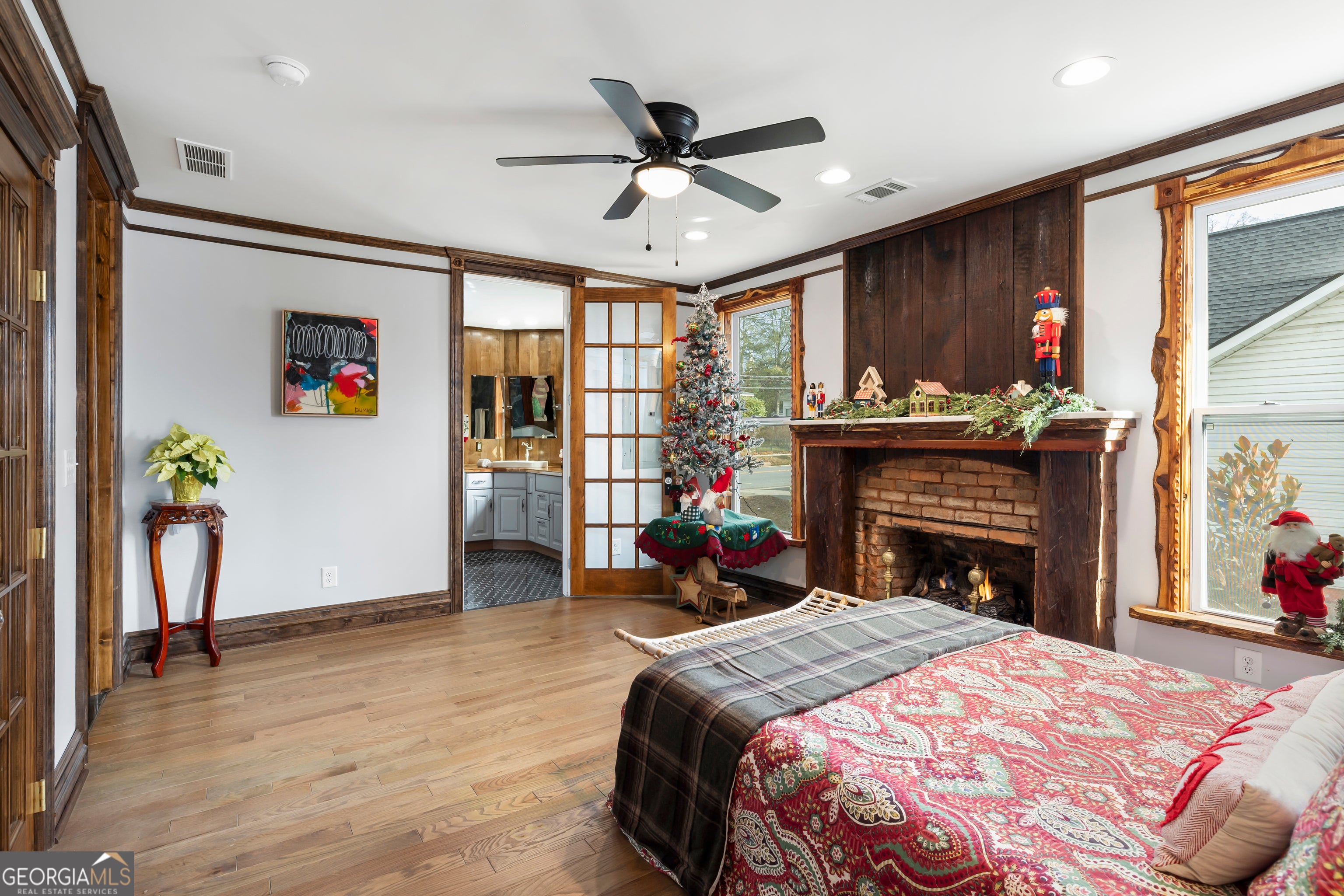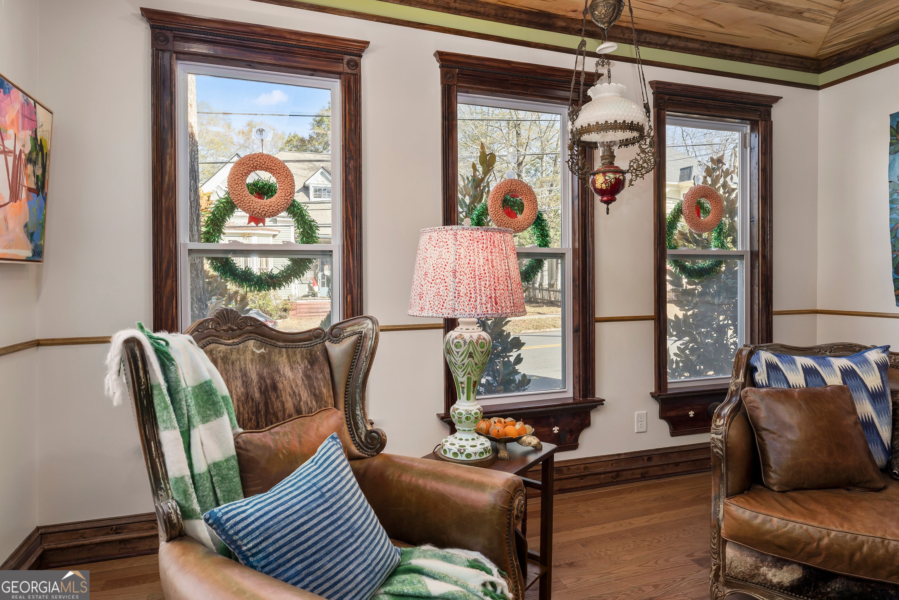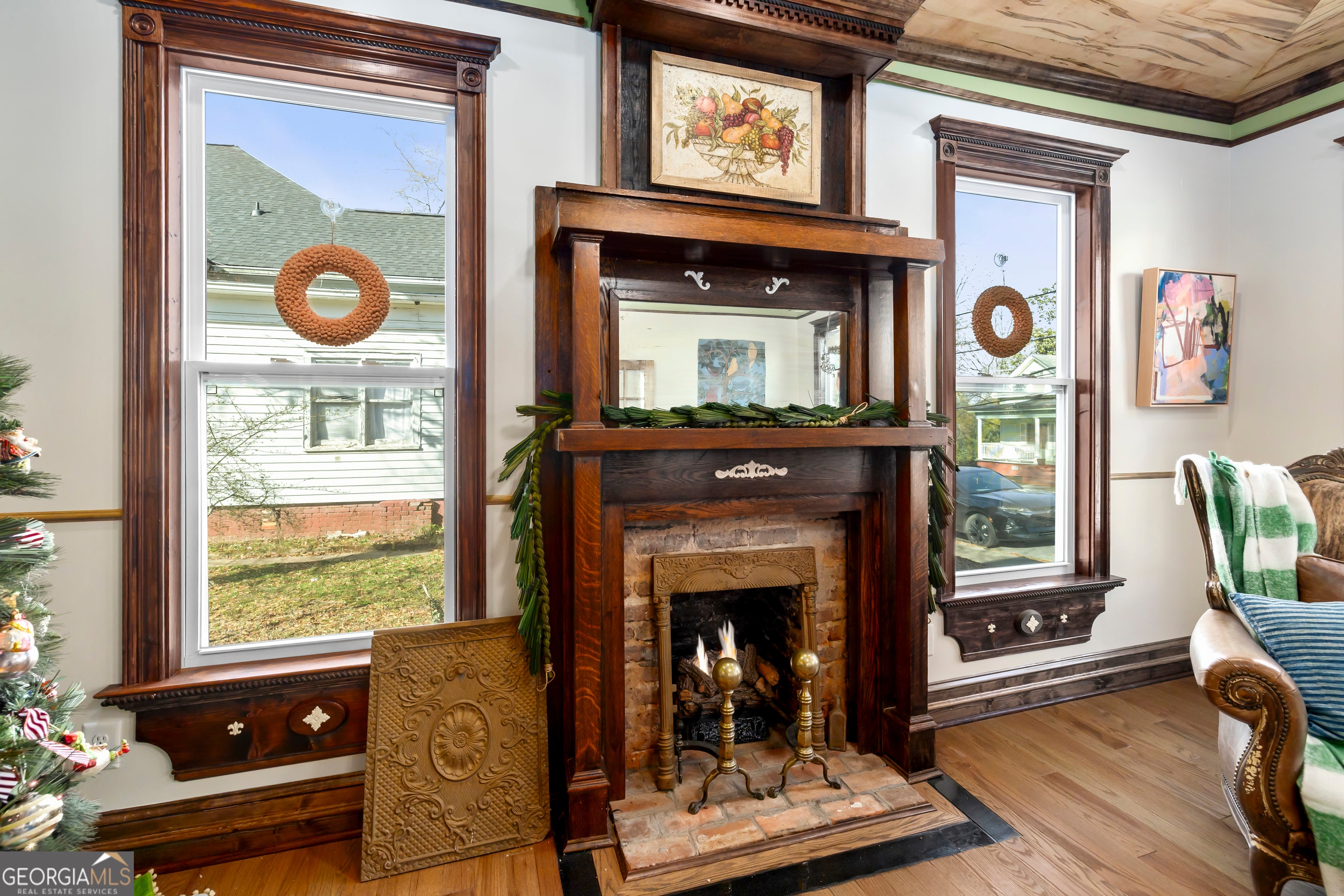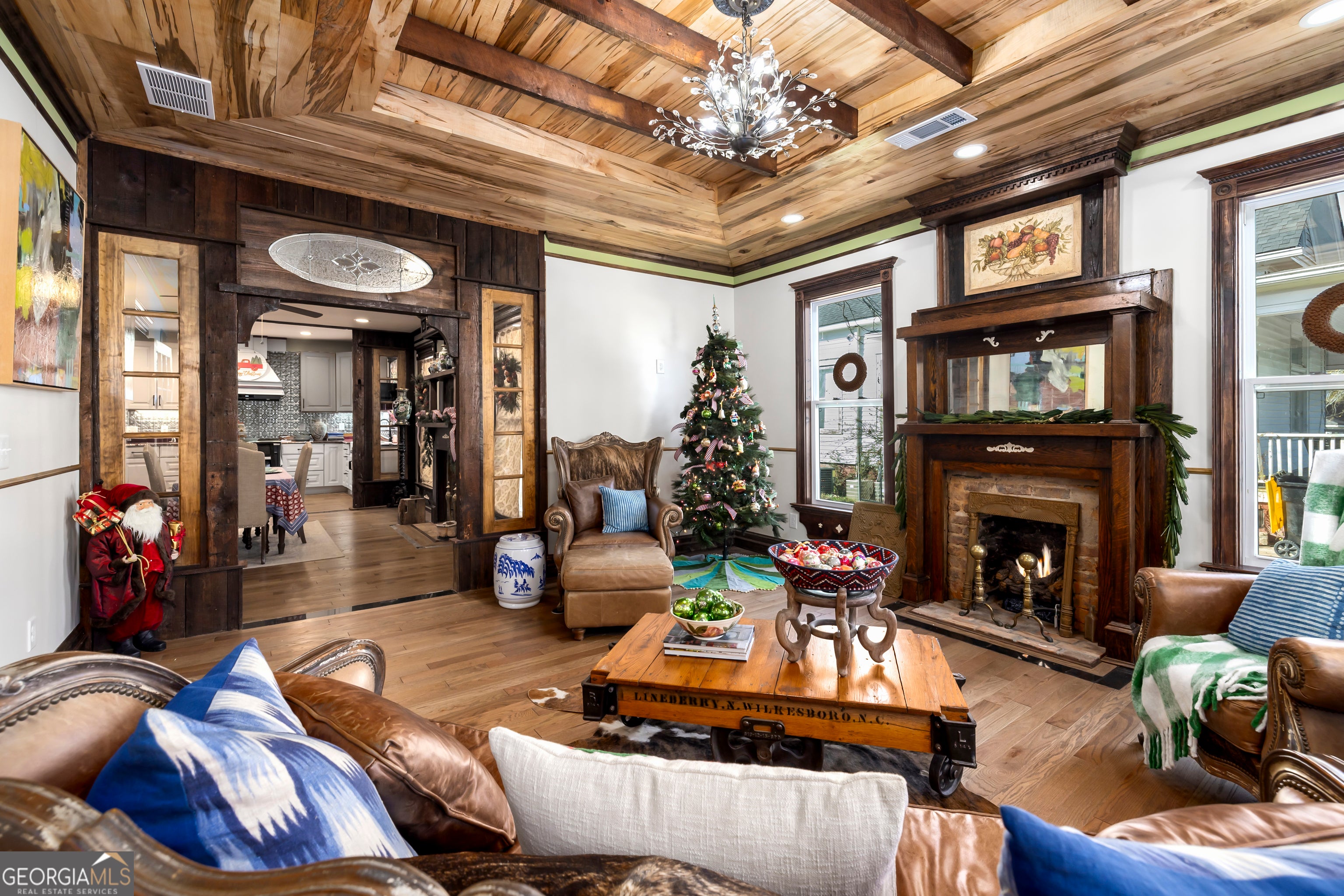 Don't let the holiday glow distract you-68 Spring Street deserves your full attention. Approaching this restored historic home, you'll immediately notice its truly bespoke finishes: Purple Heart lumber, faded onyx tile, and three reclaimed 1880s mantles with documented local provenance. Set along one of the southernmost corridors of the downtown historic district, the home is believed to date to around 1880, during Newnan's second settlement period. With only a few recorded owners since 1985, it has just completed a meticulous multi-year restoration that blends artisan craftsmanship with carefully preserved historic elements. The front porch welcomes you with custom French doors, cedar shakes, an 1880s solid-wood twin post, and the original tongue-and-groove ceiling. Inside, the foyer presents custom Judge's paneling, detailed trim, and a whimsical emerald duck centerpiece. To the left, a bright bath features mirror-finish blue tile, an angled vanity, a marble-accented clawfoot tub, and sweeping neighborhood views. To the right, the living room boasts a hand-carved Wormwood Maple ceiling, bold crown molding, ivory medallion drapery, and chair railing leading to the first 1880s mantle equipped with an instant-fire feature. This warm space leads naturally into the kitchen and dining areas. Hand-hewn logs and a scalloped glass insert frame the dining room, centered around a faded onyx focal point. The kitchen showcases African Purple Heart lumber countertops milled in Concord, GA, finished with multiple coats of marine-grade resin. Matching custom shelving, stainless KitchenAid appliances, soft-close cabinetry with industrial hardware, and a dual-bay butcher's sink complete the space. Behind the kitchen, a bath features faded onyx tile, a curved-top glass shower panel, a pedestal sink, and faceted crystal lighting. The adjacent laundry area is filled with natural light from four windows and includes wrought-iron shelving and a mini pedestal sink. A marble-lined room awaits next, with hand-lathed wormwood beams, exposed rafters, and an etched light fixture-plus access to an Ipe deck with hand-milled balusters. Past this room lies an additional bedroom or living space distinguished by its sweeping curved window frames. Every window in the home has custom, one-of-a-kind trim work. The owner's suite offers another fireplace and a cedar-lined double-door closet. Its en-suite bath includes a vessel tub with a custom glass partition and a natural wood vanity rising from inky blue tile and hand-cut moldings. Your tour concludes where it began, greeted once more by the carved emerald duck-a fitting symbol for this "Woodsman's Cottage," where storybook finishes and dedicated craftsmanship bring the home to life. Please inquire for further details. Shown by appointment only.