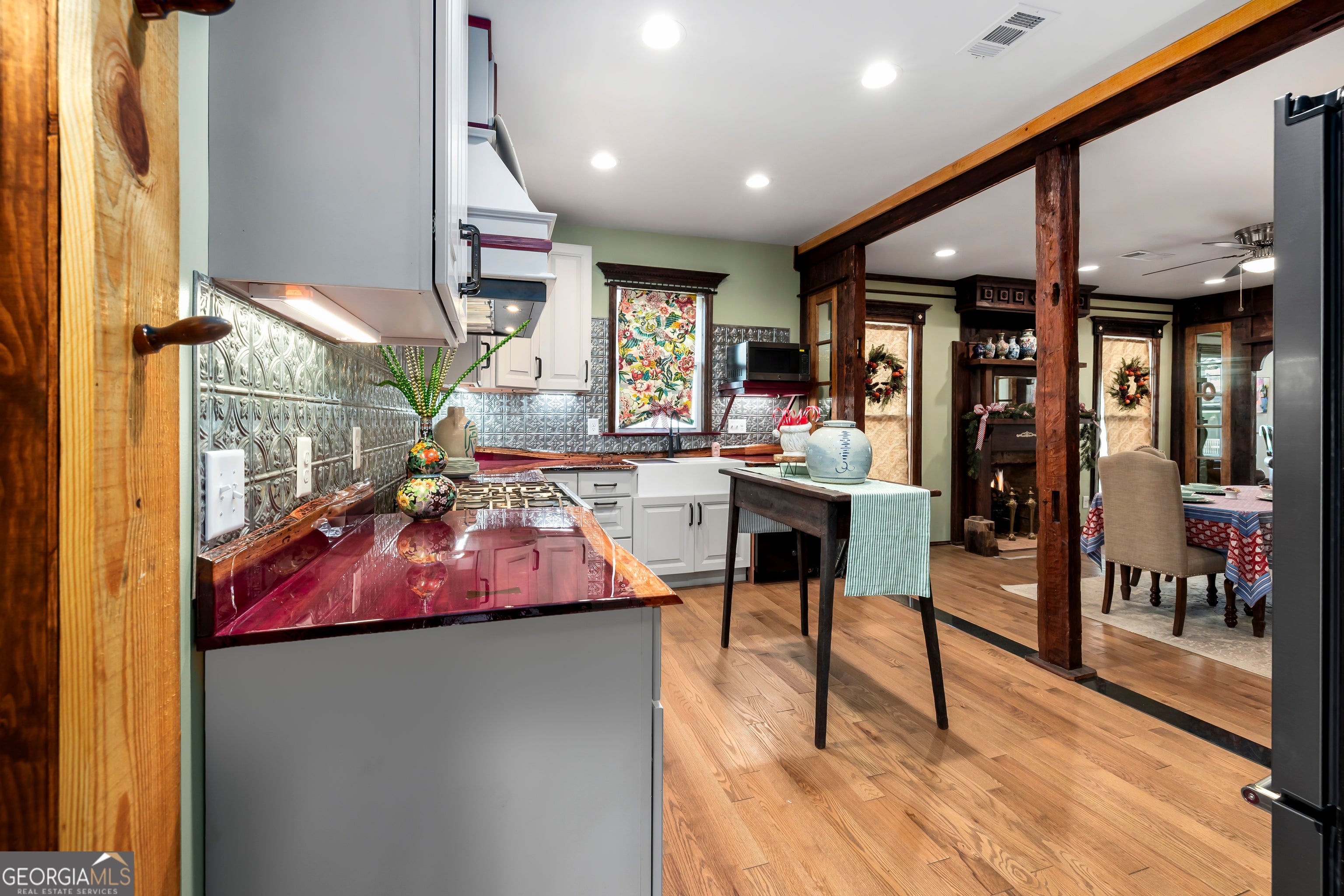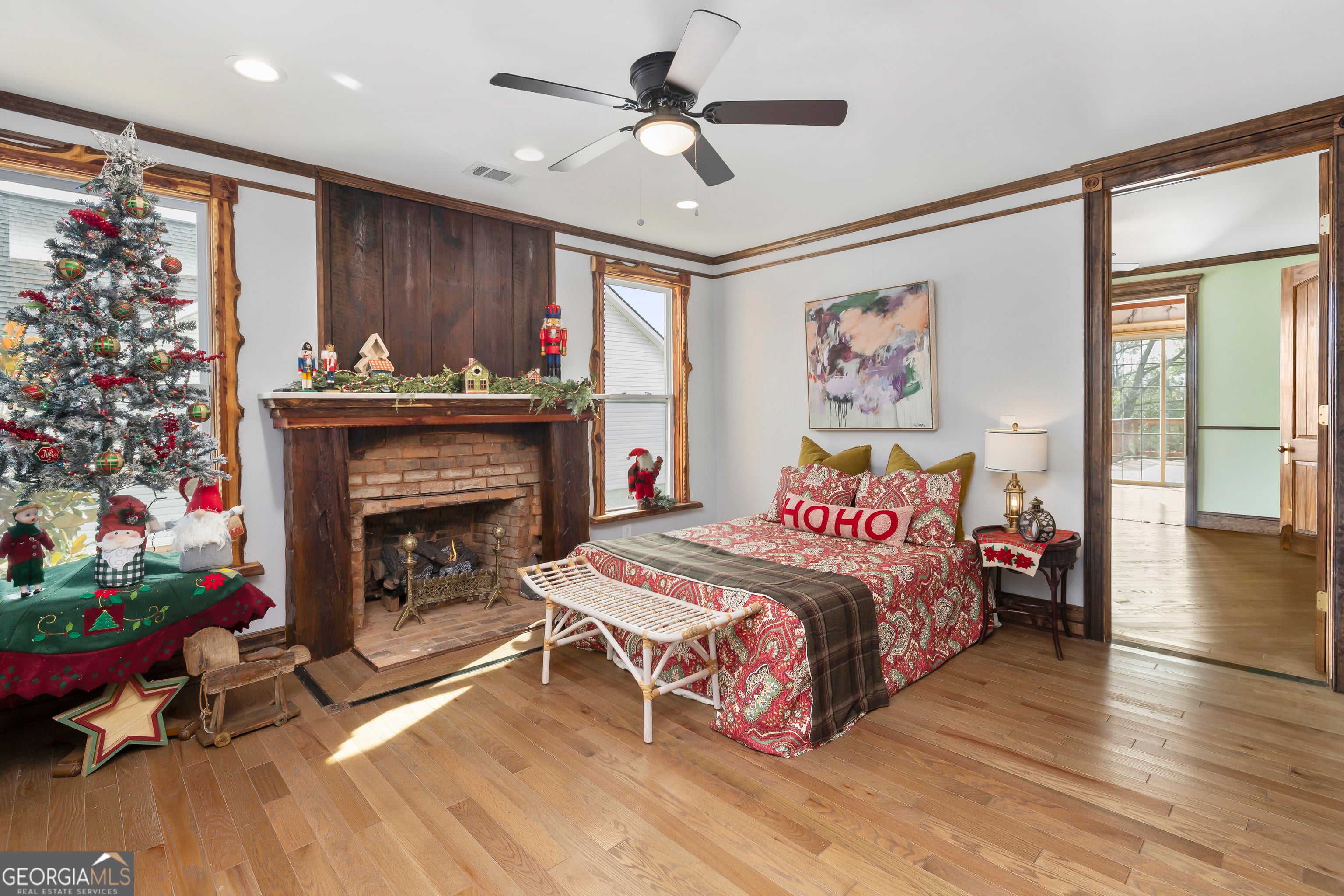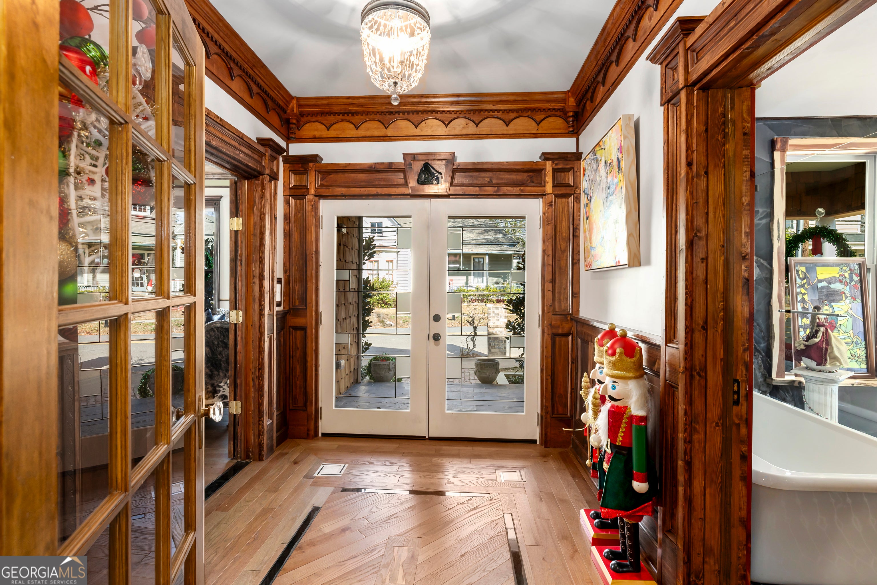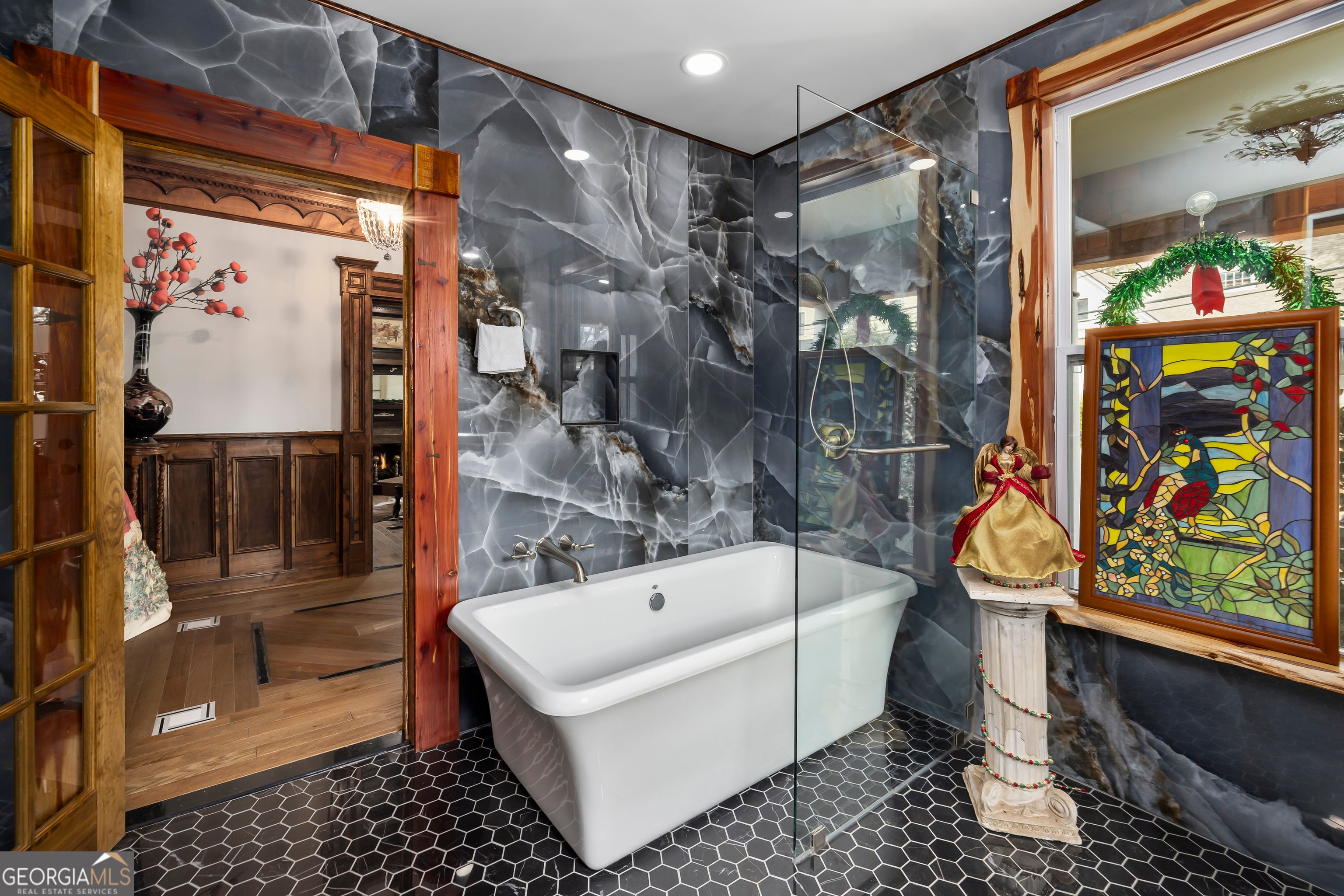 Don't let the holiday glow distract you-68 Spring Street deserves your full attention. Approaching this restored historic home, you'll immediately notice its truly bespoke finishes: Purple Heart lumber, faded onyx tile, and three reclaimed 1880s mantles with documented local provenance. Set along one of the southernmost corridors of the downtown historic district, the home is believed to date to around 1880, during Newnan's second settlement period. With only a few recorded owners since 1985, it has just completed a meticulous multi-year restoration that blends artisan craftsmanship with carefully preserved historic elements. The front porch welcomes you with custom French doors, cedar shakes, an 1880s solid-wood twin post, and the original tongue-and-groove ceiling. Inside, the foyer presents custom Judge's paneling, detailed trim, and a whimsical emerald duck centerpiece. To the left, a bright bath features mirror-finish blue tile, an angled vanity, a marble-accented clawfoot tub, and sweeping neighborhood views. To the right, the living room boasts a hand-carved Wormwood Maple ceiling, bold crown molding, ivory medallion drapery, and chair railing leading to the first 1880s mantle equipped with an instant-fire feature. This warm space leads naturally into the kitchen and dining areas. Hand-hewn logs and a scalloped glass insert frame the dining room, centered around a faded onyx focal point. The kitchen showcases African Purple Heart lumber countertops milled in Concord, GA, finished with multiple coats of marine-grade resin. Matching custom shelving, stainless KitchenAid appliances, soft-close cabinetry with industrial hardware, and a dual-bay butcher's sink complete the space. Behind the kitchen, a bath features faded onyx tile, a curved-top glass shower panel, a pedestal sink, and faceted crystal lighting. The adjacent laundry area is filled with natural light from four windows and includes wrought-iron shelving and a mini pedestal sink. A marble-lined room awaits next, with hand-lathed wormwood beams, exposed rafters, and an etched light fixture-plus access to an Ipe deck with hand-milled balusters. Past this room lies an additional bedroom or living space distinguished by its sweeping curved window frames. Every window in the home has custom, one-of-a-kind trim work. The owner's suite offers another fireplace and a cedar-lined double-door closet. Its en-suite bath includes a vessel tub with a custom glass partition and a natural wood vanity rising from inky blue tile and hand-cut moldings. Your tour concludes where it began, greeted once more by the carved emerald duck-a fitting symbol for this "Woodsman's Cottage," where storybook finishes and dedicated craftsmanship bring the home to life. Please inquire for further details. Shown by appointment only.