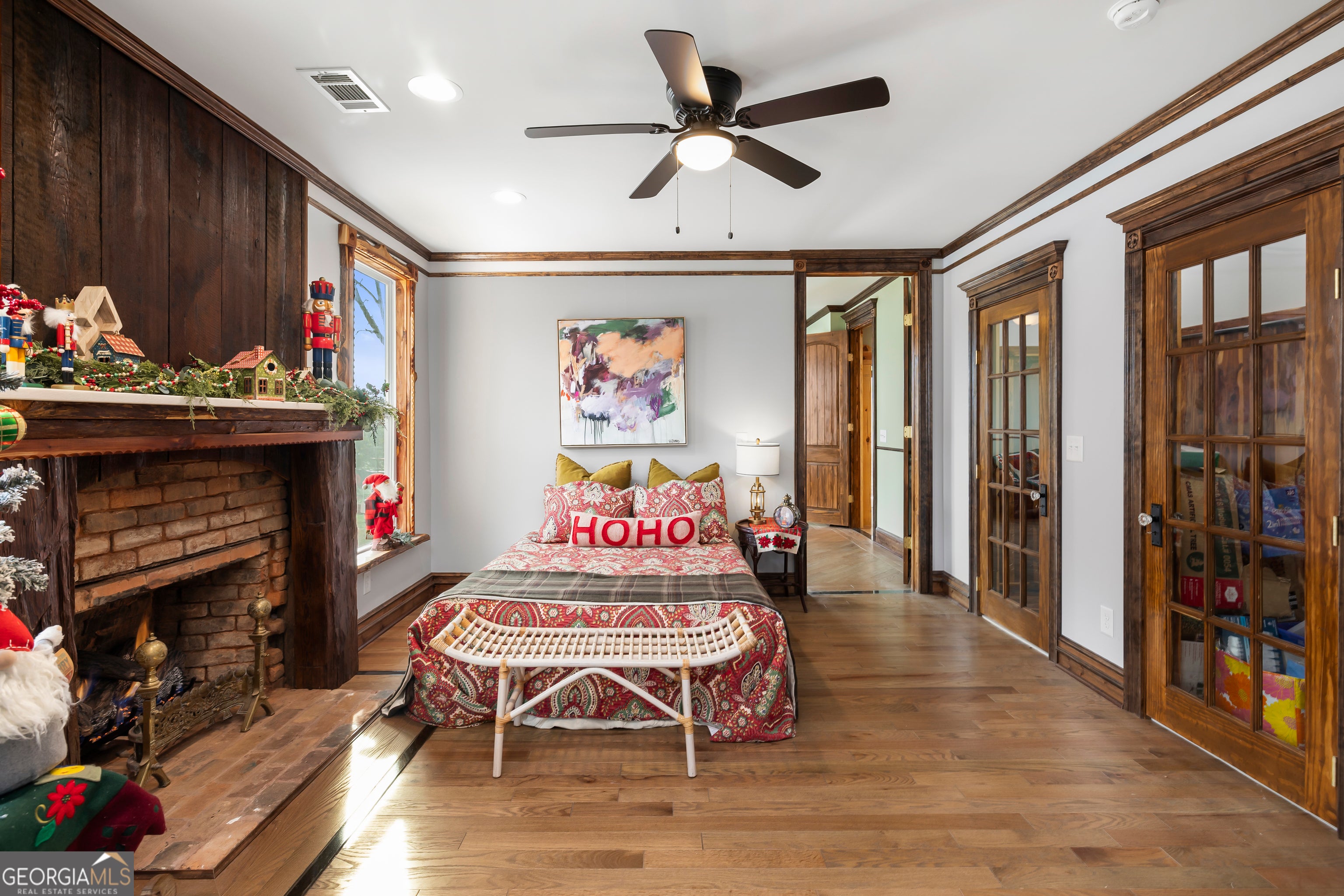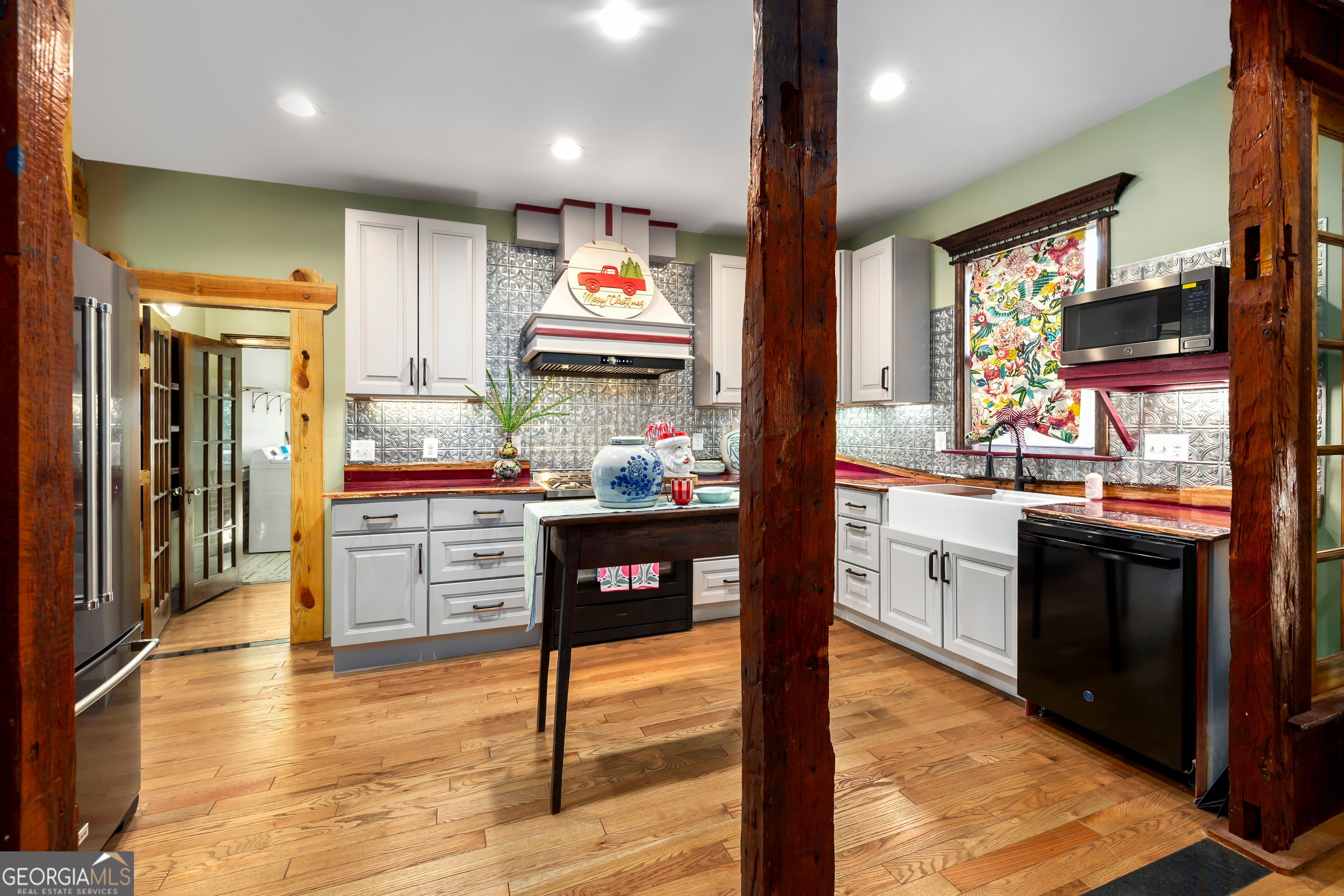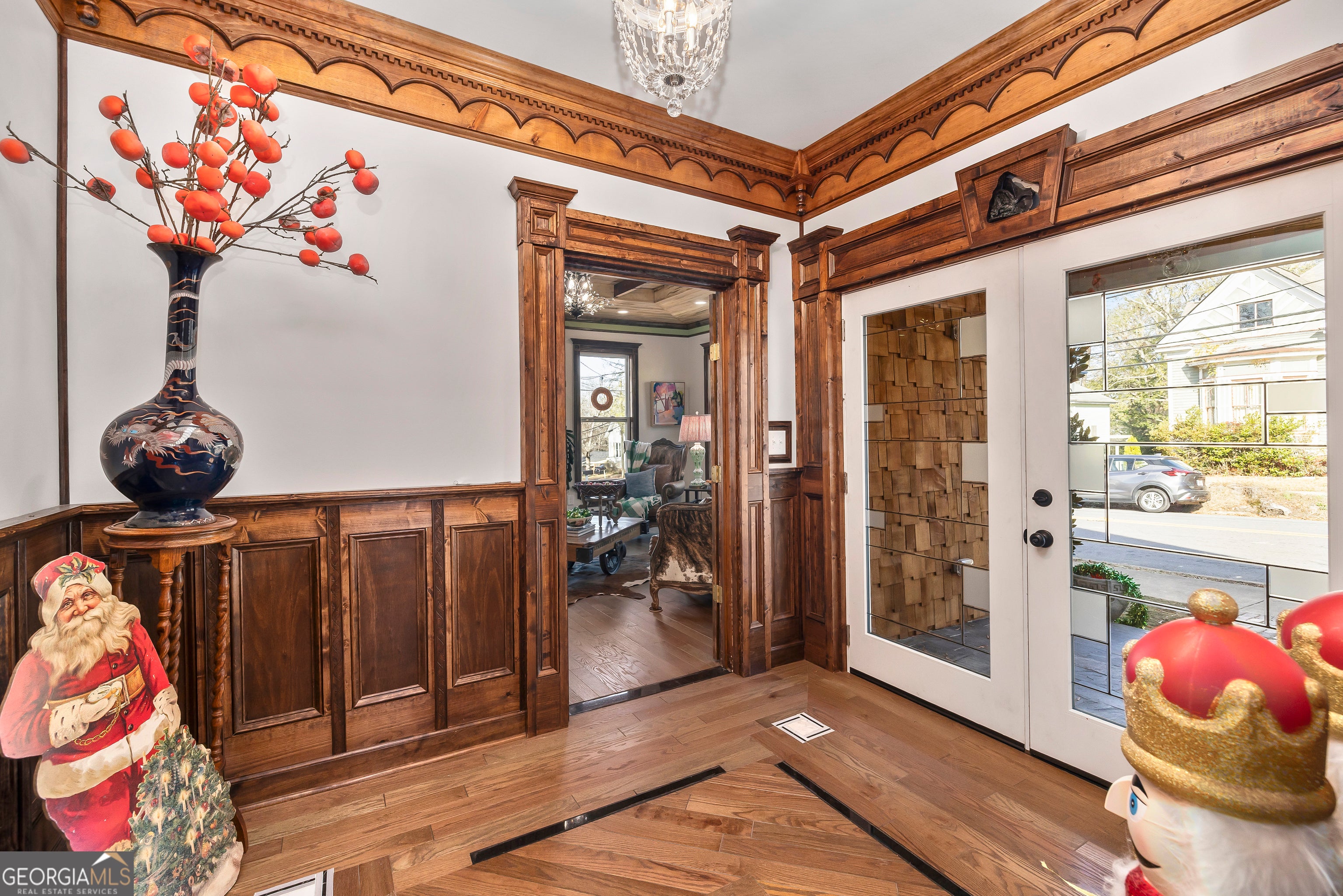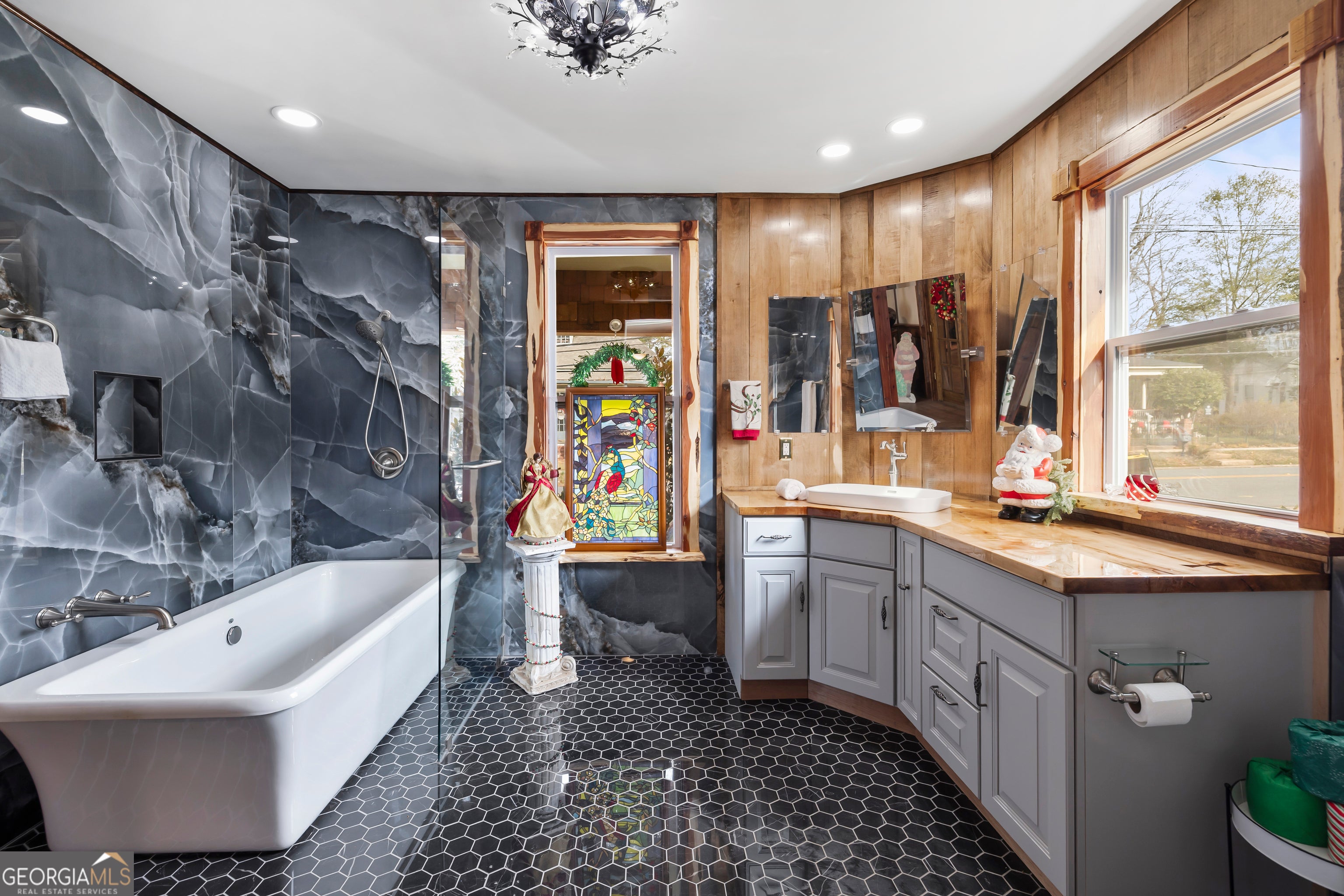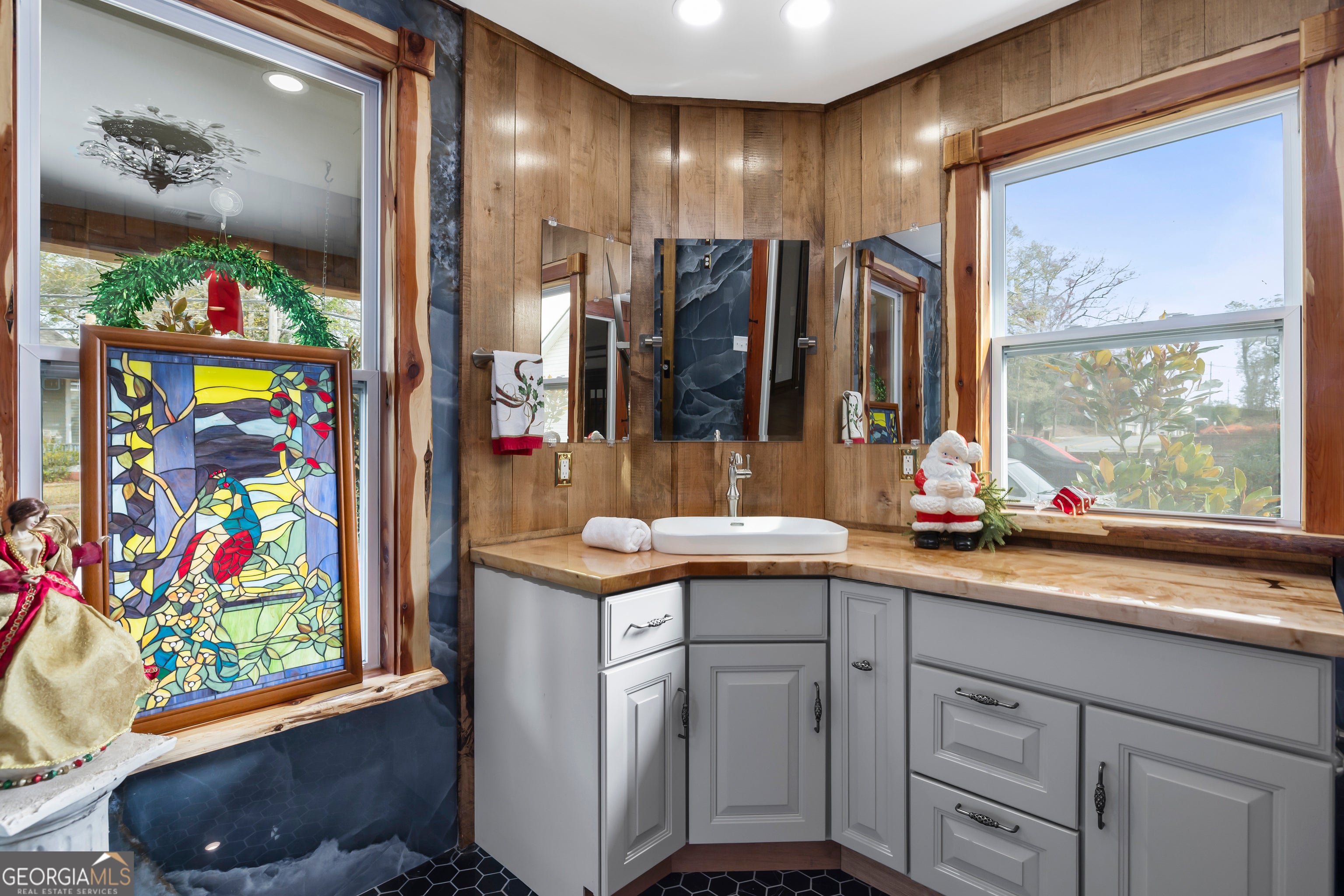 Don't let the holiday glow distract you-68 Spring Street deserves your full attention. Approaching this restored historic home, you'll immediately notice its truly bespoke finishes: Purple Heart lumber, faded onyx tile, and three reclaimed 1880s mantles with documented local provenance. Set along one of the southernmost corridors of the downtown historic district, the home is believed to date to around 1880, during Newnan's second settlement period. With only a few recorded owners since 1985, it has just completed a meticulous multi-year restoration that blends artisan craftsmanship with carefully preserved historic elements. The front porch welcomes you with custom French doors, cedar shakes, an 1880s solid-wood twin post, and the original tongue-and-groove ceiling. Inside, the foyer presents custom Judge's paneling, detailed trim, and a whimsical emerald duck centerpiece. To the left, a bright bath features mirror-finish blue tile, an angled vanity, a marble-accented clawfoot tub, and sweeping neighborhood views. To the right, the living room boasts a hand-carved Wormwood Maple ceiling, bold crown molding, ivory medallion drapery, and chair railing leading to the first 1880s mantle equipped with an instant-fire feature. This warm space leads naturally into the kitchen and dining areas. Hand-hewn logs and a scalloped glass insert frame the dining room, centered around a faded onyx focal point. The kitchen showcases African Purple Heart lumber countertops milled in Concord, GA, finished with multiple coats of marine-grade resin. Matching custom shelving, stainless KitchenAid appliances, soft-close cabinetry with industrial hardware, and a dual-bay butcher's sink complete the space. Behind the kitchen, a bath features faded onyx tile, a curved-top glass shower panel, a pedestal sink, and faceted crystal lighting. The adjacent laundry area is filled with natural light from four windows and includes wrought-iron shelving and a mini pedestal sink. A marble-lined room awaits next, with hand-lathed wormwood beams, exposed rafters, and an etched light fixture-plus access to an Ipe deck with hand-milled balusters. Past this room lies an additional bedroom or living space distinguished by its sweeping curved window frames. Every window in the home has custom, one-of-a-kind trim work. The owner's suite offers another fireplace and a cedar-lined double-door closet. Its en-suite bath includes a vessel tub with a custom glass partition and a natural wood vanity rising from inky blue tile and hand-cut moldings. Your tour concludes where it began, greeted once more by the carved emerald duck-a fitting symbol for this "Woodsman's Cottage," where storybook finishes and dedicated craftsmanship bring the home to life. Please inquire for further details. Shown by appointment only.