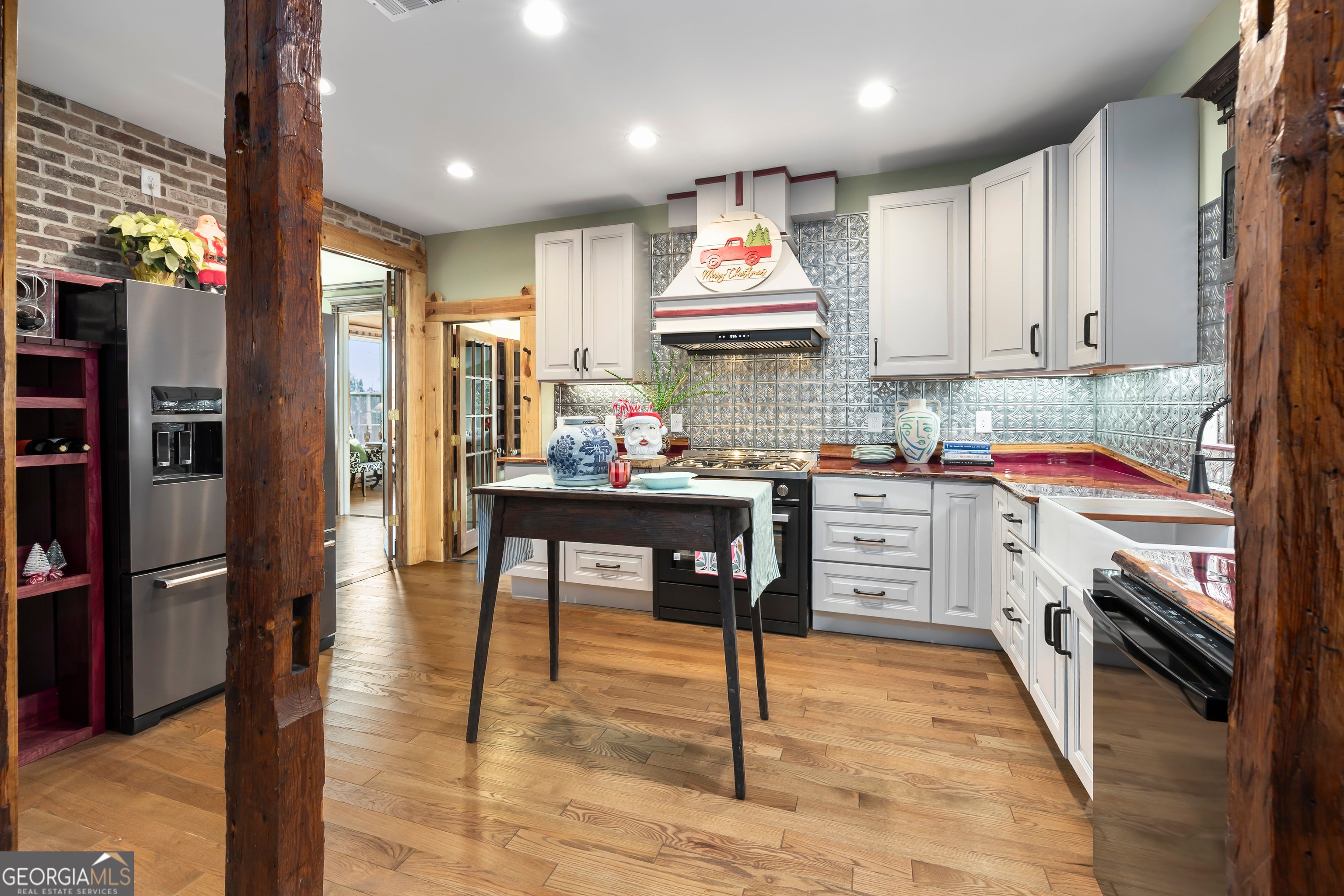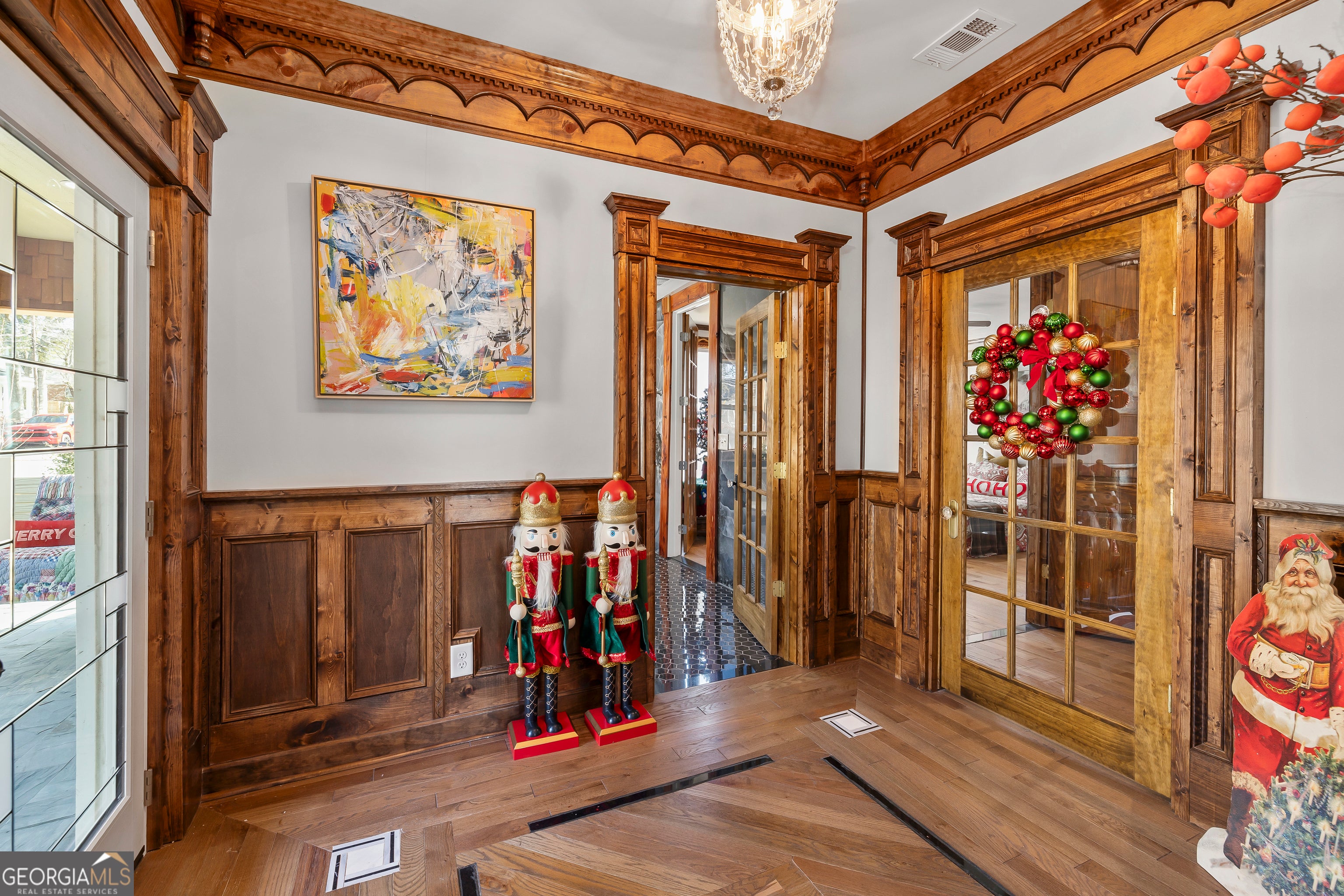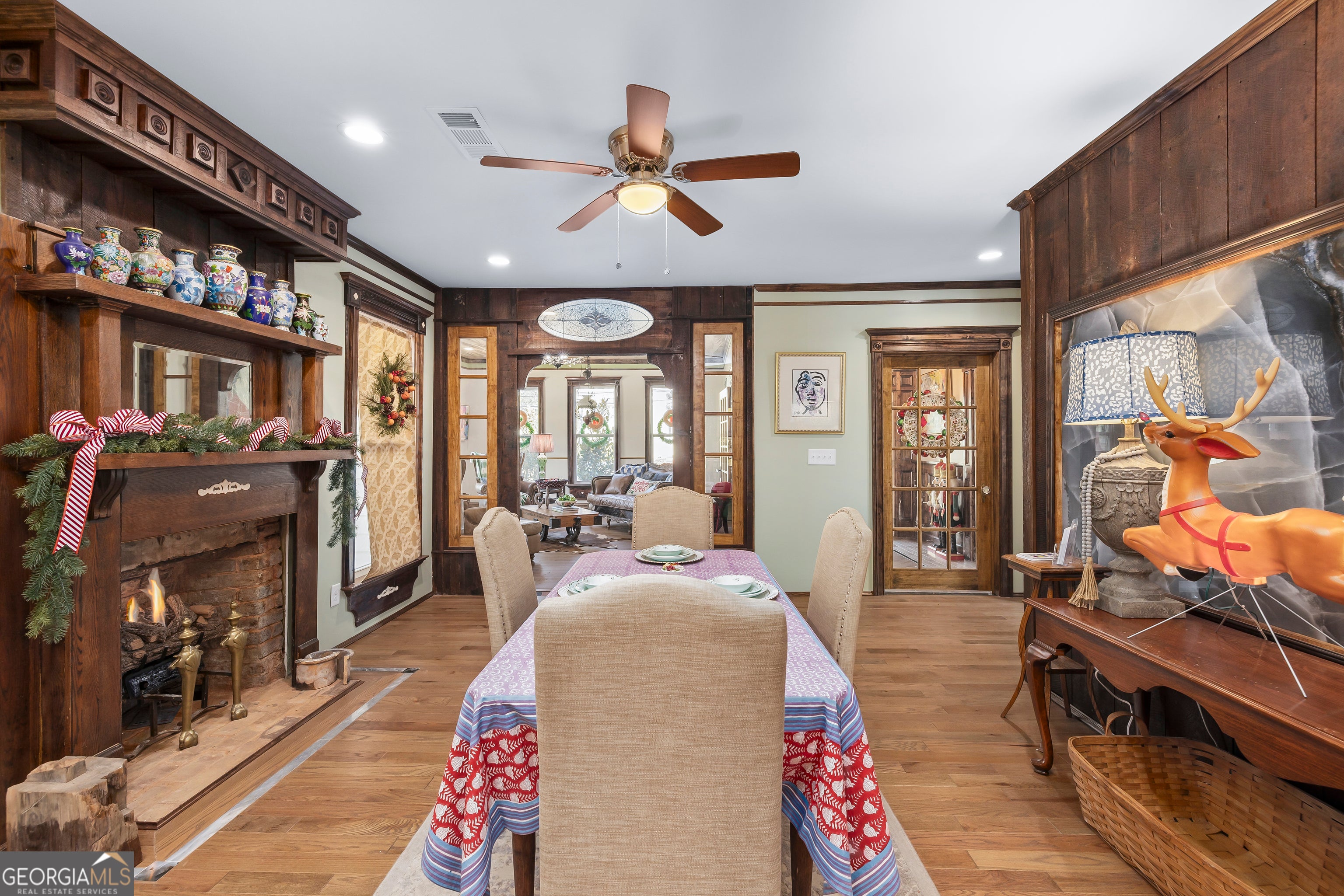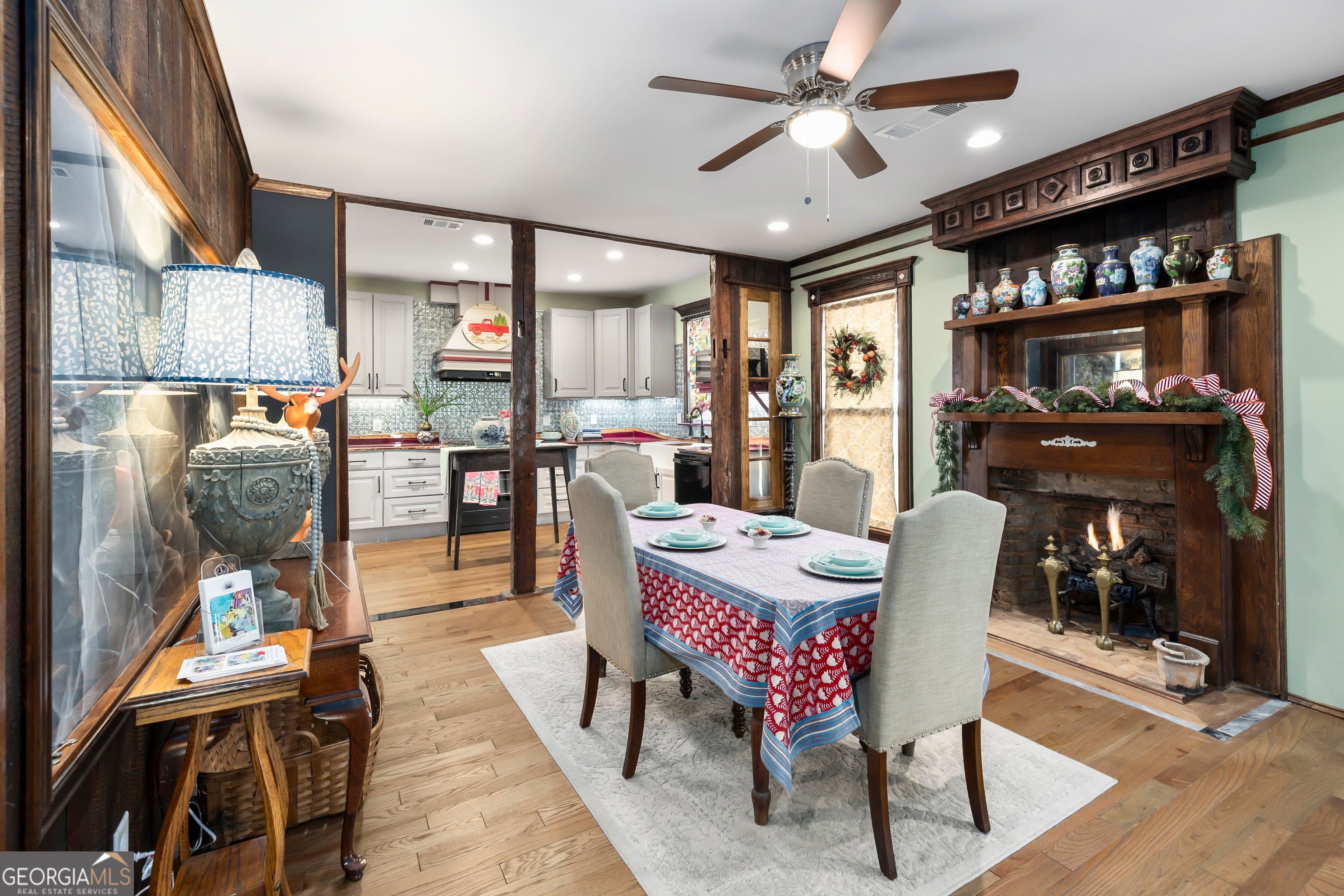 Don't let the holiday glow distract you-68 Spring Street deserves your full attention. Approaching this restored historic home, you'll immediately notice its truly bespoke finishes: Purple Heart lumber, faded onyx tile, and three reclaimed 1880s mantles with documented local provenance. Set along one of the southernmost corridors of the downtown historic district, the home is believed to date to around 1880, during Newnan's second settlement period. With only a few recorded owners since 1985, it has just completed a meticulous multi-year restoration that blends artisan craftsmanship with carefully preserved historic elements. The front porch welcomes you with custom French doors, cedar shakes, an 1880s solid-wood twin post, and the original tongue-and-groove ceiling. Inside, the foyer presents custom Judge's paneling, detailed trim, and a whimsical emerald duck centerpiece. To the left, a bright bath features mirror-finish blue tile, an angled vanity, a marble-accented clawfoot tub, and sweeping neighborhood views. To the right, the living room boasts a hand-carved Wormwood Maple ceiling, bold crown molding, ivory medallion drapery, and chair railing leading to the first 1880s mantle equipped with an instant-fire feature. This warm space leads naturally into the kitchen and dining areas. Hand-hewn logs and a scalloped glass insert frame the dining room, centered around a faded onyx focal point. The kitchen showcases African Purple Heart lumber countertops milled in Concord, GA, finished with multiple coats of marine-grade resin. Matching custom shelving, stainless KitchenAid appliances, soft-close cabinetry with industrial hardware, and a dual-bay butcher's sink complete the space. Behind the kitchen, a bath features faded onyx tile, a curved-top glass shower panel, a pedestal sink, and faceted crystal lighting. The adjacent laundry area is filled with natural light from four windows and includes wrought-iron shelving and a mini pedestal sink. A marble-lined room awaits next, with hand-lathed wormwood beams, exposed rafters, and an etched light fixture-plus access to an Ipe deck with hand-milled balusters. Past this room lies an additional bedroom or living space distinguished by its sweeping curved window frames. Every window in the home has custom, one-of-a-kind trim work. The owner's suite offers another fireplace and a cedar-lined double-door closet. Its en-suite bath includes a vessel tub with a custom glass partition and a natural wood vanity rising from inky blue tile and hand-cut moldings. Your tour concludes where it began, greeted once more by the carved emerald duck-a fitting symbol for this "Woodsman's Cottage," where storybook finishes and dedicated craftsmanship bring the home to life. Please inquire for further details. Shown by appointment only.
