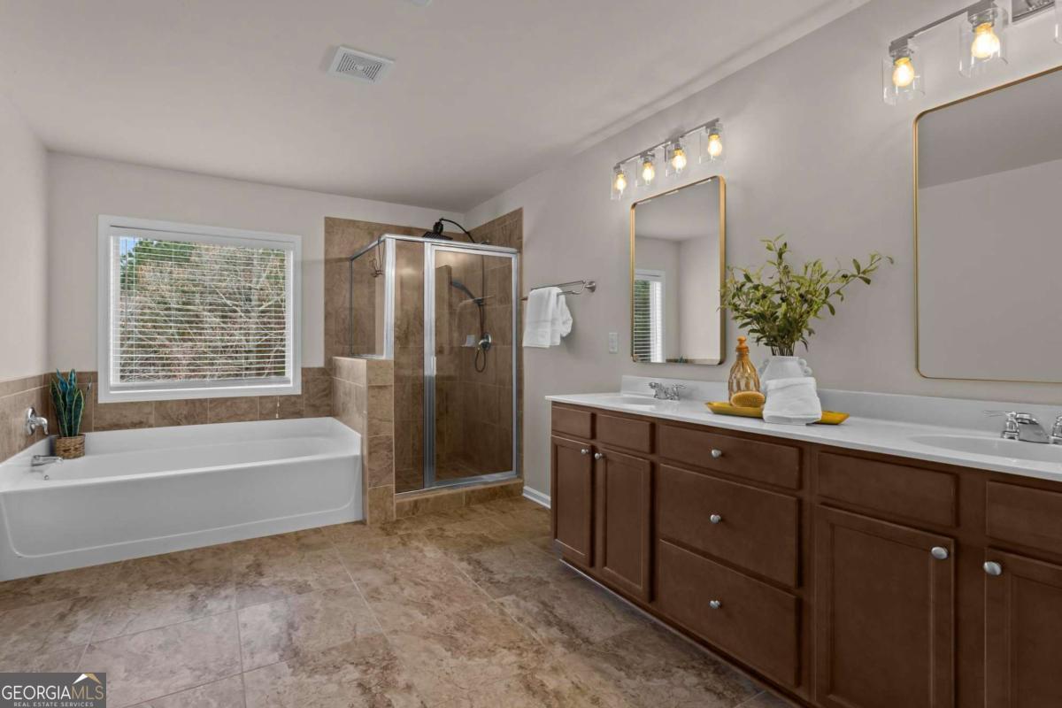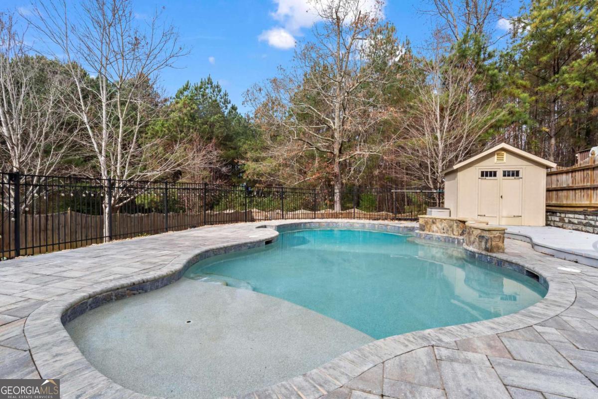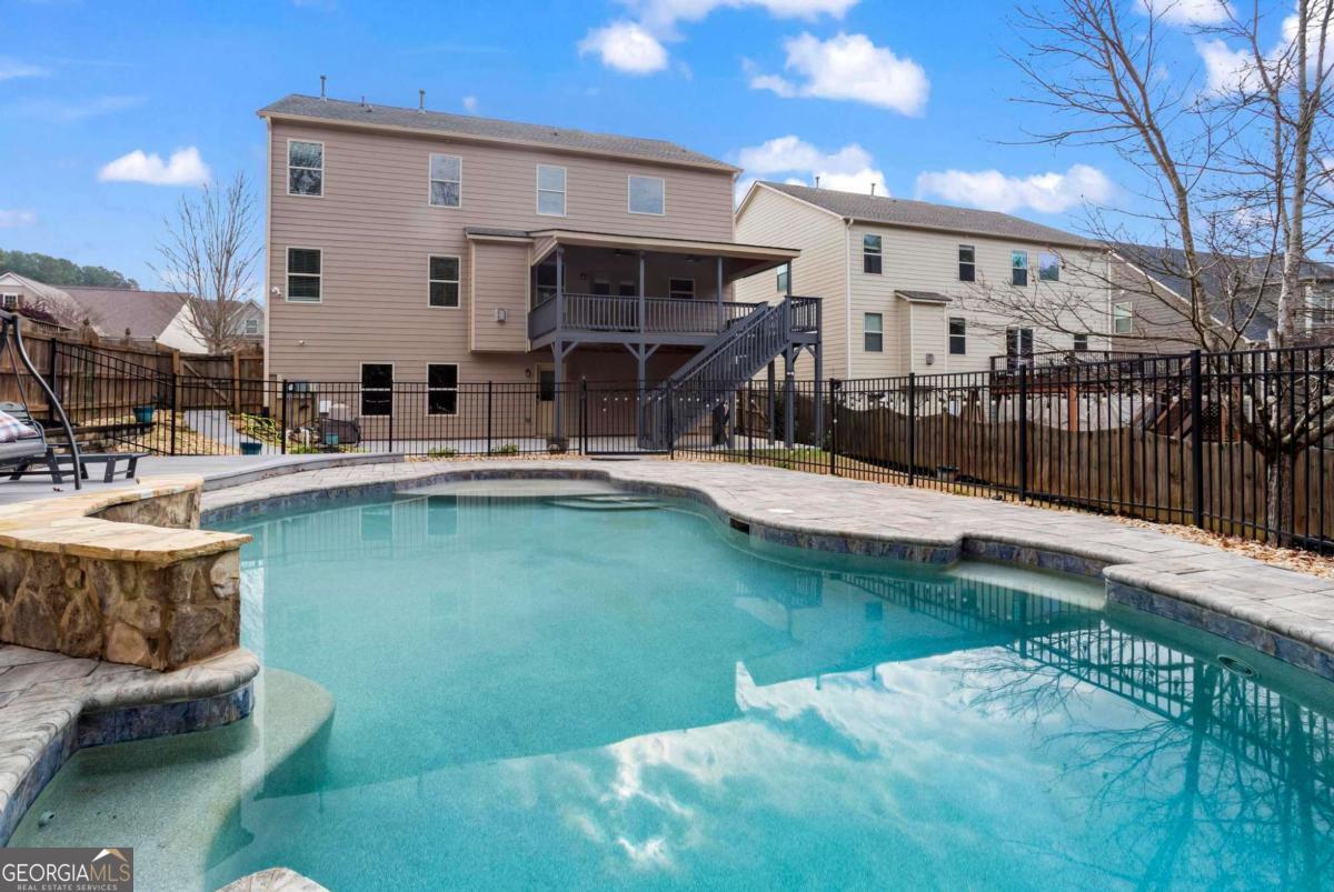 Beautifully updated and exceptionally maintained 5BR/4BA brick-front home with inground pool and daylight basement in the highly sought-after Centennial Lakes community of Cherokee County. Nestled on a 0.24-acre lot, this 2011-built property offers over 3,400 finished sqft, which includes a finished bedroom and full bath in the basement along with an additional 868 sqft of unfinished storage space perfect for future expansion. A welcoming 2-story foyer and tall ceilings set the tone as you enter this well-appointed home. Enjoy peace of mind with a 2-year-old 5-ton HVAC system, 5-year-old roof, vinyl windows, and LVP flooring throughout the main living areas and bedrooms, with tile flooring in the primary bath and basement bath. The 2021 kitchen remodel includes white cabinets, tile backsplash, quartz countertops, a walk-in pantry, a farmhouse sink, and an oversized island with seating for six. The kitchen also offers an electric range/cooktop with a gas line available, plus all appliances-including the refrigerator-remain with the home. The main level offers a spacious family room with fireplace, a bedroom and full bath, laundry room, and a formal dining room highlighted by a deep coffered ceiling. Upstairs features three generous bedrooms plus a spacious media room with barn doors, ideal for movie nights or gaming, while the large primary bedroom includes an attached ensuite offering double vanities and a walk-in closet. Outdoor living shines with a covered rear porch, privacy-fenced yard, and a stunning 20,000-gallon heated saltwater gunite pool installed in 2016, complete with tanning ledge, waterfall feature, 400k BTU gas heater, and Dolphin robotic cleaner-perfect for relaxing and entertaining. Centennial Lakes offers unmatched amenities including a lake, pool, clubhouse, tennis, basketball, volleyball, playground, sidewalks, and streetlights. With modern updates, exceptional outdoor living, and resort-style amenities, this home delivers outstanding value in a prime Acworth location.