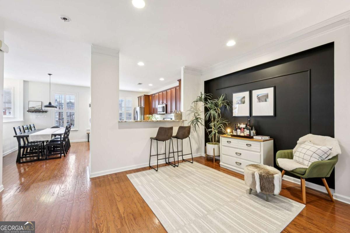 Bright end-unit townhome featuring beautifully updated, modern spaces! Wood stairs lead to the main level, where you'll find brand-new hardwood floors throughout. The spacious living room is filled with natural light and centered around a cozy fireplace, with easy access to the upper-level deck-perfect for relaxing or entertaining. The open-concept dining area flows seamlessly into the kitchen, which features granite countertops, an island with seating, a new tile backsplash, stainless steel appliances, and abundant natural light. A convenient half bath completes the main level. Upstairs, retreat to the oversized primary bedroom with an updated en-suite bath offering dual sinks, a soaking tub, and a separate walk-in shower. You'll also love the large walk-in closet with built-in storage. Two additional bedrooms share a full hall bath, and the upstairs laundry room adds everyday convenience. Don't miss the terrace level, offering even more flexible living space! A large living area plus a full bedroom and updated full bath make it ideal for a guest suite, MIL suite, home office, or media room. Outside, a covered lower patio provides additional space for dining or lounging while enjoying peaceful wooded views. Community amenities include walking trails and a refreshing pool-everything you need for comfort and convenience! Book your tour today!