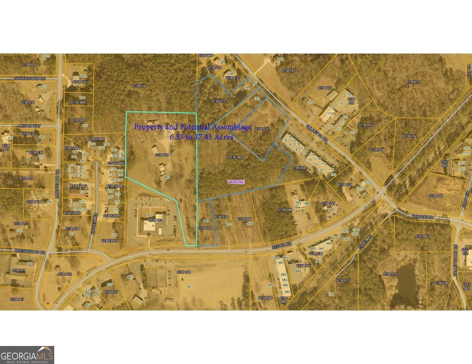 ***962 Senoia Rd, Tyrone, GA - 6.53 Acres (Up to 17.43 Acres Assemblage)*** Rare C-1 Commercial opportunity in downtown Tyrone with public sewer already connected-a major advantage in Fayette County where sewer-served commercial land is extremely limited. This 6.53-acre tract sits beside Tyrone City Hall and can be combined with adjacent parcels for a 17.43-acre contiguous assemblage. Additional parcels include commercial and residential tracts with three tear-down duplexes, all able to access sewer through 962 Senoia Rd and be rezoned C-1 Commercial. Formerly planned as a Town Center concept with retail, lofts, and green space. Adjacent to a newly approved 120-130-home subdivision. Ideal for retail, office, flex, warehouse, storage, or a mixed commercial plan. Offered at $749,000 ($114,700/acre) and competitively priced for Fayette County.