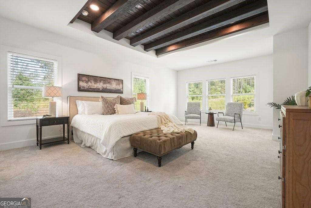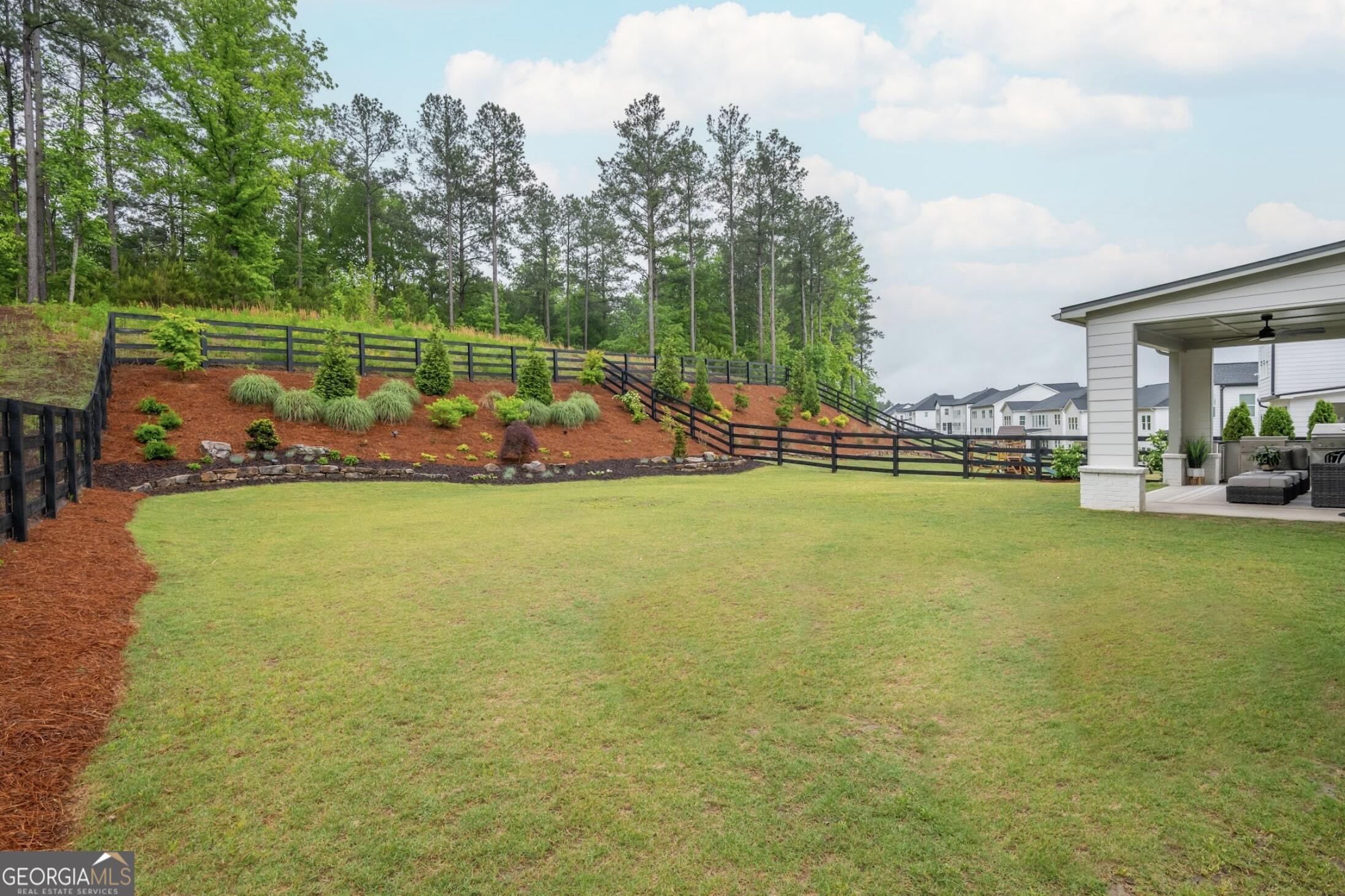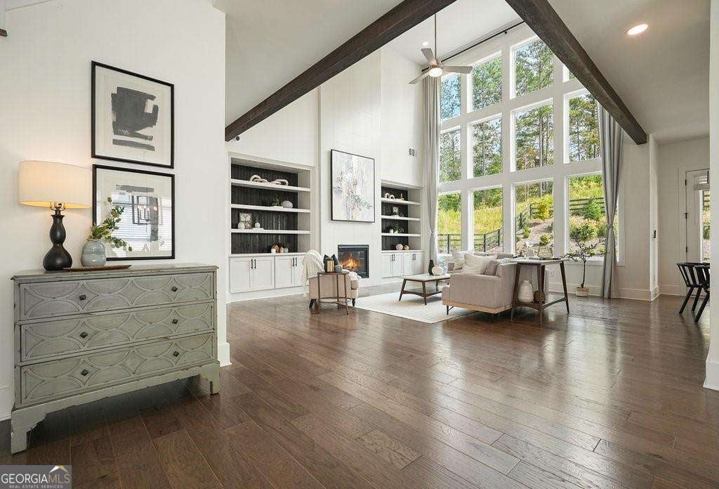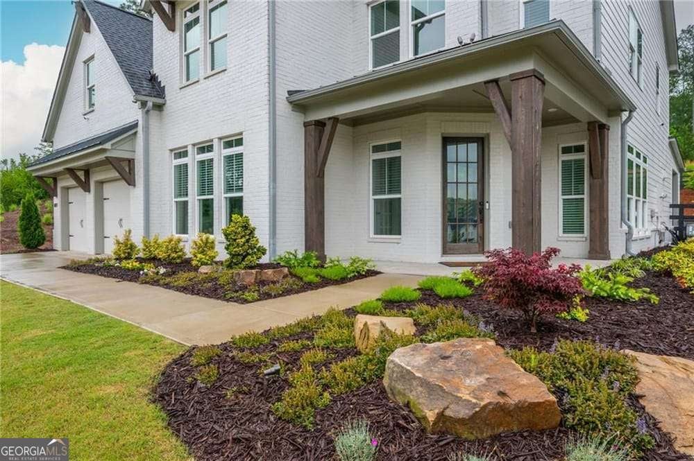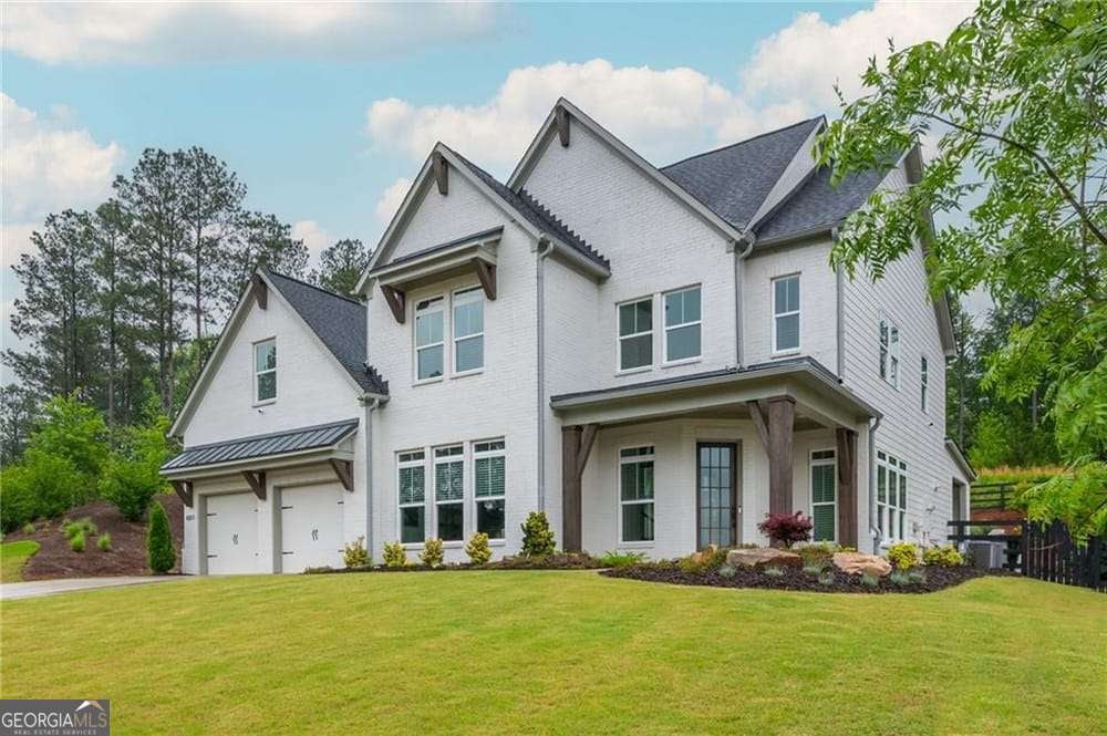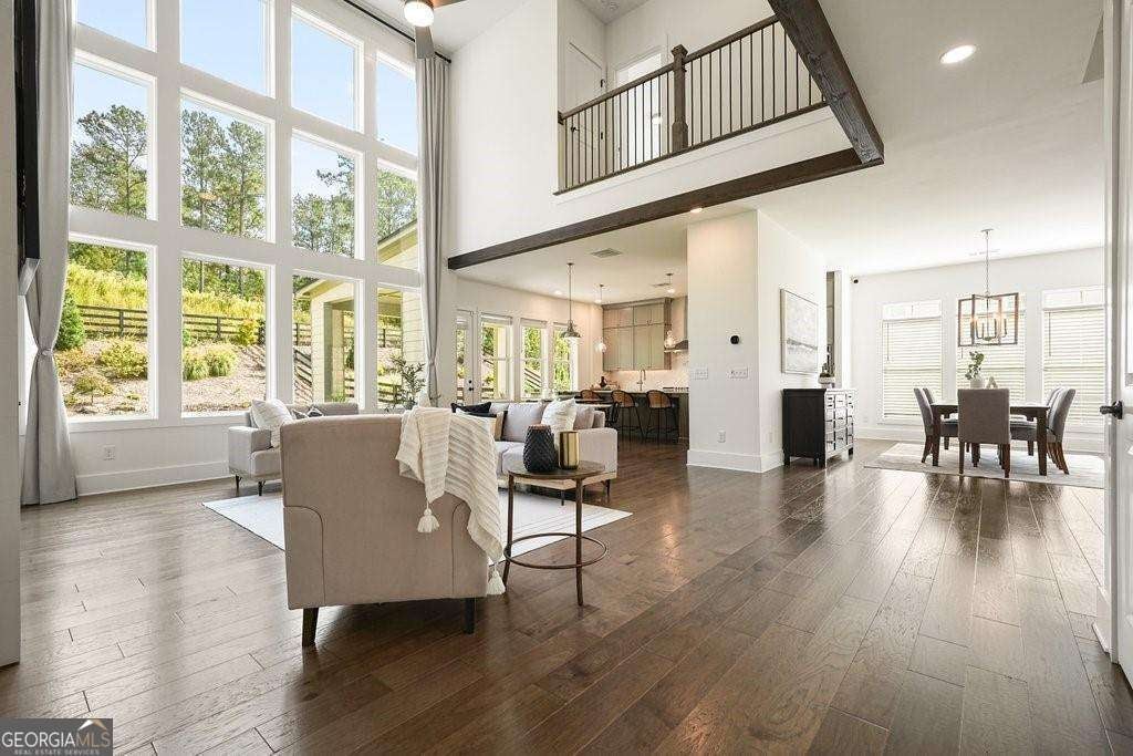 Introducing 1011 Ridgeview-a nearly new luxury residence where curated upgrades, refined finishes, and Toll Brothers' most sought-after floor plan converge in the prestigious Holly Farm community. Perfectly positioned just beyond the Milton line, this exceptional home offers peaceful pastoral surroundings, lower Cherokee County taxes, and unmatched convenience to top-rated schools, Atlanta National Country Club, and the vibrant amenities of Milton and Woodstock. From the moment you step inside, the grand two-story great room makes a breathtaking first impression. Sunlight pours through expansive windows, emphasizing architectural beams, elegant sightlines, and a layout designed for elevated entertaining as well as effortless everyday living. The open-concept main level features a private double-door home office, a refined formal dining room, and a magazine-worthy designer kitchen complete with a large island, premium cabinetry, and top-tier appliances including a Dacor French Door Reveal refrigerator. A main-level guest suite with full bath provides stepless convenience for visiting family or multigenerational living, while an additional flex space/home office ensures everyone has room to work, study, or create. Step outside to discover a true outdoor living sanctuary. The covered rear porch has been fully transformed with granite countertops, a 5-burner True Flame grill, matching True Flame griddle, a dedicated outdoor refrigerator and professionally designed accent lighting. Overlooking a flat, fenced backyard bordered by wooded views, this exceptional space invites year-round relaxation and entertaining. The premium lot offers both privacy and generous room to play or garden. Upstairs, the luxury primary suite serves as a serene and sophisticated retreat. The oversized bedroom showcases a striking wood-beamed ceiling, space for a lounge or workspace, and tranquil views of the backyard. The spa-caliber en-suite bath features dual shower heads, a deep soaking tub, and a beautifully appointed dual vanity illuminated by natural light. Additional upgrades include the Nest smart home system with indoor/outdoor cameras and ADT monitoring, Custom draperies and professionally crafted built-ins. Architectural beams in the owner's suite and enhanced sightlines unique to this premier floor plan. Residents of Holly Farm enjoy resort-style amenities, pool and pool house, game tables, pickleball courts, fire pit, and a scenic walking trail-all just moments from home. Immaculate, thoughtfully upgraded, and truly turnkey, 1011 Ridgeview embodies the pinnacle of modern luxury living in one of Cherokee County's most coveted enclaves.