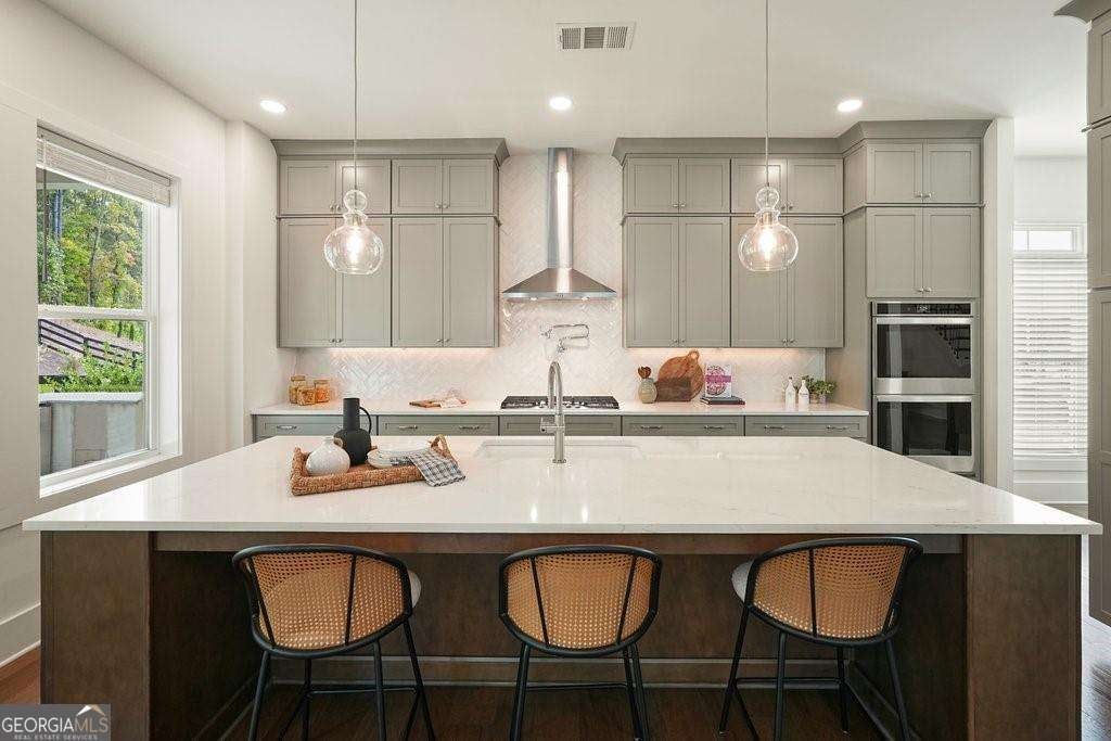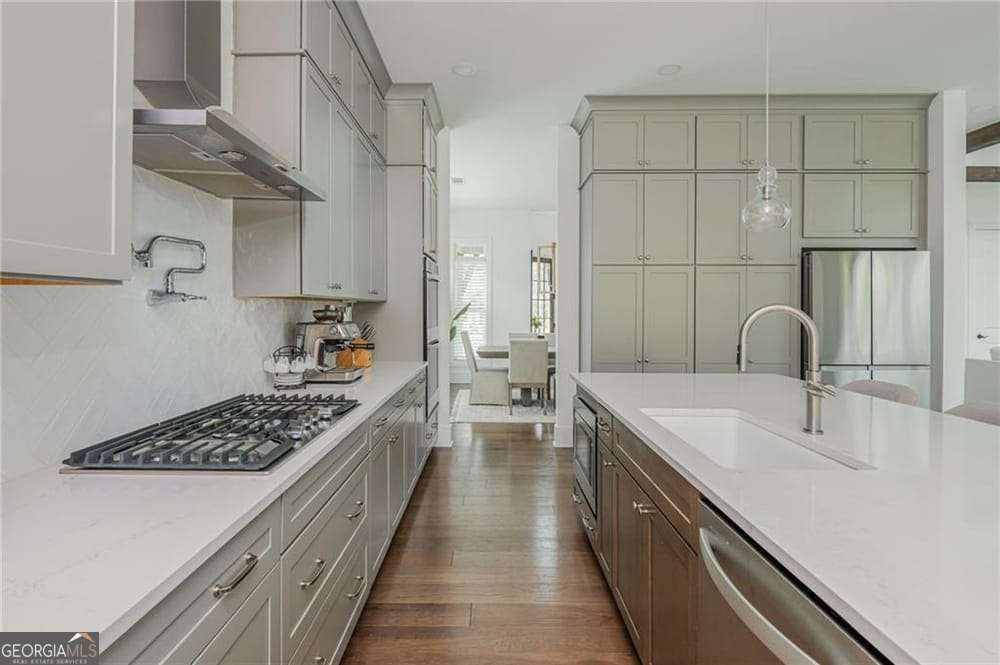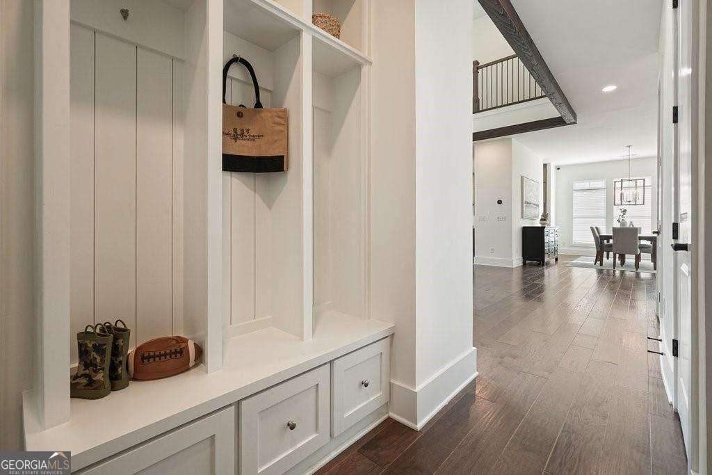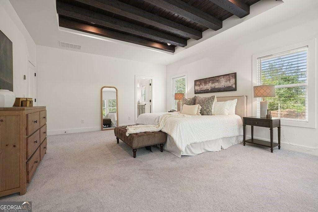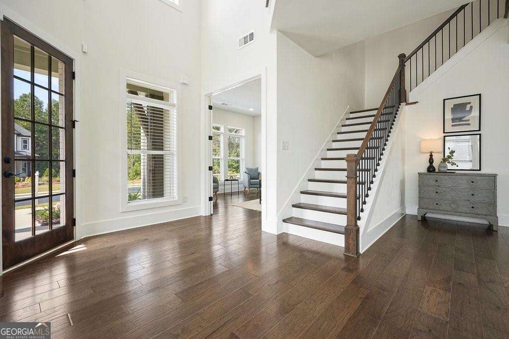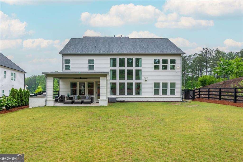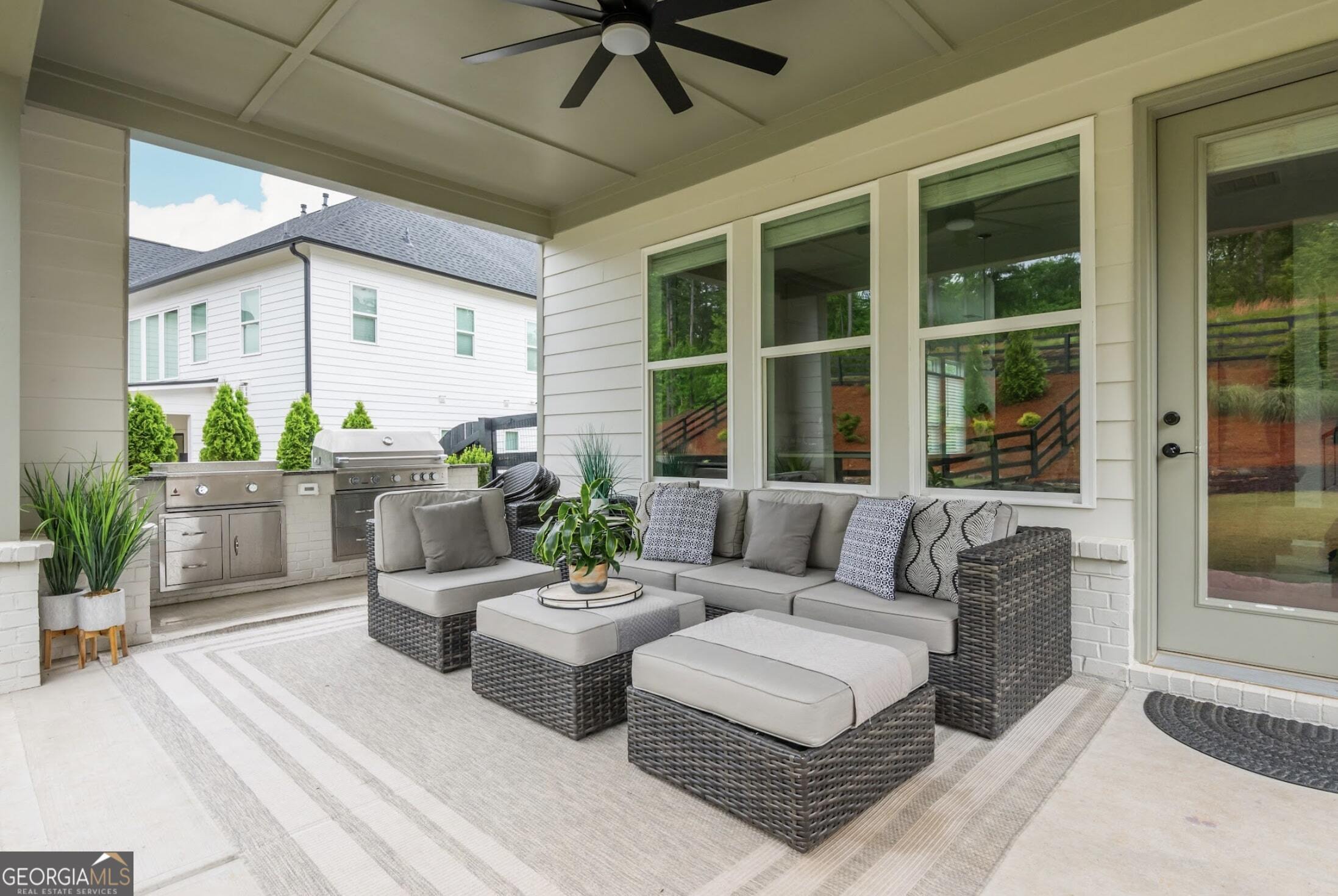 Introducing 1011 Ridgeview-a nearly new luxury residence where curated upgrades, refined finishes, and Toll Brothers' most sought-after floor plan converge in the prestigious Holly Farm community. Perfectly positioned just beyond the Milton line, this exceptional home offers peaceful pastoral surroundings, lower Cherokee County taxes, and unmatched convenience to top-rated schools, Atlanta National Country Club, and the vibrant amenities of Milton and Woodstock. From the moment you step inside, the grand two-story great room makes a breathtaking first impression. Sunlight pours through expansive windows, emphasizing architectural beams, elegant sightlines, and a layout designed for elevated entertaining as well as effortless everyday living. The open-concept main level features a private double-door home office, a refined formal dining room, and a magazine-worthy designer kitchen complete with a large island, premium cabinetry, and top-tier appliances including a Dacor French Door Reveal refrigerator. A main-level guest suite with full bath provides stepless convenience for visiting family or multigenerational living, while an additional flex space/home office ensures everyone has room to work, study, or create. Step outside to discover a true outdoor living sanctuary. The covered rear porch has been fully transformed with granite countertops, a 5-burner True Flame grill, matching True Flame griddle, a dedicated outdoor refrigerator and professionally designed accent lighting. Overlooking a flat, fenced backyard bordered by wooded views, this exceptional space invites year-round relaxation and entertaining. The premium lot offers both privacy and generous room to play or garden. Upstairs, the luxury primary suite serves as a serene and sophisticated retreat. The oversized bedroom showcases a striking wood-beamed ceiling, space for a lounge or workspace, and tranquil views of the backyard. The spa-caliber en-suite bath features dual shower heads, a deep soaking tub, and a beautifully appointed dual vanity illuminated by natural light. Additional upgrades include the Nest smart home system with indoor/outdoor cameras and ADT monitoring, Custom draperies and professionally crafted built-ins. Architectural beams in the owner's suite and enhanced sightlines unique to this premier floor plan. Residents of Holly Farm enjoy resort-style amenities, pool and pool house, game tables, pickleball courts, fire pit, and a scenic walking trail-all just moments from home. Immaculate, thoughtfully upgraded, and truly turnkey, 1011 Ridgeview embodies the pinnacle of modern luxury living in one of Cherokee County's most coveted enclaves.