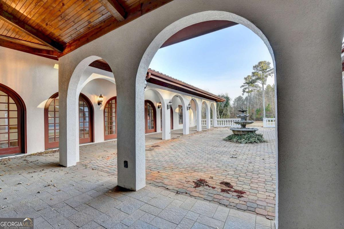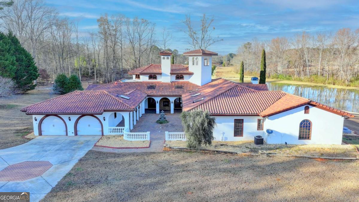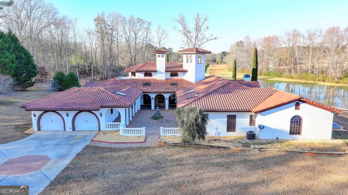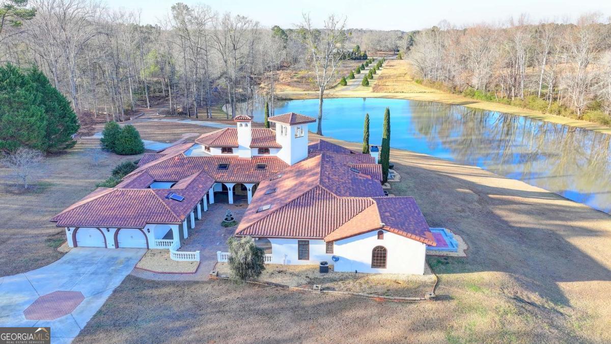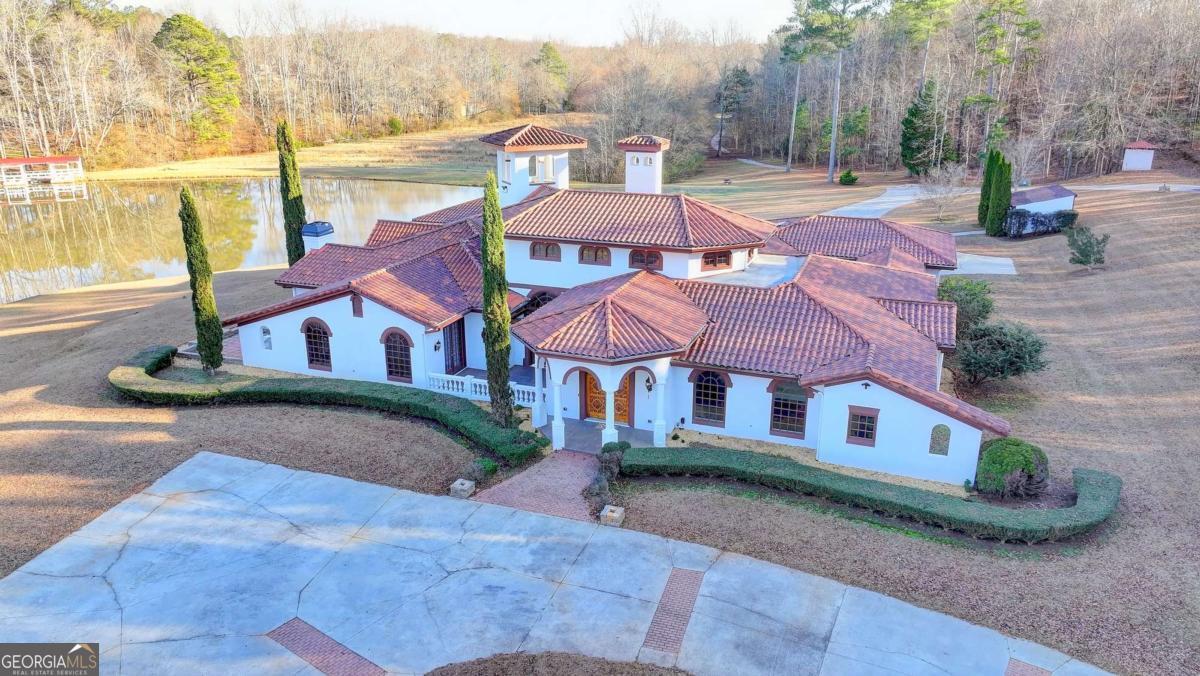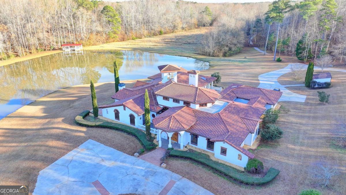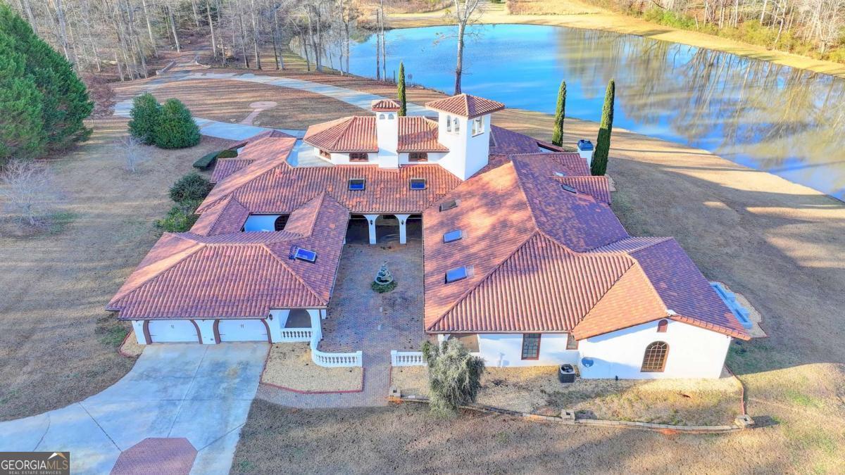 This stunning ESTATE HOME with a PRIVATE LAKE, featuring a meticulously designed Main House Overview: main house with 6,000+ sq. ft. of living space and numerous high-end amenities. Upon entering, custom-carved double wooden entry doors open into a formal solarium-style foyer, which flows into the expansive family room with a cathedral-style ceiling and cedar beams. The room is highlighted by a remote-controlled chandelier and a grand fireplace. Beautiful double doors open to a front courtyard with serene lake views, as well as a massive rear courtyard featuring a water fountain and outdoor rock fireplace. The chef-inspired kitchen is fully equipped with top-of-the-line stainless steel appliances, including a refrigerator, double ovens, microwave, warming drawer, trash compactor, wine fridge, and a Viking gas stove-ideal for any culinary enthusiast. Adjacent to the kitchen is a laundry/mudroom and a pantry that spans the length of the home, providing ample storage, a second dishwasher, and a half bath.The left wing of the home includes a half bath for guests, as well as a stately library/office, which can also serve as a 4th bedroom. This space boasts a fireplace, custom bookshelves, captain's paneling, and a private entrance to a patio with lake views. The luxurious primary suite features a sitting area with a fireplace, a private patio overlooking the lake, a wet bar, two custom closets, and a spacious ensuite bathroom with dual vanities, two toilets, a soaking tub, and a separate shower. The hallway, with arched windows and doors leading to the courtyard, connects to two additional bedrooms, each with a private bath-one featuring a covered patio with lake views. A dedicated entertainment/media room with a full bar, sauna, and lake views completes the living spaces. Throughout the home, you'll find exquisite tile floors, arched doorways, and elegant entryways, all contributing to the refined aesthetic. Guest House/Office: The guest house or office space offers a full kitchen, living room, two bedrooms, and two bathrooms. An oversized garage provides abundant storage space, and the entire guest house is designed with convenience and comfort in mind. This exceptional estate offers the perfect blend of privacy and luxury, while being conveniently located just a short drive from GA-Hwy 11, Historic Covington, Social Circle, Monroe, and minutes to I-20. This dream property is a must-see-schedule your private showing today!