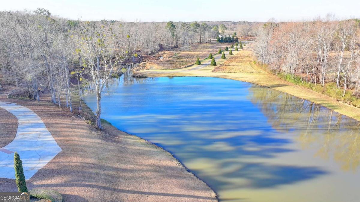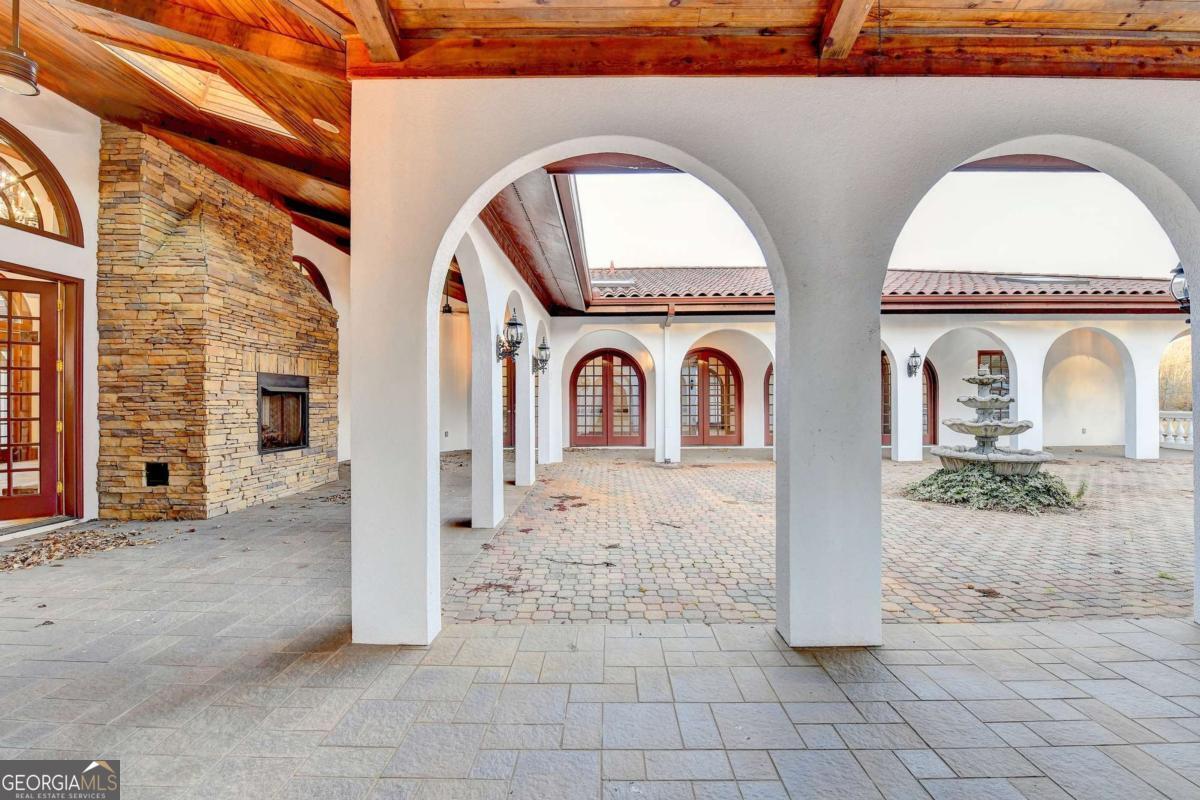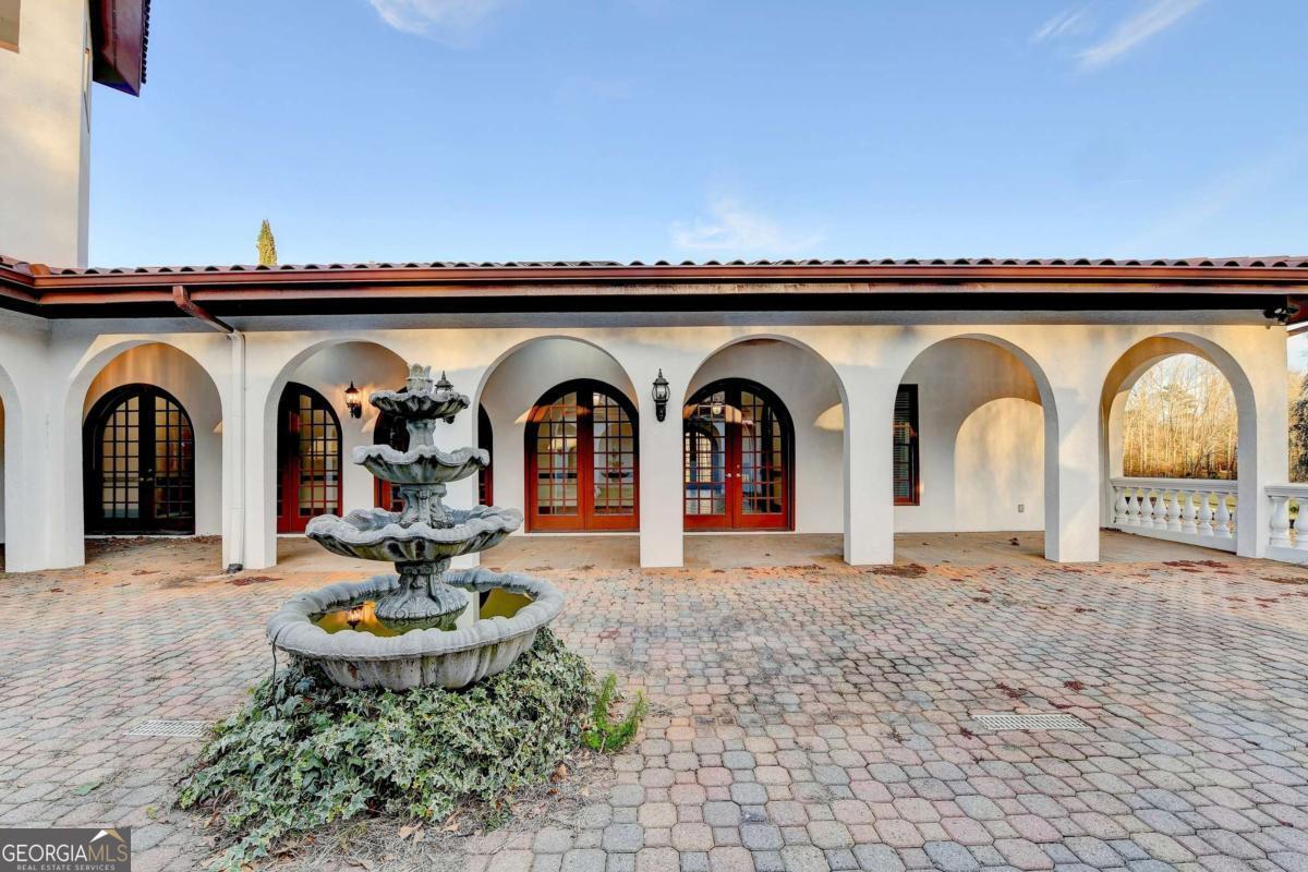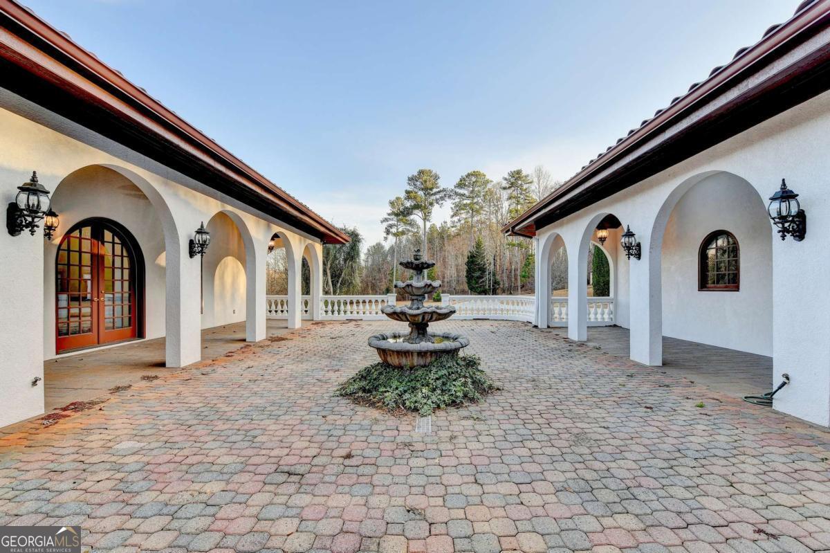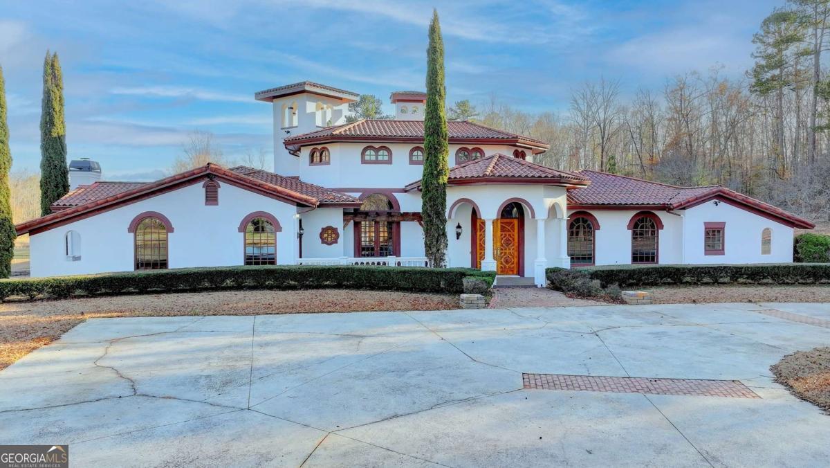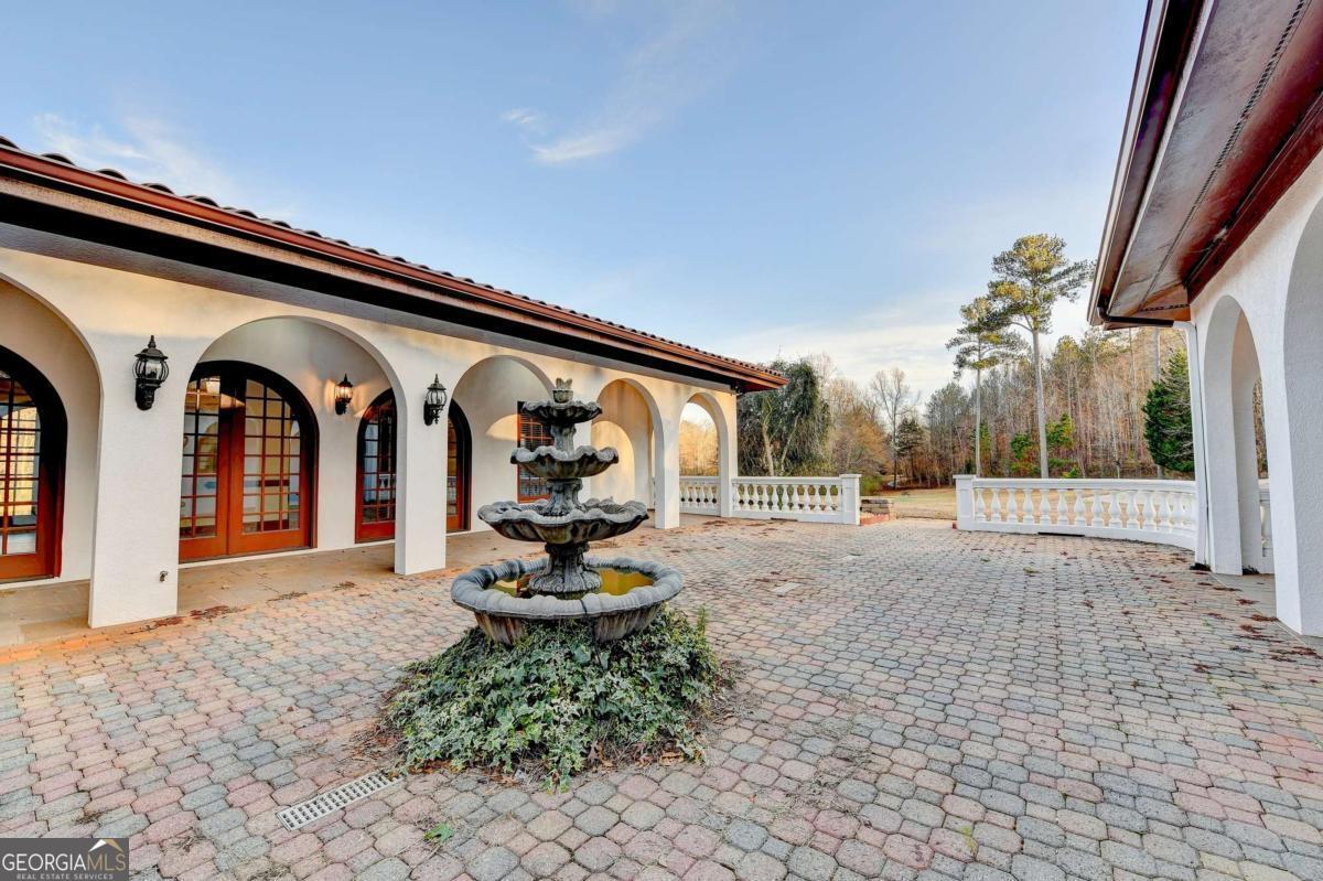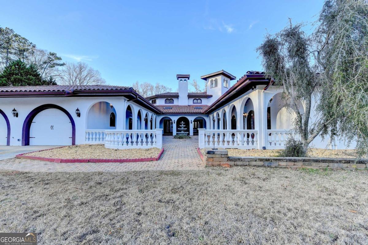 This stunning ESTATE HOME with a PRIVATE LAKE, featuring a meticulously designed Main House Overview: main house with 6,000+ sq. ft. of living space and numerous high-end amenities. Upon entering, custom-carved double wooden entry doors open into a formal solarium-style foyer, which flows into the expansive family room with a cathedral-style ceiling and cedar beams. The room is highlighted by a remote-controlled chandelier and a grand fireplace. Beautiful double doors open to a front courtyard with serene lake views, as well as a massive rear courtyard featuring a water fountain and outdoor rock fireplace. The chef-inspired kitchen is fully equipped with top-of-the-line stainless steel appliances, including a refrigerator, double ovens, microwave, warming drawer, trash compactor, wine fridge, and a Viking gas stove-ideal for any culinary enthusiast. Adjacent to the kitchen is a laundry/mudroom and a pantry that spans the length of the home, providing ample storage, a second dishwasher, and a half bath.The left wing of the home includes a half bath for guests, as well as a stately library/office, which can also serve as a 4th bedroom. This space boasts a fireplace, custom bookshelves, captain's paneling, and a private entrance to a patio with lake views. The luxurious primary suite features a sitting area with a fireplace, a private patio overlooking the lake, a wet bar, two custom closets, and a spacious ensuite bathroom with dual vanities, two toilets, a soaking tub, and a separate shower. The hallway, with arched windows and doors leading to the courtyard, connects to two additional bedrooms, each with a private bath-one featuring a covered patio with lake views. A dedicated entertainment/media room with a full bar, sauna, and lake views completes the living spaces. Throughout the home, you'll find exquisite tile floors, arched doorways, and elegant entryways, all contributing to the refined aesthetic. Guest House/Office: The guest house or office space offers a full kitchen, living room, two bedrooms, and two bathrooms. An oversized garage provides abundant storage space, and the entire guest house is designed with convenience and comfort in mind. This exceptional estate offers the perfect blend of privacy and luxury, while being conveniently located just a short drive from GA-Hwy 11, Historic Covington, Social Circle, Monroe, and minutes to I-20. This dream property is a must-see-schedule your private showing today!