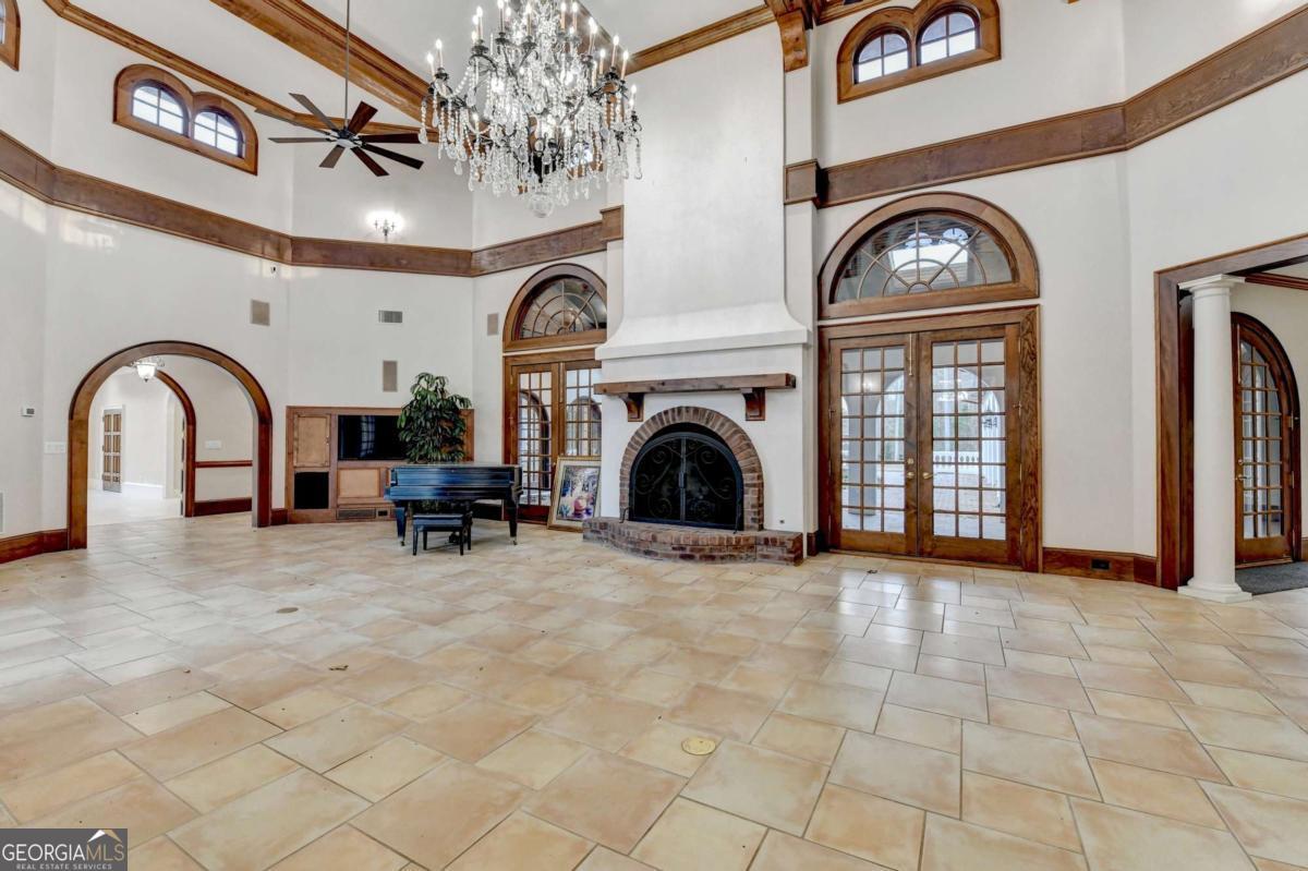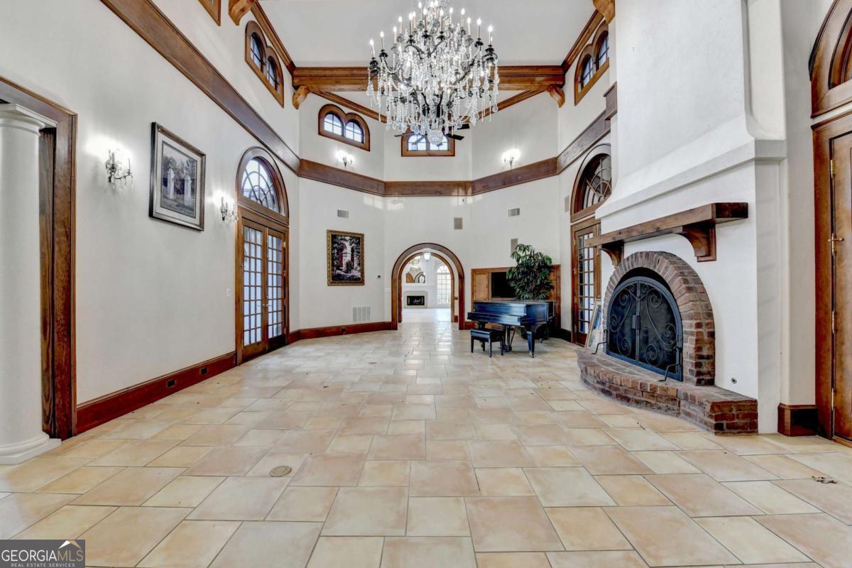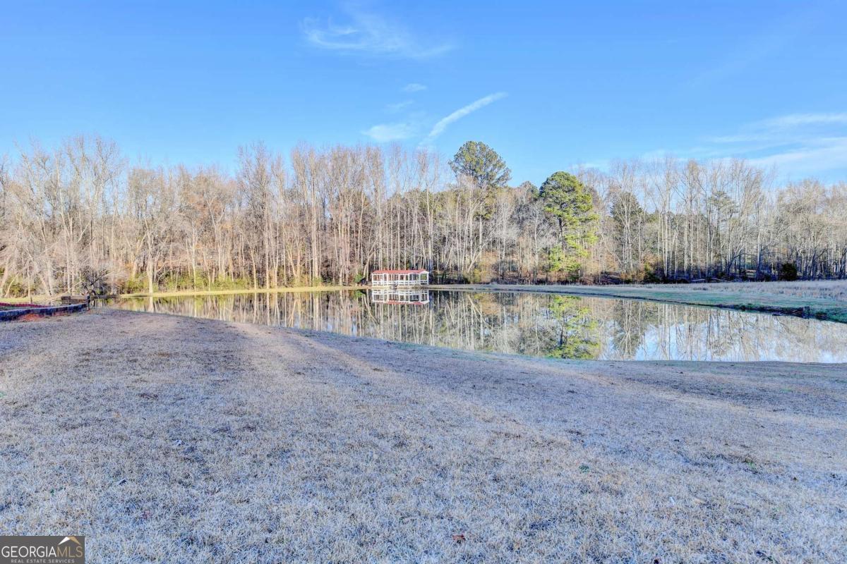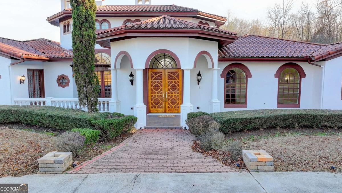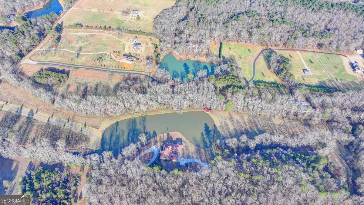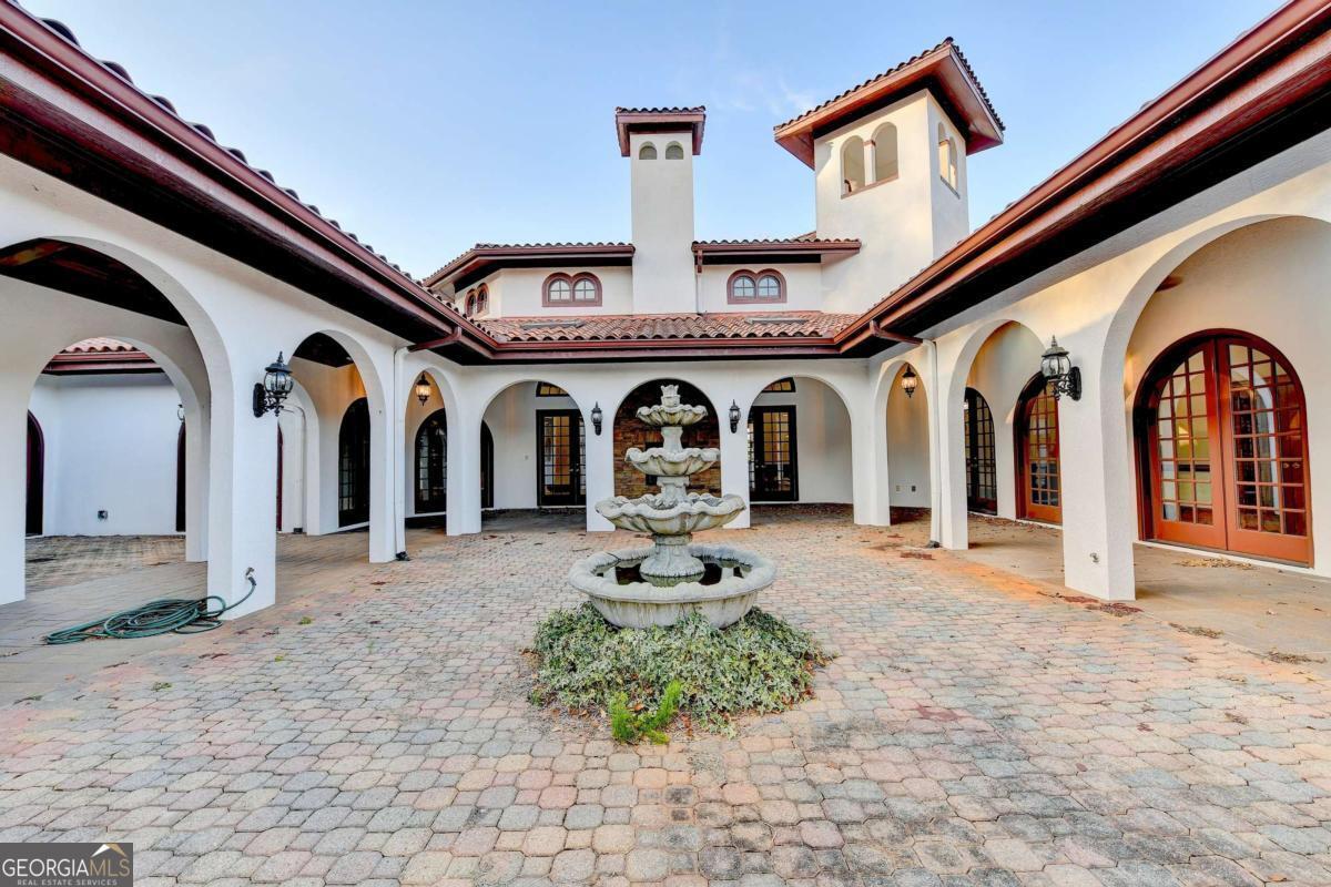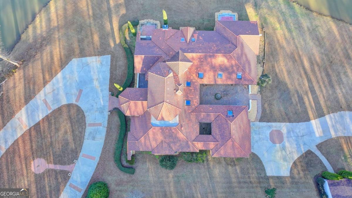 This stunning ESTATE HOME with a PRIVATE LAKE, featuring a meticulously designed Main House Overview: main house with 6,000+ sq. ft. of living space and numerous high-end amenities. Upon entering, custom-carved double wooden entry doors open into a formal solarium-style foyer, which flows into the expansive family room with a cathedral-style ceiling and cedar beams. The room is highlighted by a remote-controlled chandelier and a grand fireplace. Beautiful double doors open to a front courtyard with serene lake views, as well as a massive rear courtyard featuring a water fountain and outdoor rock fireplace. The chef-inspired kitchen is fully equipped with top-of-the-line stainless steel appliances, including a refrigerator, double ovens, microwave, warming drawer, trash compactor, wine fridge, and a Viking gas stove-ideal for any culinary enthusiast. Adjacent to the kitchen is a laundry/mudroom and a pantry that spans the length of the home, providing ample storage, a second dishwasher, and a half bath.The left wing of the home includes a half bath for guests, as well as a stately library/office, which can also serve as a 4th bedroom. This space boasts a fireplace, custom bookshelves, captain's paneling, and a private entrance to a patio with lake views. The luxurious primary suite features a sitting area with a fireplace, a private patio overlooking the lake, a wet bar, two custom closets, and a spacious ensuite bathroom with dual vanities, two toilets, a soaking tub, and a separate shower. The hallway, with arched windows and doors leading to the courtyard, connects to two additional bedrooms, each with a private bath-one featuring a covered patio with lake views. A dedicated entertainment/media room with a full bar, sauna, and lake views completes the living spaces. Throughout the home, you'll find exquisite tile floors, arched doorways, and elegant entryways, all contributing to the refined aesthetic. Guest House/Office: The guest house or office space offers a full kitchen, living room, two bedrooms, and two bathrooms. An oversized garage provides abundant storage space, and the entire guest house is designed with convenience and comfort in mind. This exceptional estate offers the perfect blend of privacy and luxury, while being conveniently located just a short drive from GA-Hwy 11, Historic Covington, Social Circle, Monroe, and minutes to I-20. This dream property is a must-see-schedule your private showing today!