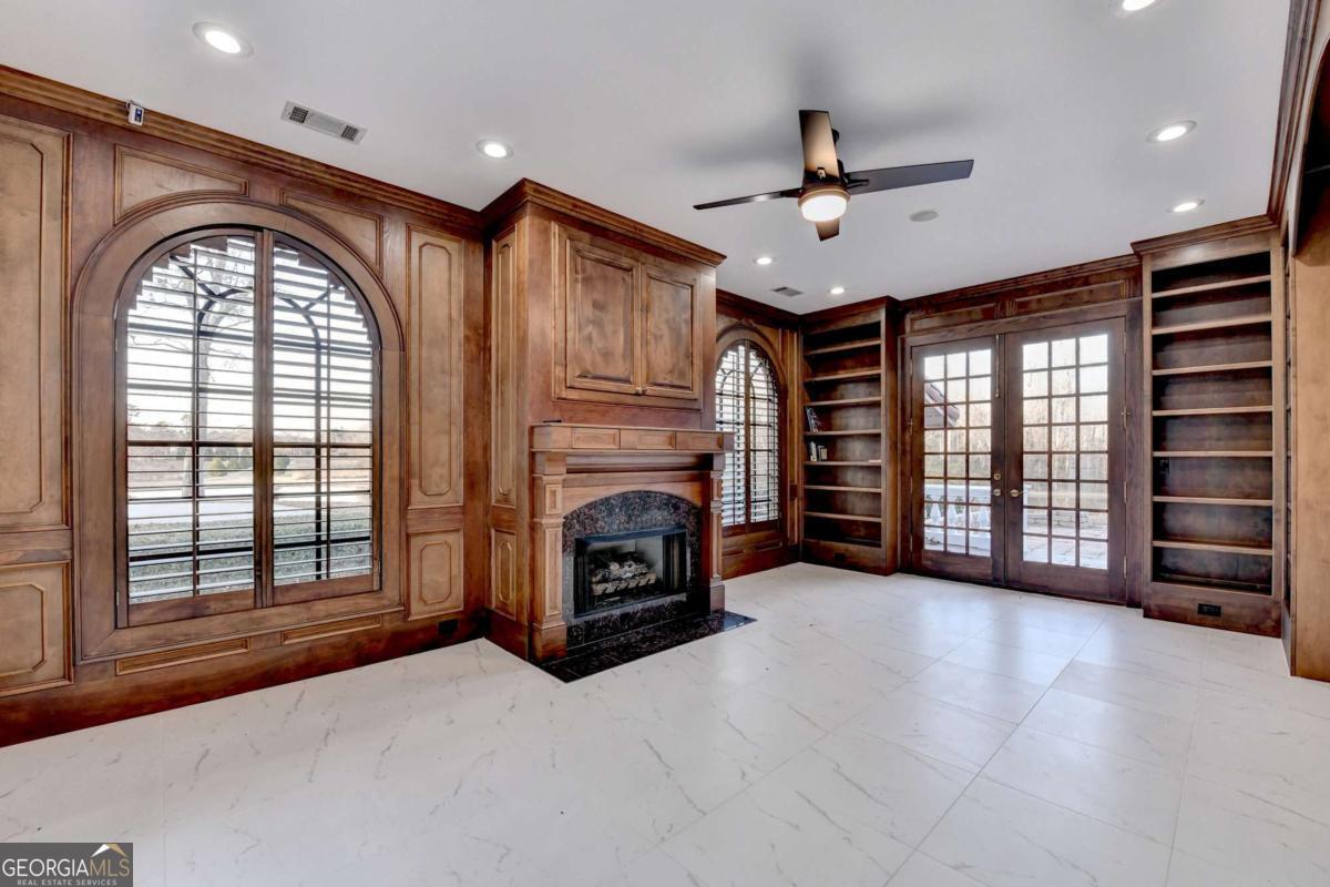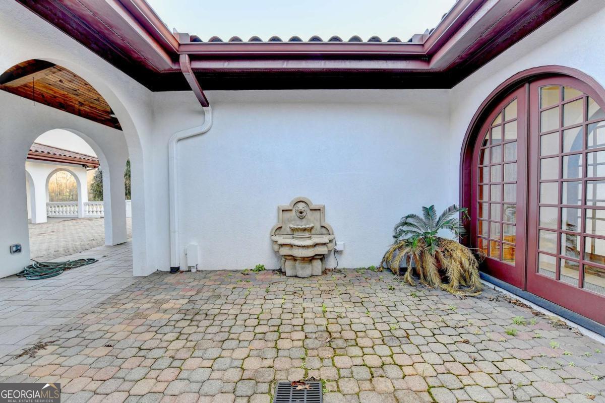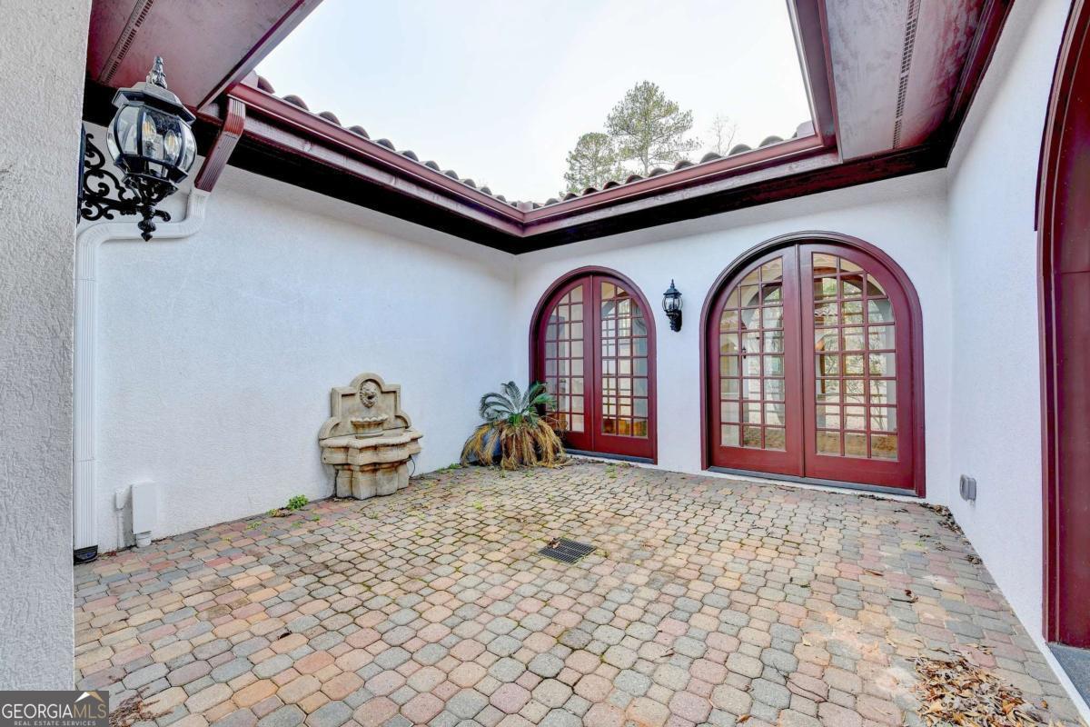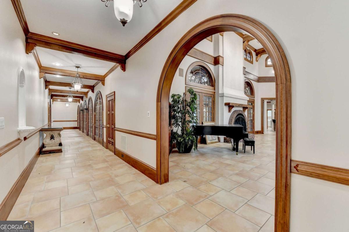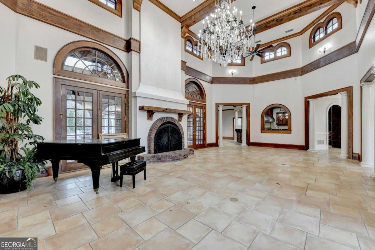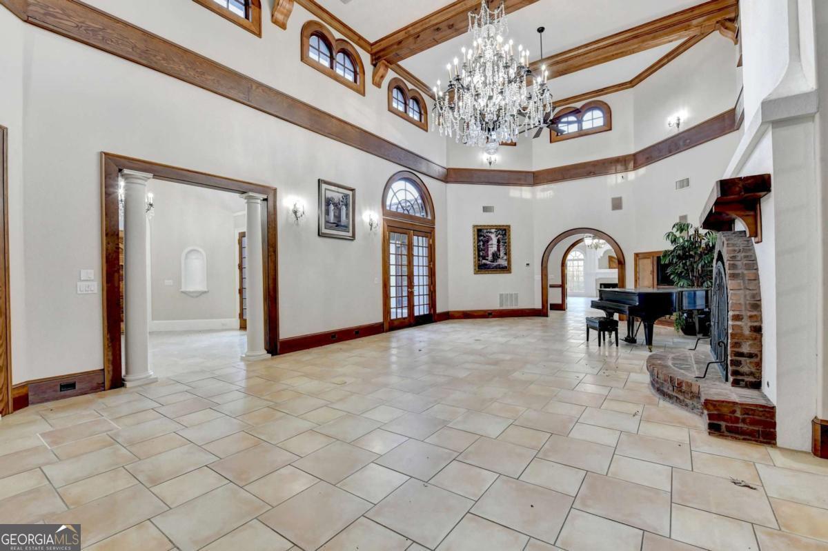 This stunning ESTATE HOME with a PRIVATE LAKE, featuring a meticulously designed Main House Overview: main house with 6,000+ sq. ft. of living space and numerous high-end amenities. Upon entering, custom-carved double wooden entry doors open into a formal solarium-style foyer, which flows into the expansive family room with a cathedral-style ceiling and cedar beams. The room is highlighted by a remote-controlled chandelier and a grand fireplace. Beautiful double doors open to a front courtyard with serene lake views, as well as a massive rear courtyard featuring a water fountain and outdoor rock fireplace. The chef-inspired kitchen is fully equipped with top-of-the-line stainless steel appliances, including a refrigerator, double ovens, microwave, warming drawer, trash compactor, wine fridge, and a Viking gas stove-ideal for any culinary enthusiast. Adjacent to the kitchen is a laundry/mudroom and a pantry that spans the length of the home, providing ample storage, a second dishwasher, and a half bath.The left wing of the home includes a half bath for guests, as well as a stately library/office, which can also serve as a 4th bedroom. This space boasts a fireplace, custom bookshelves, captain's paneling, and a private entrance to a patio with lake views. The luxurious primary suite features a sitting area with a fireplace, a private patio overlooking the lake, a wet bar, two custom closets, and a spacious ensuite bathroom with dual vanities, two toilets, a soaking tub, and a separate shower. The hallway, with arched windows and doors leading to the courtyard, connects to two additional bedrooms, each with a private bath-one featuring a covered patio with lake views. A dedicated entertainment/media room with a full bar, sauna, and lake views completes the living spaces. Throughout the home, you'll find exquisite tile floors, arched doorways, and elegant entryways, all contributing to the refined aesthetic. Guest House/Office: The guest house or office space offers a full kitchen, living room, two bedrooms, and two bathrooms. An oversized garage provides abundant storage space, and the entire guest house is designed with convenience and comfort in mind. This exceptional estate offers the perfect blend of privacy and luxury, while being conveniently located just a short drive from GA-Hwy 11, Historic Covington, Social Circle, Monroe, and minutes to I-20. This dream property is a must-see-schedule your private showing today!