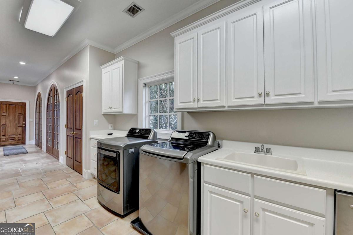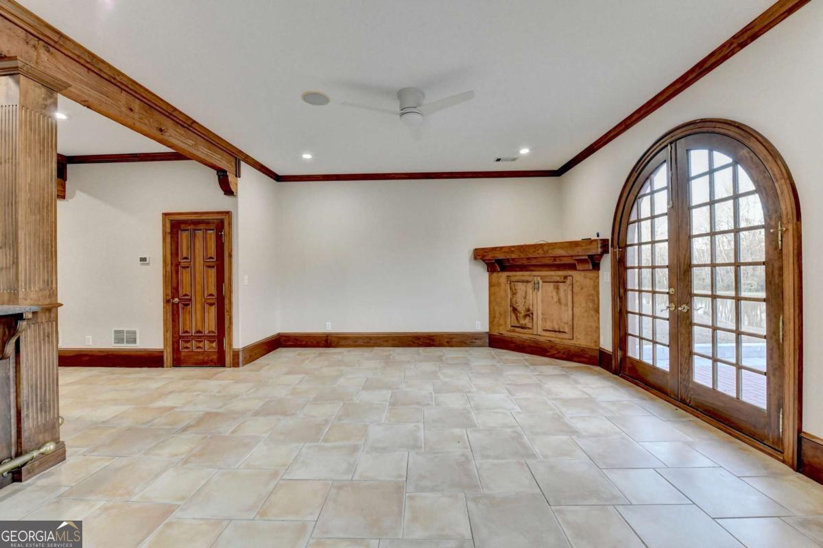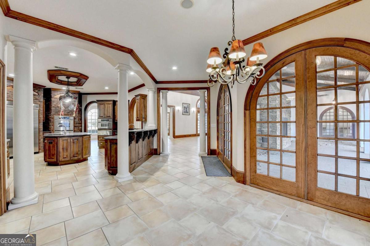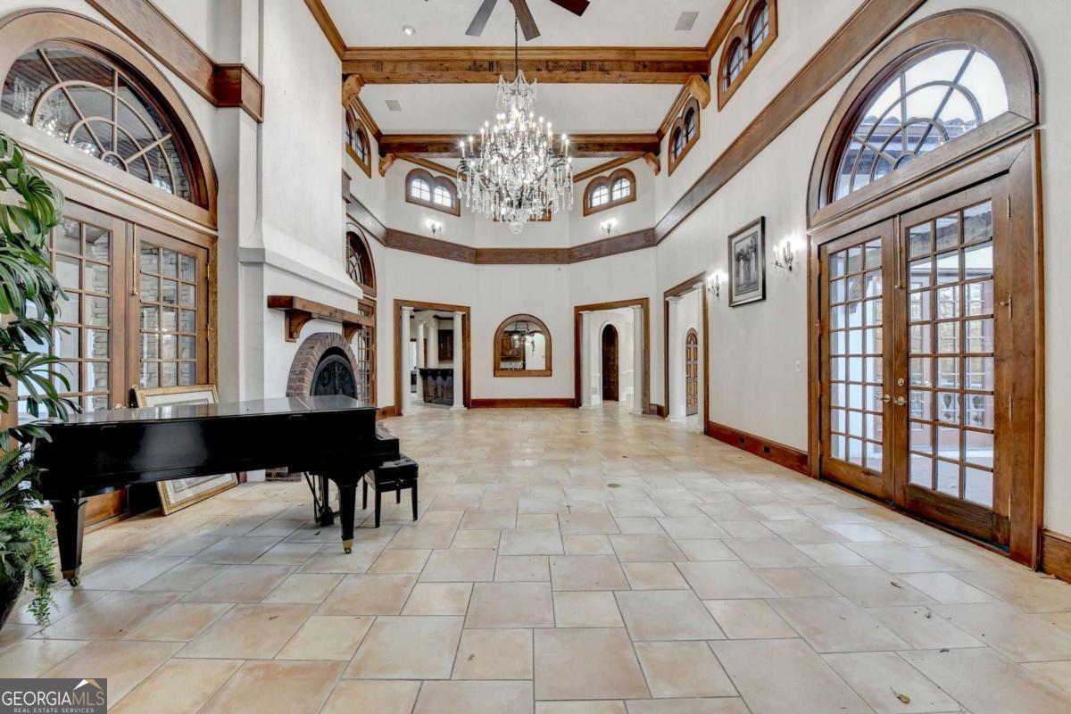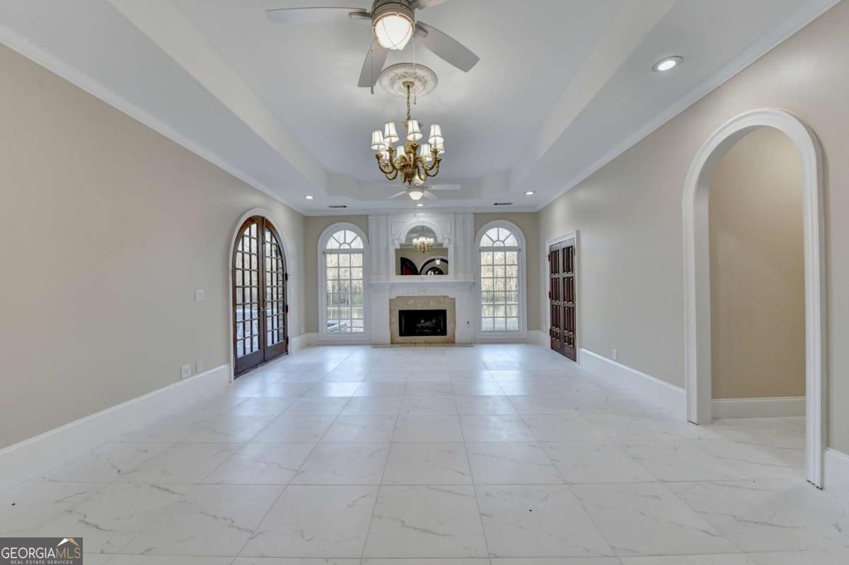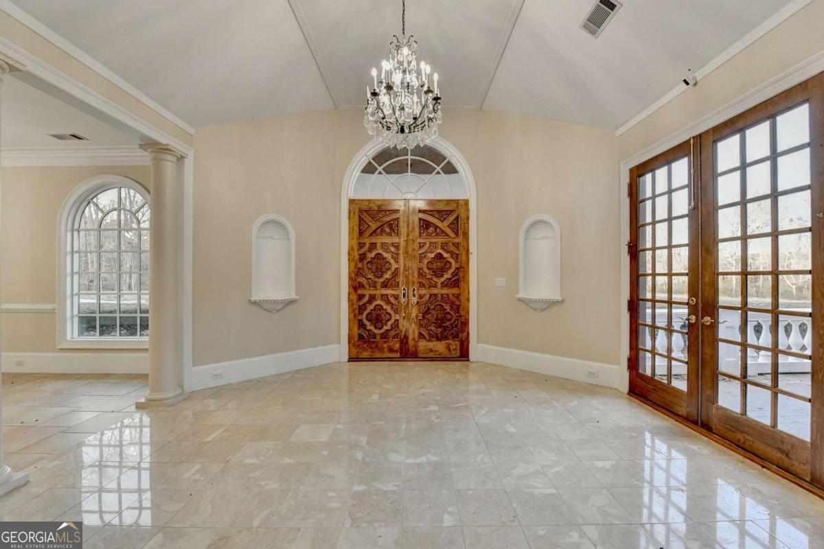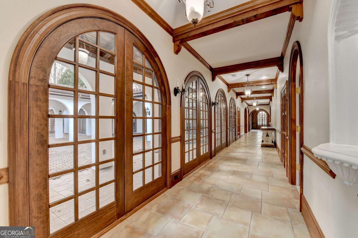 This stunning ESTATE HOME with a PRIVATE LAKE, featuring a meticulously designed Main House Overview: main house with 6,000+ sq. ft. of living space and numerous high-end amenities. Upon entering, custom-carved double wooden entry doors open into a formal solarium-style foyer, which flows into the expansive family room with a cathedral-style ceiling and cedar beams. The room is highlighted by a remote-controlled chandelier and a grand fireplace. Beautiful double doors open to a front courtyard with serene lake views, as well as a massive rear courtyard featuring a water fountain and outdoor rock fireplace. The chef-inspired kitchen is fully equipped with top-of-the-line stainless steel appliances, including a refrigerator, double ovens, microwave, warming drawer, trash compactor, wine fridge, and a Viking gas stove-ideal for any culinary enthusiast. Adjacent to the kitchen is a laundry/mudroom and a pantry that spans the length of the home, providing ample storage, a second dishwasher, and a half bath.The left wing of the home includes a half bath for guests, as well as a stately library/office, which can also serve as a 4th bedroom. This space boasts a fireplace, custom bookshelves, captain's paneling, and a private entrance to a patio with lake views. The luxurious primary suite features a sitting area with a fireplace, a private patio overlooking the lake, a wet bar, two custom closets, and a spacious ensuite bathroom with dual vanities, two toilets, a soaking tub, and a separate shower. The hallway, with arched windows and doors leading to the courtyard, connects to two additional bedrooms, each with a private bath-one featuring a covered patio with lake views. A dedicated entertainment/media room with a full bar, sauna, and lake views completes the living spaces. Throughout the home, you'll find exquisite tile floors, arched doorways, and elegant entryways, all contributing to the refined aesthetic. Guest House/Office: The guest house or office space offers a full kitchen, living room, two bedrooms, and two bathrooms. An oversized garage provides abundant storage space, and the entire guest house is designed with convenience and comfort in mind. This exceptional estate offers the perfect blend of privacy and luxury, while being conveniently located just a short drive from GA-Hwy 11, Historic Covington, Social Circle, Monroe, and minutes to I-20. This dream property is a must-see-schedule your private showing today!