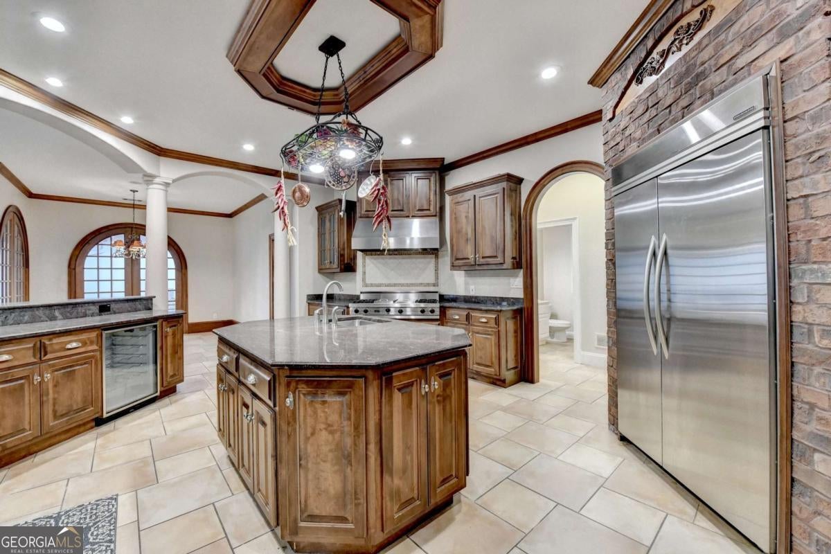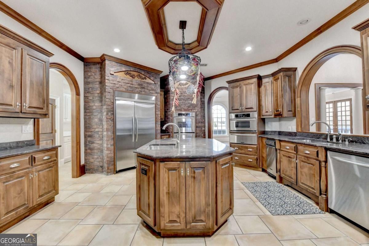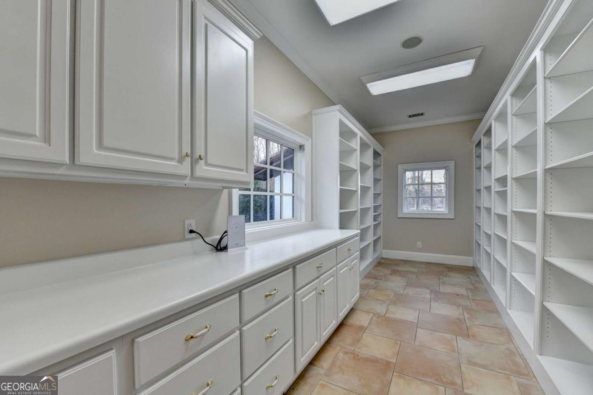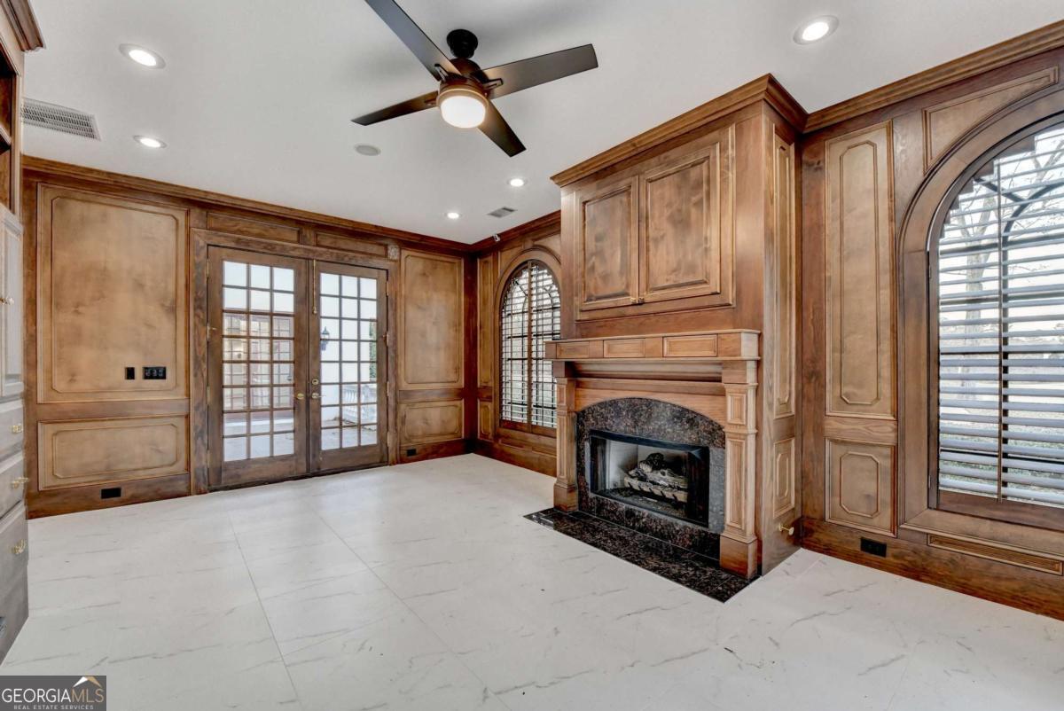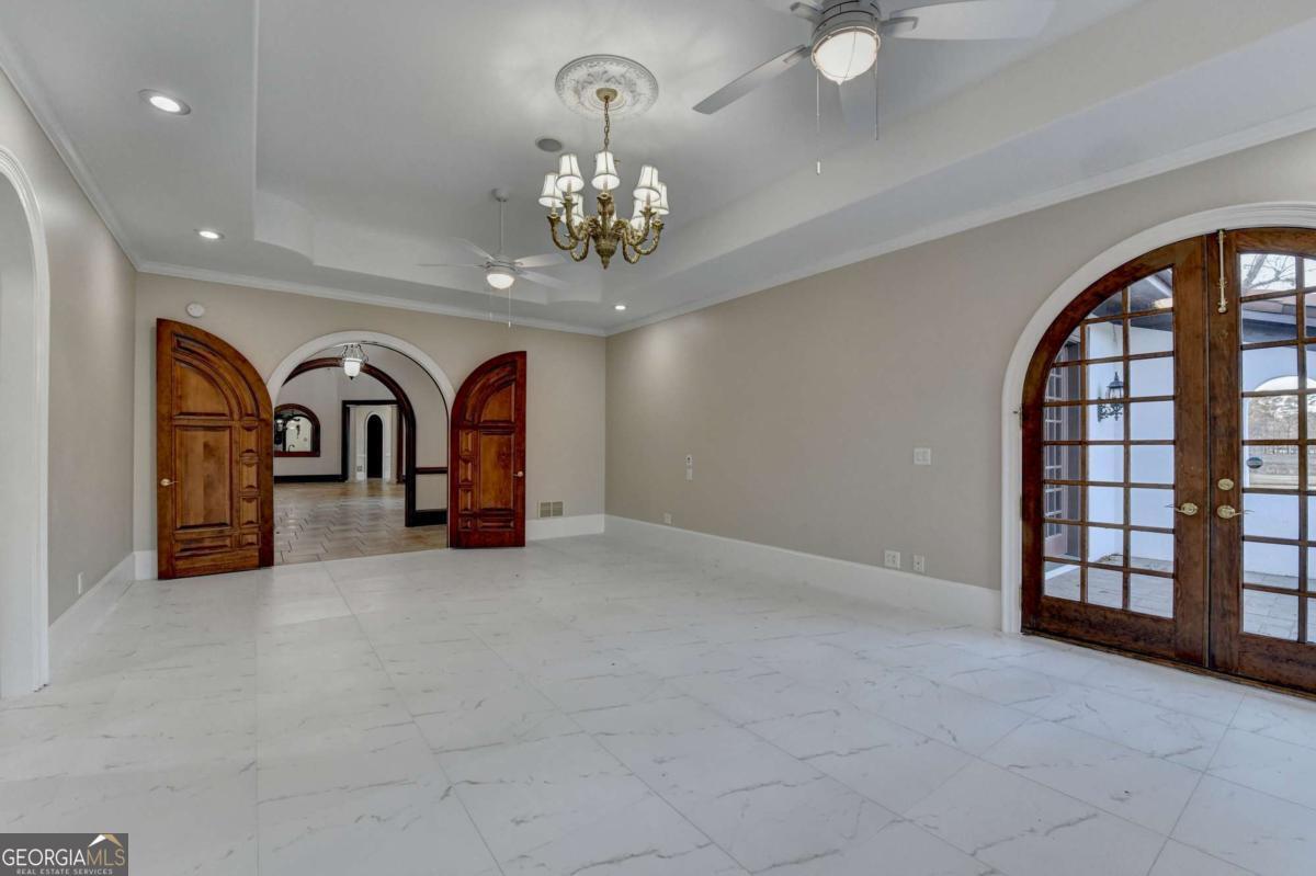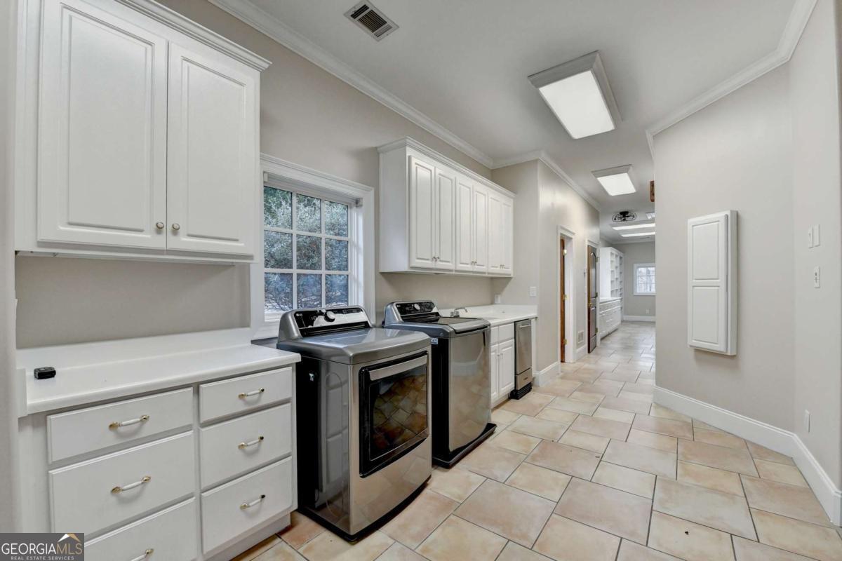 This stunning ESTATE HOME with a PRIVATE LAKE, featuring a meticulously designed Main House Overview: main house with 6,000+ sq. ft. of living space and numerous high-end amenities. Upon entering, custom-carved double wooden entry doors open into a formal solarium-style foyer, which flows into the expansive family room with a cathedral-style ceiling and cedar beams. The room is highlighted by a remote-controlled chandelier and a grand fireplace. Beautiful double doors open to a front courtyard with serene lake views, as well as a massive rear courtyard featuring a water fountain and outdoor rock fireplace. The chef-inspired kitchen is fully equipped with top-of-the-line stainless steel appliances, including a refrigerator, double ovens, microwave, warming drawer, trash compactor, wine fridge, and a Viking gas stove-ideal for any culinary enthusiast. Adjacent to the kitchen is a laundry/mudroom and a pantry that spans the length of the home, providing ample storage, a second dishwasher, and a half bath.The left wing of the home includes a half bath for guests, as well as a stately library/office, which can also serve as a 4th bedroom. This space boasts a fireplace, custom bookshelves, captain's paneling, and a private entrance to a patio with lake views. The luxurious primary suite features a sitting area with a fireplace, a private patio overlooking the lake, a wet bar, two custom closets, and a spacious ensuite bathroom with dual vanities, two toilets, a soaking tub, and a separate shower. The hallway, with arched windows and doors leading to the courtyard, connects to two additional bedrooms, each with a private bath-one featuring a covered patio with lake views. A dedicated entertainment/media room with a full bar, sauna, and lake views completes the living spaces. Throughout the home, you'll find exquisite tile floors, arched doorways, and elegant entryways, all contributing to the refined aesthetic. Guest House/Office: The guest house or office space offers a full kitchen, living room, two bedrooms, and two bathrooms. An oversized garage provides abundant storage space, and the entire guest house is designed with convenience and comfort in mind. This exceptional estate offers the perfect blend of privacy and luxury, while being conveniently located just a short drive from GA-Hwy 11, Historic Covington, Social Circle, Monroe, and minutes to I-20. This dream property is a must-see-schedule your private showing today!