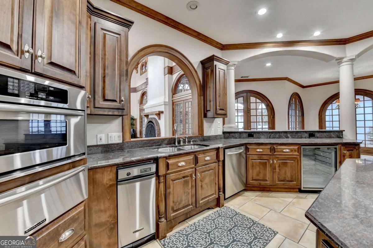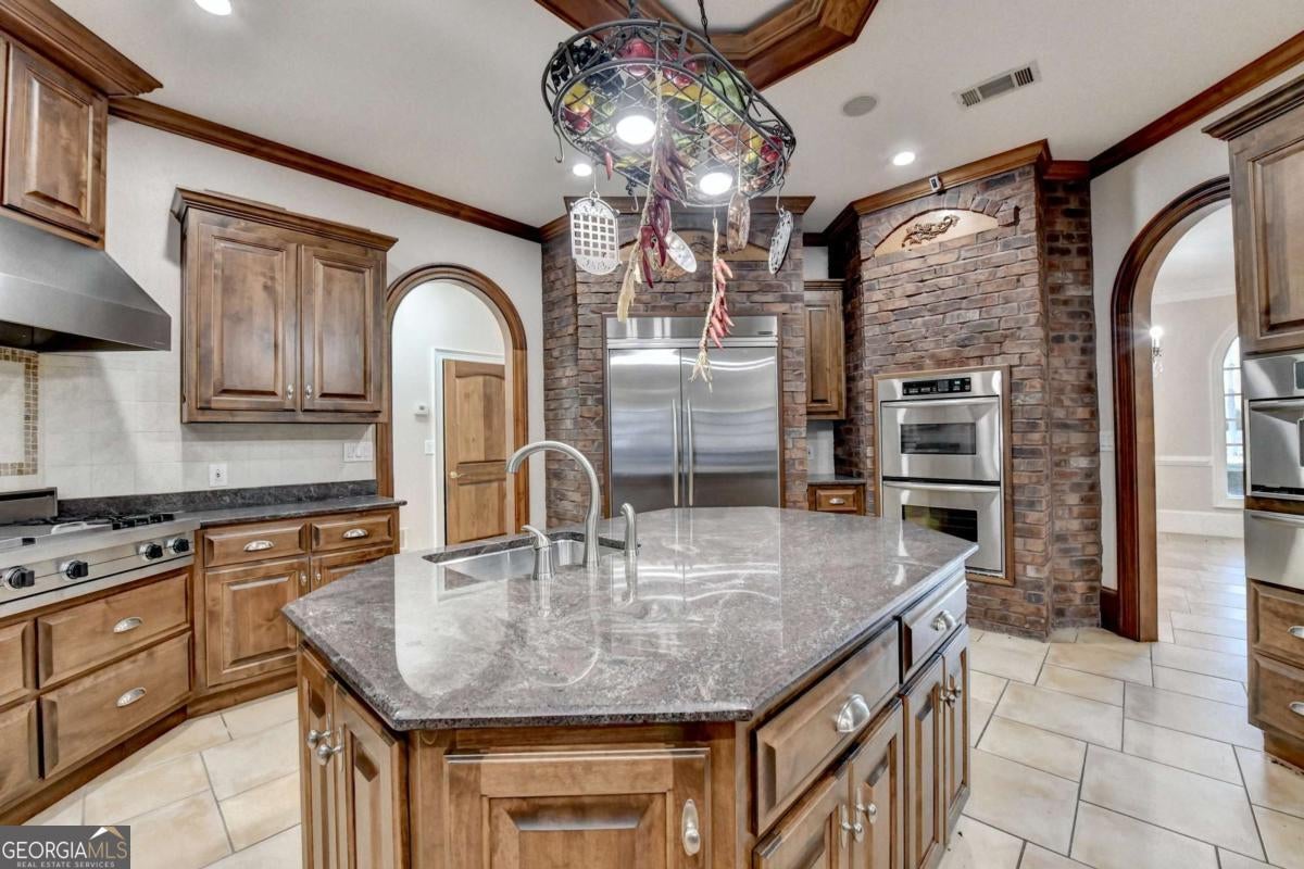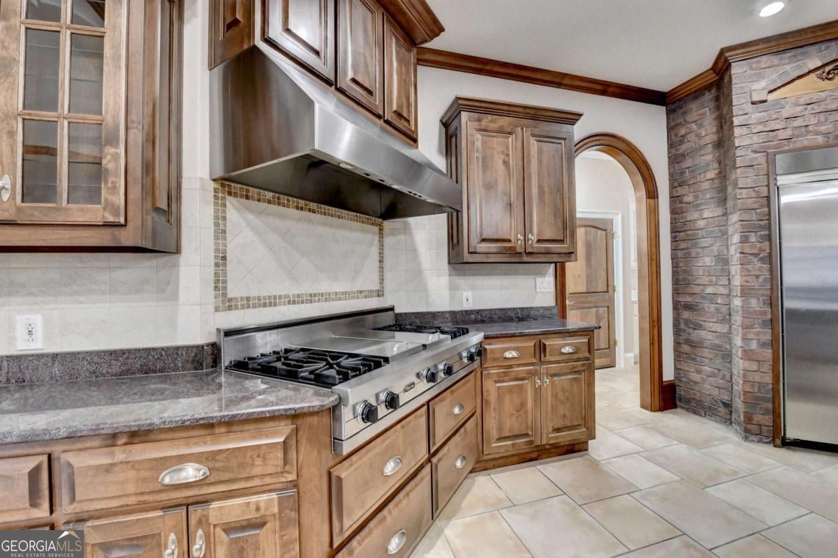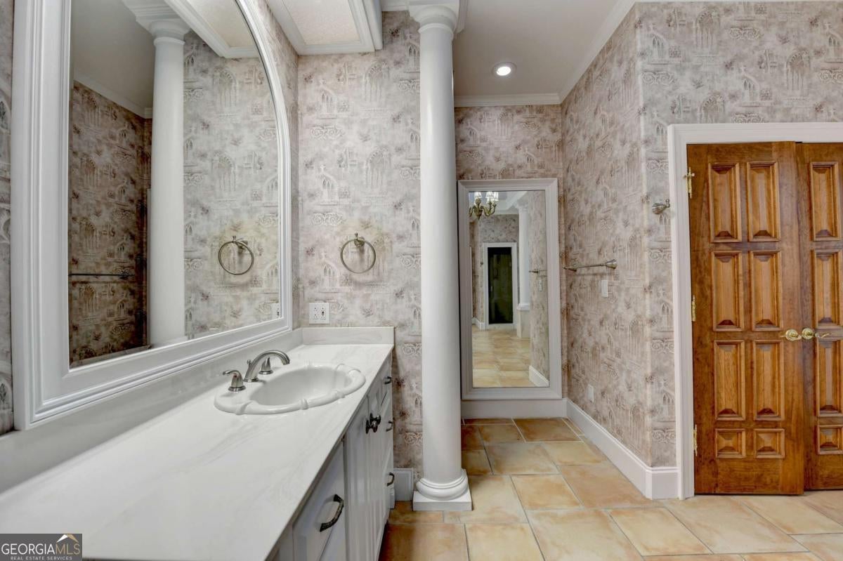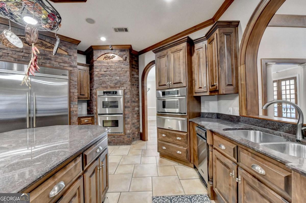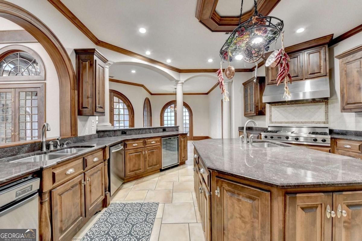 This stunning ESTATE HOME with a PRIVATE LAKE, featuring a meticulously designed Main House Overview: main house with 6,000+ sq. ft. of living space and numerous high-end amenities. Upon entering, custom-carved double wooden entry doors open into a formal solarium-style foyer, which flows into the expansive family room with a cathedral-style ceiling and cedar beams. The room is highlighted by a remote-controlled chandelier and a grand fireplace. Beautiful double doors open to a front courtyard with serene lake views, as well as a massive rear courtyard featuring a water fountain and outdoor rock fireplace. The chef-inspired kitchen is fully equipped with top-of-the-line stainless steel appliances, including a refrigerator, double ovens, microwave, warming drawer, trash compactor, wine fridge, and a Viking gas stove-ideal for any culinary enthusiast. Adjacent to the kitchen is a laundry/mudroom and a pantry that spans the length of the home, providing ample storage, a second dishwasher, and a half bath.The left wing of the home includes a half bath for guests, as well as a stately library/office, which can also serve as a 4th bedroom. This space boasts a fireplace, custom bookshelves, captain's paneling, and a private entrance to a patio with lake views. The luxurious primary suite features a sitting area with a fireplace, a private patio overlooking the lake, a wet bar, two custom closets, and a spacious ensuite bathroom with dual vanities, two toilets, a soaking tub, and a separate shower. The hallway, with arched windows and doors leading to the courtyard, connects to two additional bedrooms, each with a private bath-one featuring a covered patio with lake views. A dedicated entertainment/media room with a full bar, sauna, and lake views completes the living spaces. Throughout the home, you'll find exquisite tile floors, arched doorways, and elegant entryways, all contributing to the refined aesthetic. Guest House/Office: The guest house or office space offers a full kitchen, living room, two bedrooms, and two bathrooms. An oversized garage provides abundant storage space, and the entire guest house is designed with convenience and comfort in mind. This exceptional estate offers the perfect blend of privacy and luxury, while being conveniently located just a short drive from GA-Hwy 11, Historic Covington, Social Circle, Monroe, and minutes to I-20. This dream property is a must-see-schedule your private showing today!
