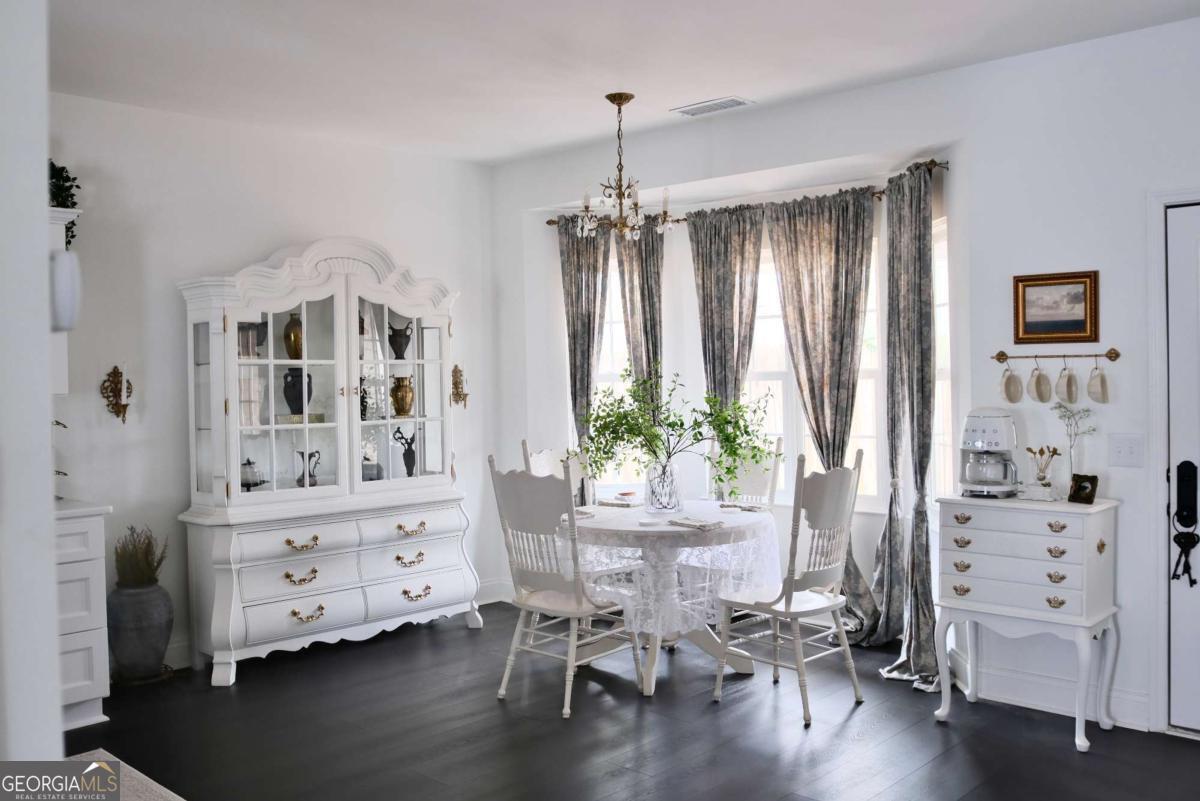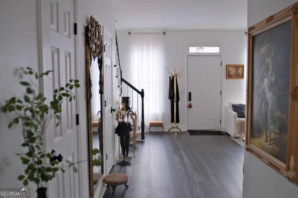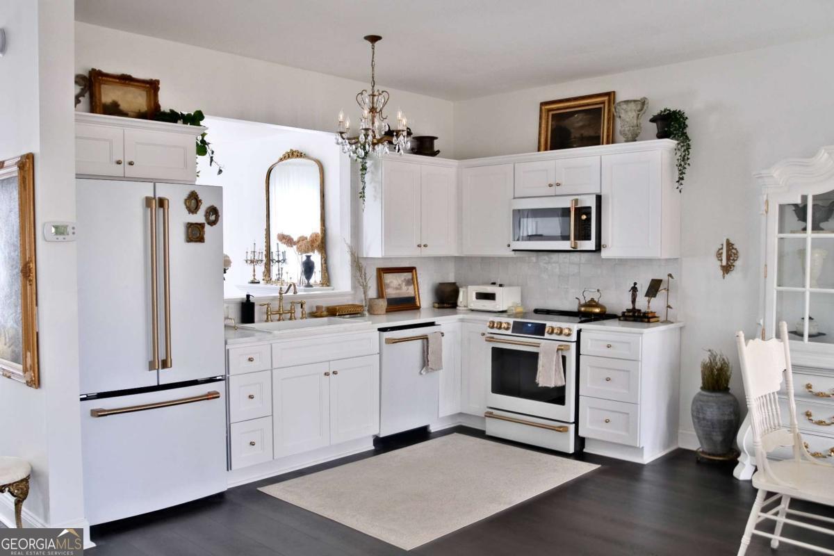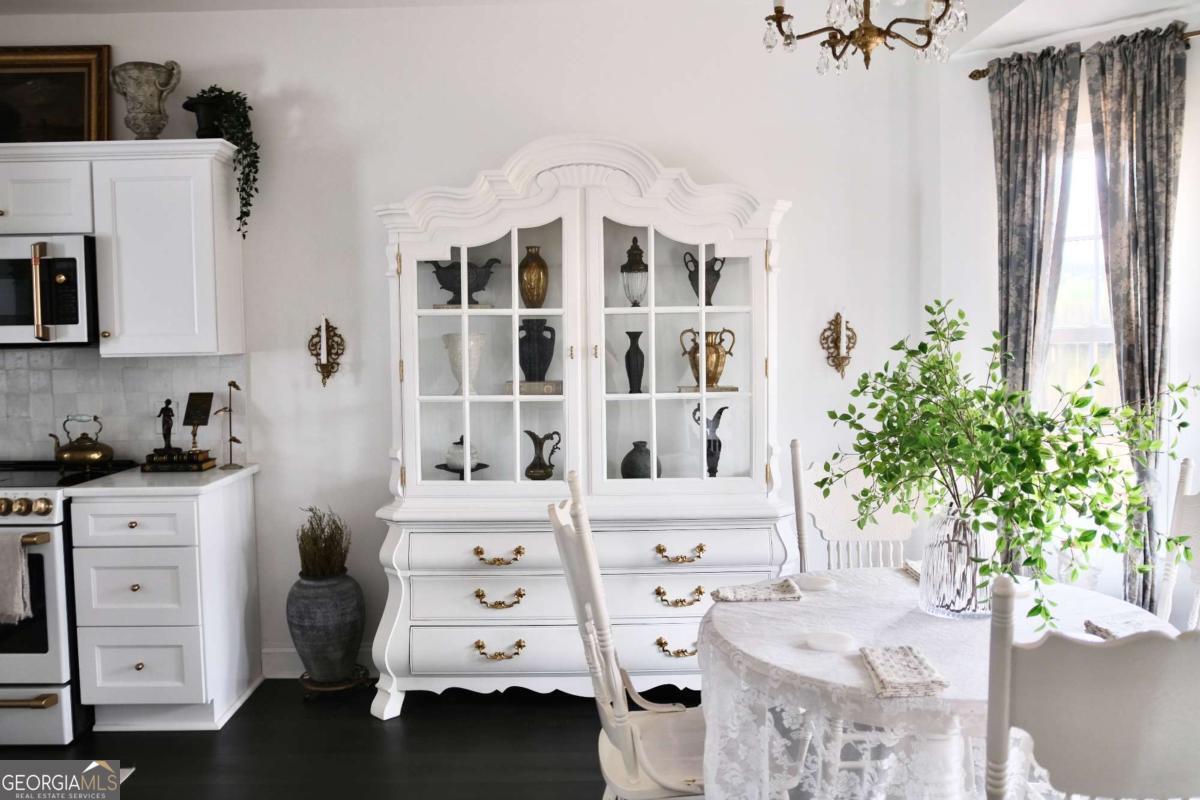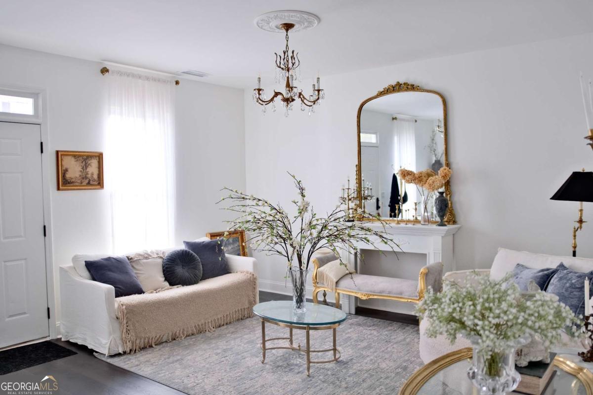 Just steps from Dahlonega's Historic Square, this beautifully renovated end-unit townhouse offers rare walkability to wine tasting rooms, boutiques, and seasonal festivities. Updates include luxury vinyl flooring throughout, all-new energy-efficient windows, new water heater, designer lighting with authentic French fixtures, and fresh Benjamin Moore + Farrow & Ball paint. The dream kitchen features marble countertops, CAFE appliances, custom soft-close cabinetry, handcrafted Zellige tile, farmhouse sink, and a charming bay-window nook with antique hutch. Bathrooms include brass fixtures, new toilets, and curated antique mirrors. LG washer/dryer included. As a coveted end unit, enjoy 3 private parking spaces - exceptionally rare for this location. HOA provides landscaping, exterior maintenance, trash, pest control, and community insurance for easy ownership. A perfect blend of old-world romance and modern convenience. Move-in ready and truly turnkey - homes like this inside city limits are extremely limited and do not last long.