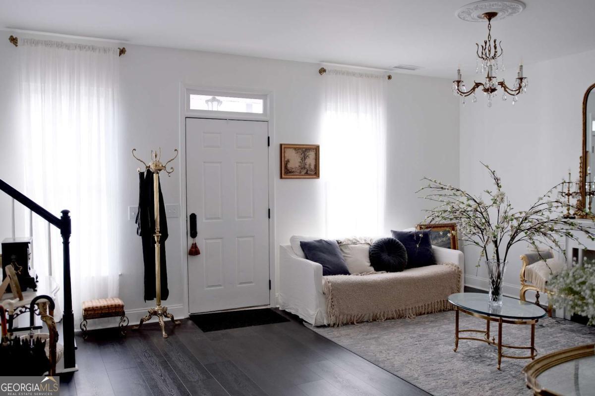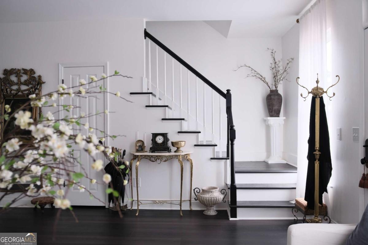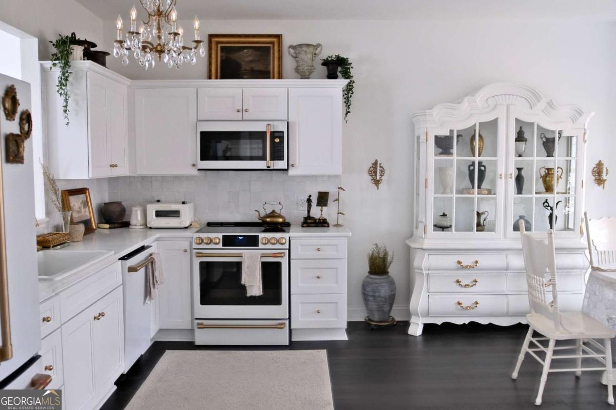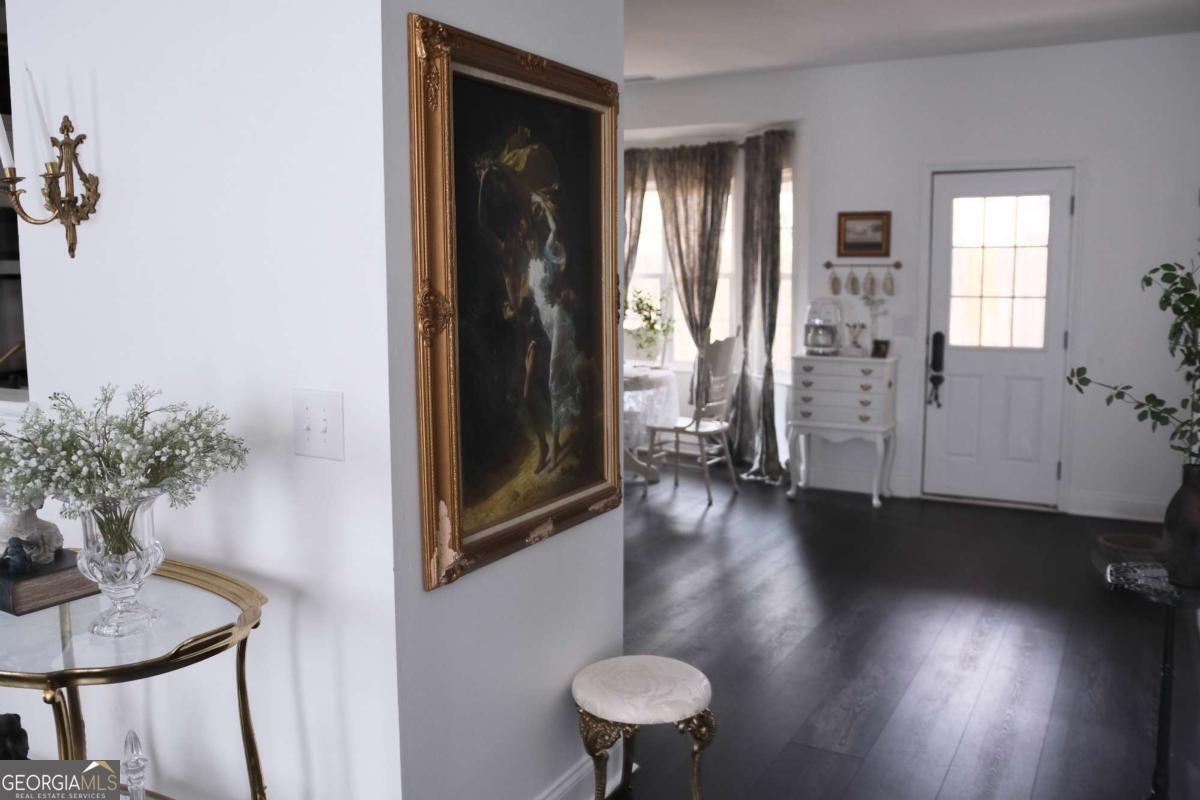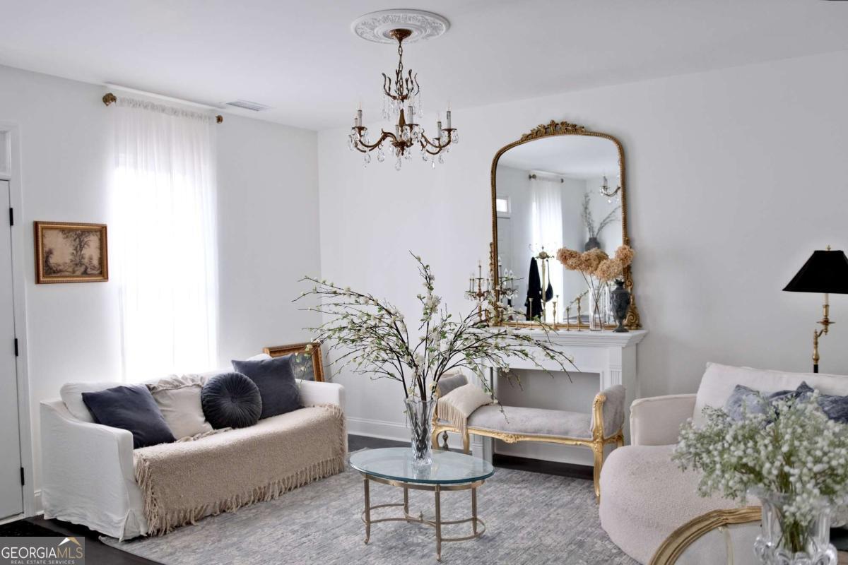 Just steps from Dahlonega's Historic Square, this beautifully renovated end-unit townhouse offers rare walkability to wine tasting rooms, boutiques, and seasonal festivities. Updates include luxury vinyl flooring throughout, all-new energy-efficient windows, new water heater, designer lighting with authentic French fixtures, and fresh Benjamin Moore + Farrow & Ball paint. The dream kitchen features marble countertops, CAFE appliances, custom soft-close cabinetry, handcrafted Zellige tile, farmhouse sink, and a charming bay-window nook with antique hutch. Bathrooms include brass fixtures, new toilets, and curated antique mirrors. LG washer/dryer included. As a coveted end unit, enjoy 3 private parking spaces - exceptionally rare for this location. HOA provides landscaping, exterior maintenance, trash, pest control, and community insurance for easy ownership. A perfect blend of old-world romance and modern convenience. Move-in ready and truly turnkey - homes like this inside city limits are extremely limited and do not last long.