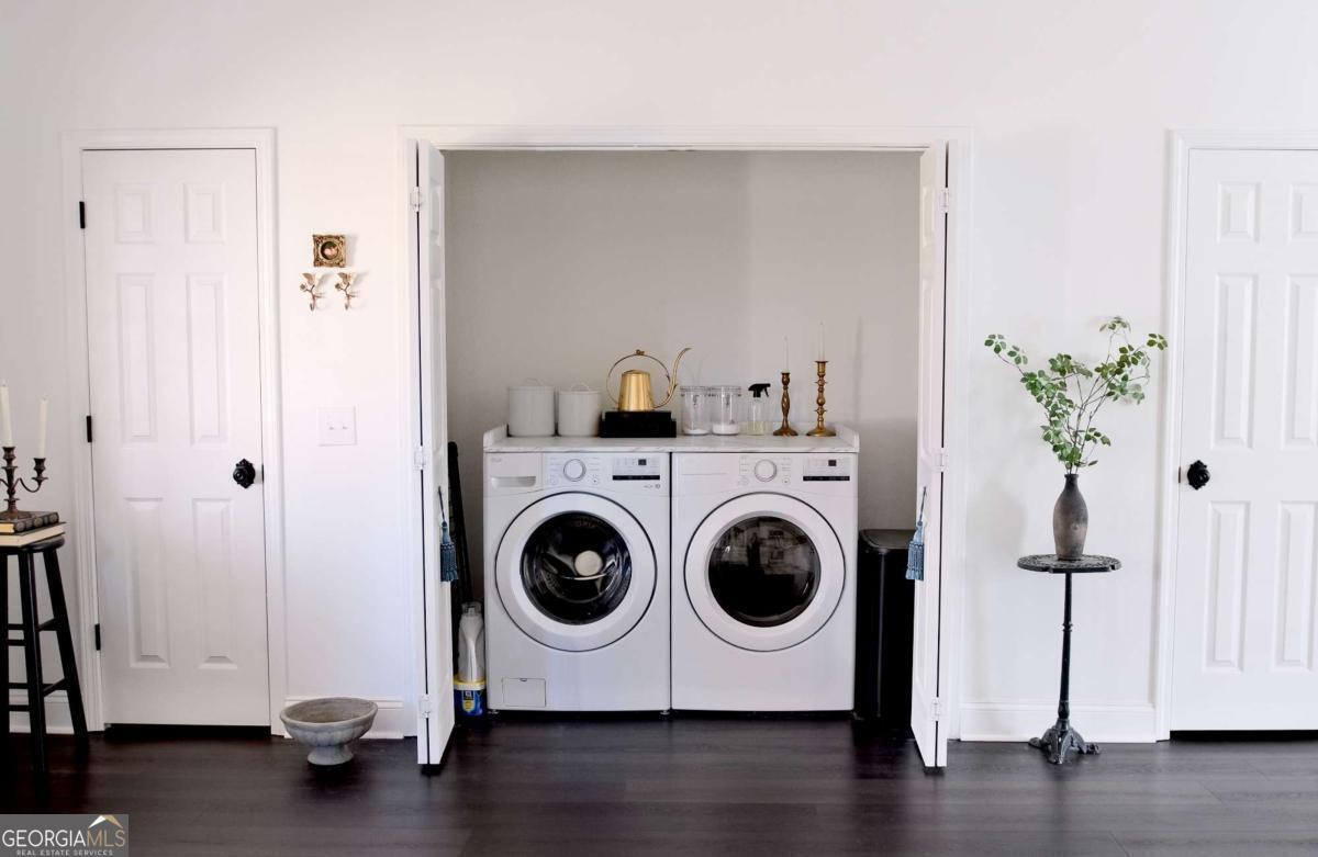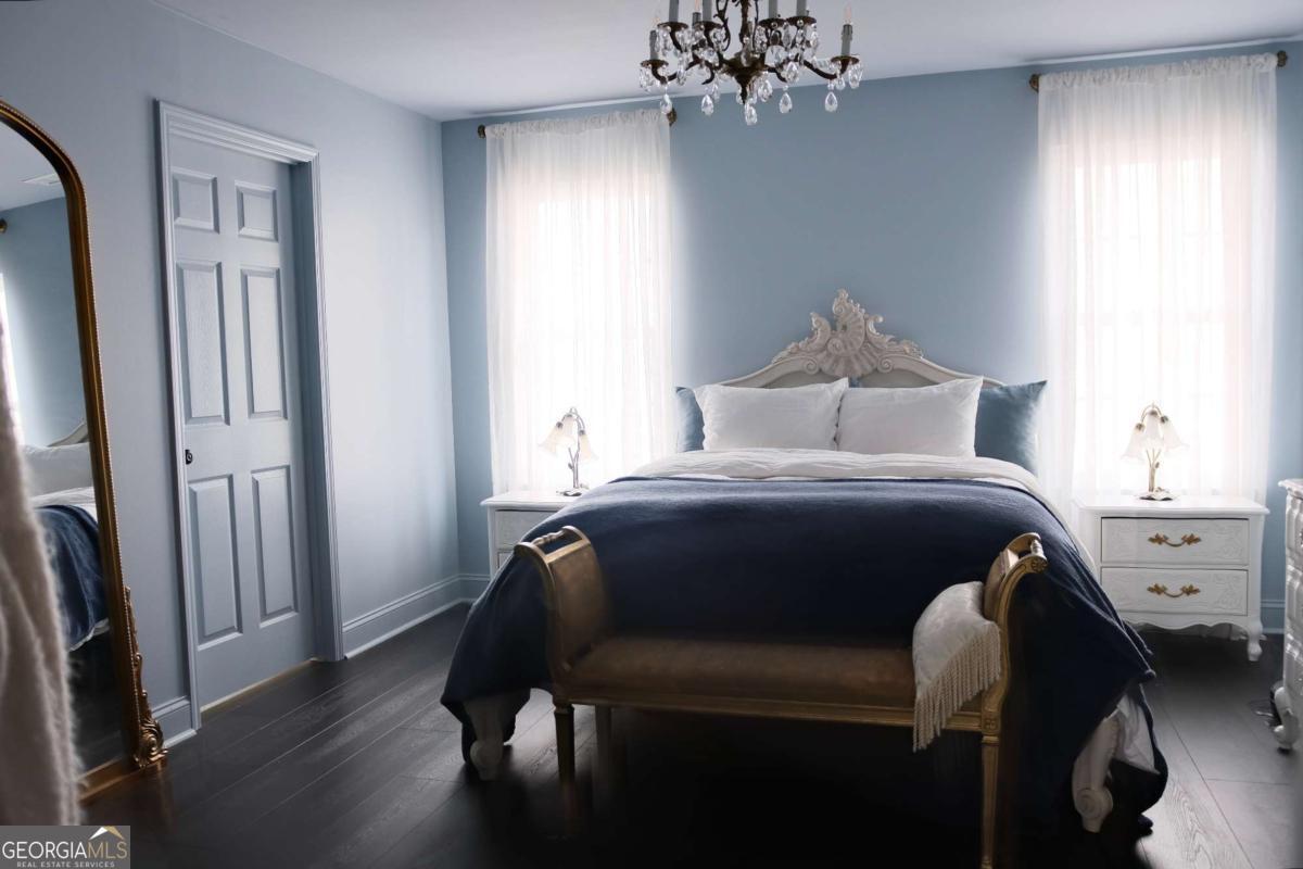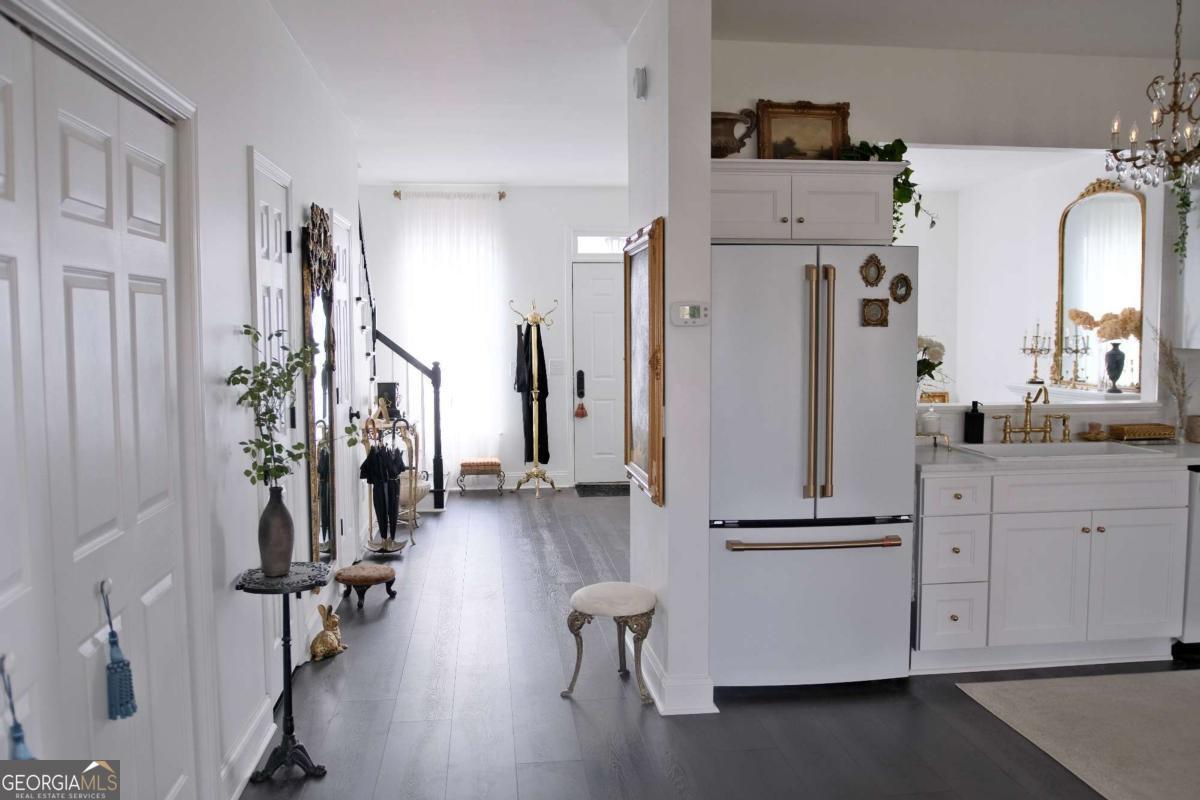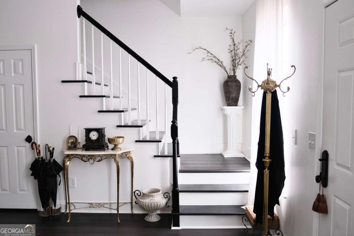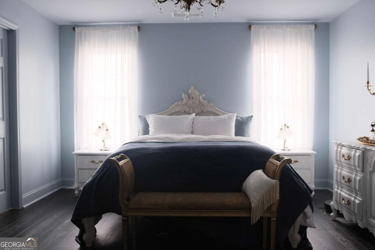 Just steps from Dahlonega's Historic Square, this beautifully renovated end-unit townhouse offers rare walkability to wine tasting rooms, boutiques, and seasonal festivities. Updates include luxury vinyl flooring throughout, all-new energy-efficient windows, new water heater, designer lighting with authentic French fixtures, and fresh Benjamin Moore + Farrow & Ball paint. The dream kitchen features marble countertops, CAFE appliances, custom soft-close cabinetry, handcrafted Zellige tile, farmhouse sink, and a charming bay-window nook with antique hutch. Bathrooms include brass fixtures, new toilets, and curated antique mirrors. LG washer/dryer included. As a coveted end unit, enjoy 3 private parking spaces - exceptionally rare for this location. HOA provides landscaping, exterior maintenance, trash, pest control, and community insurance for easy ownership. A perfect blend of old-world romance and modern convenience. Move-in ready and truly turnkey - homes like this inside city limits are extremely limited and do not last long.