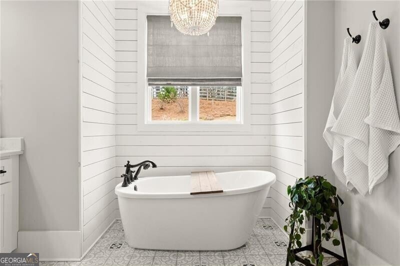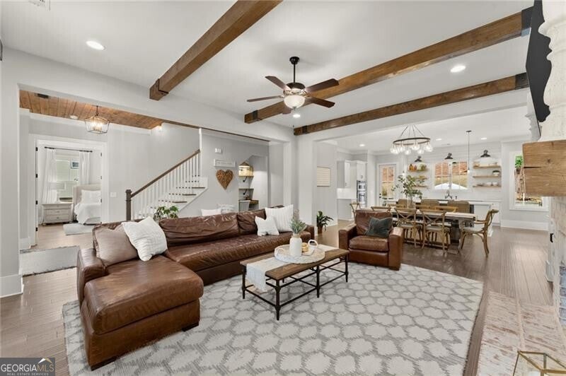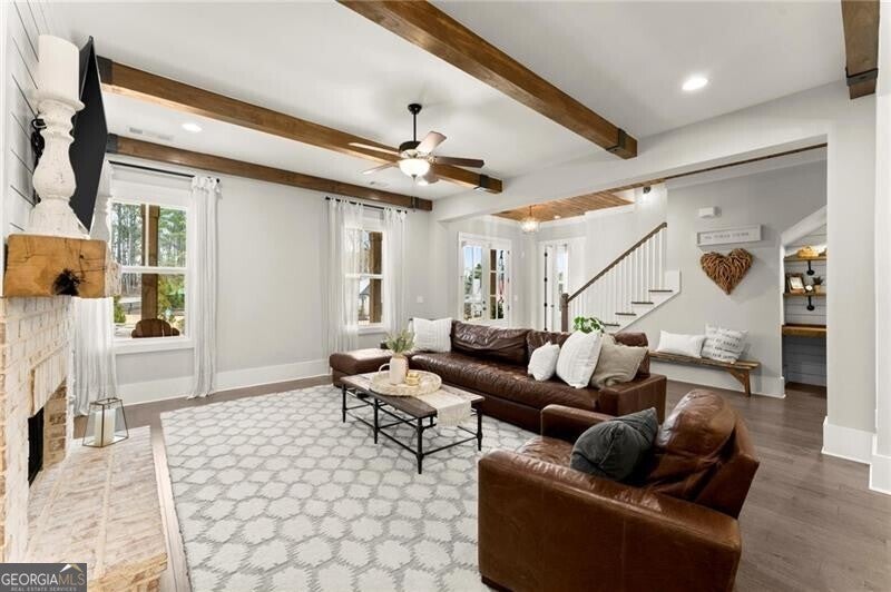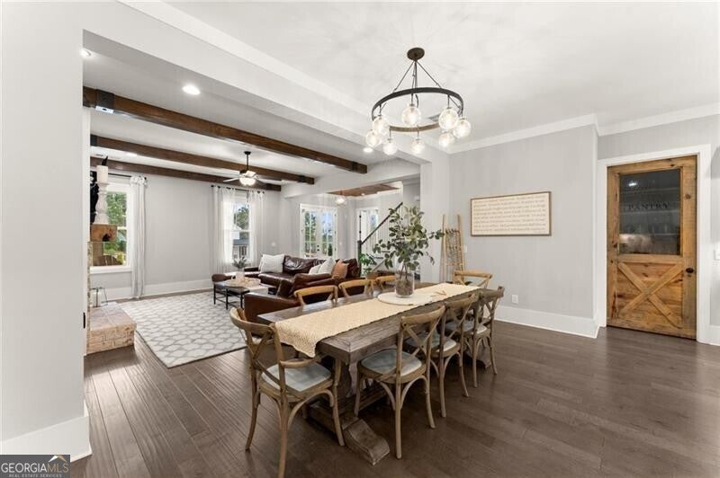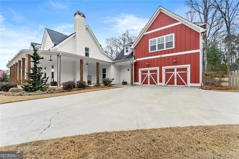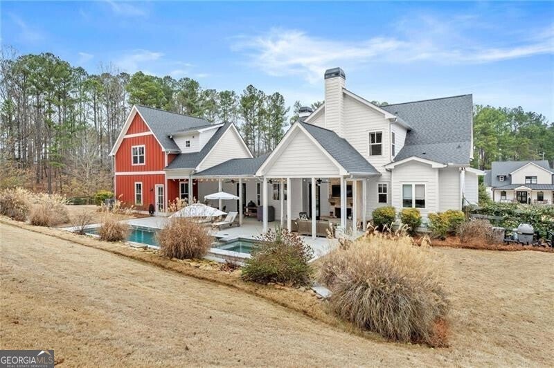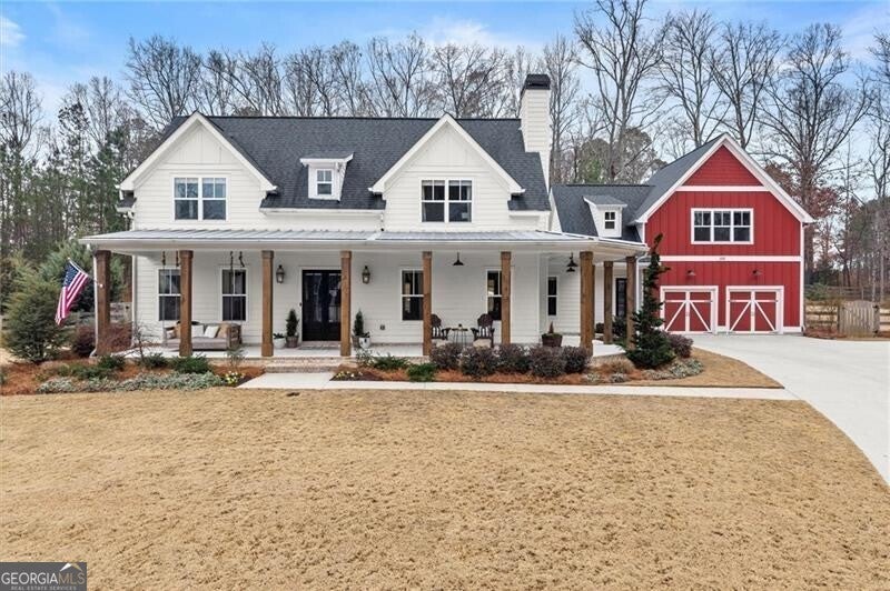 Forget the standard 'welcome home' - this is a masterclass in modern farmhouse living. Perfectly situated on a professionally landscaped, level lot, this remarkable residence blends sophistication with charm, offering an unparalleled lifestyle in a sought-after location. The open-concept main level is built for effortless living and grand entertaining. At its core: a true chef's kitchen, featuring stainless steel appliances, a spacious walk-in pantry, and sleek finishes. The great room is a showstopper, anchored by a cozy fireplace and stunning beamed ceilings; it's just the spot for gathering, entertaining, or relaxing. A conveniently oversized mudroom adds practical elegance to daily routines while keeping the chaos of daily life out of sight. The generous primary suite on the main floor provides a private sanctuary, complete with a luxurious master bath and a serene soaking tub. Upstairs, three additional bedrooms and two baths offer ample space for family or guests. A fifth bedroom is perched over the garage, private and complete with a full bath and additional storage. This oversized space is perfect for multi-generational living, a home office, workout room, or whatever you can dream up! Step outside to your private oasis. The resort-style grounds boast a sparkling pool and spa, complemented by a cozy firepit area, a covered patio and ample dining space, creating the perfect backdrop for relaxation or gatherings. Zoned within the top-tier Sequoyah school district and just minutes away from downtown Woodstock's vibrant shopping, dining, music venues, and nightlife, this home is its own destination. Welcome to luxury living in a space that doesn't just meet expectations: it redefines them.