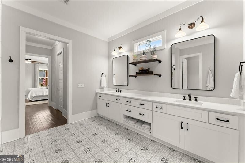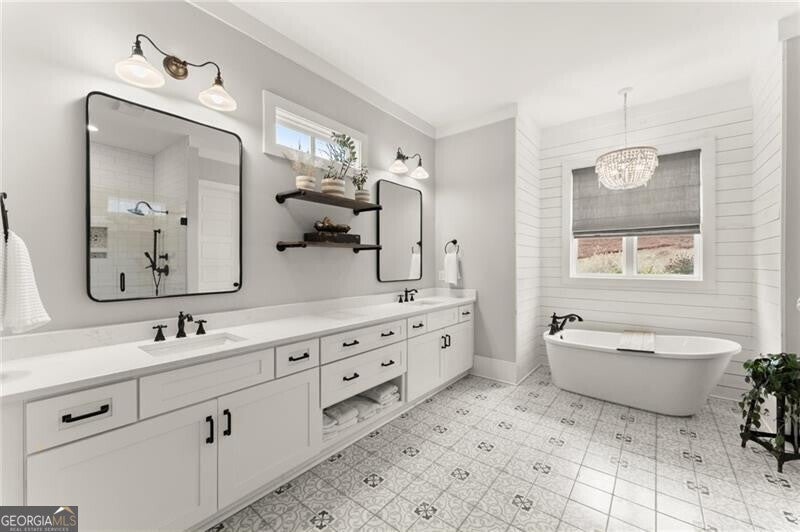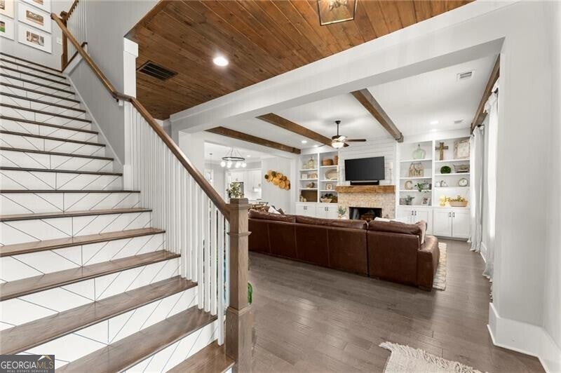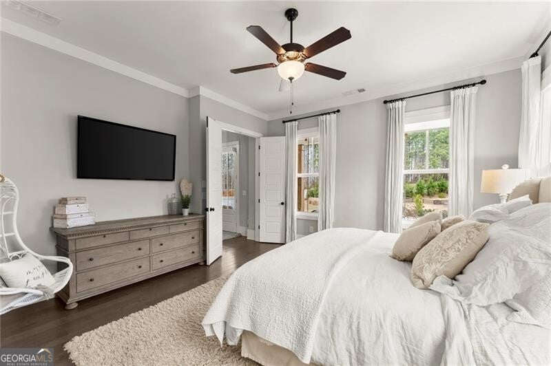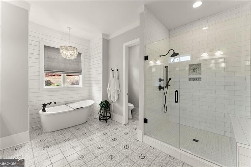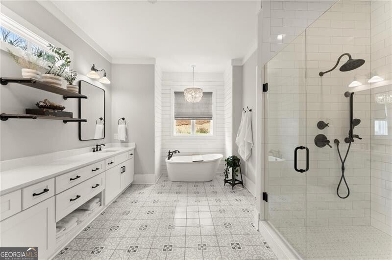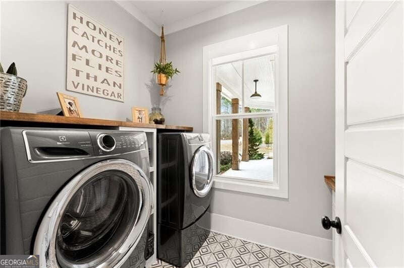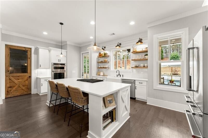 Forget the standard 'welcome home' - this is a masterclass in modern farmhouse living. Perfectly situated on a professionally landscaped, level lot, this remarkable residence blends sophistication with charm, offering an unparalleled lifestyle in a sought-after location. The open-concept main level is built for effortless living and grand entertaining. At its core: a true chef's kitchen, featuring stainless steel appliances, a spacious walk-in pantry, and sleek finishes. The great room is a showstopper, anchored by a cozy fireplace and stunning beamed ceilings; it's just the spot for gathering, entertaining, or relaxing. A conveniently oversized mudroom adds practical elegance to daily routines while keeping the chaos of daily life out of sight. The generous primary suite on the main floor provides a private sanctuary, complete with a luxurious master bath and a serene soaking tub. Upstairs, three additional bedrooms and two baths offer ample space for family or guests. A fifth bedroom is perched over the garage, private and complete with a full bath and additional storage. This oversized space is perfect for multi-generational living, a home office, workout room, or whatever you can dream up! Step outside to your private oasis. The resort-style grounds boast a sparkling pool and spa, complemented by a cozy firepit area, a covered patio and ample dining space, creating the perfect backdrop for relaxation or gatherings. Zoned within the top-tier Sequoyah school district and just minutes away from downtown Woodstock's vibrant shopping, dining, music venues, and nightlife, this home is its own destination. Welcome to luxury living in a space that doesn't just meet expectations: it redefines them.