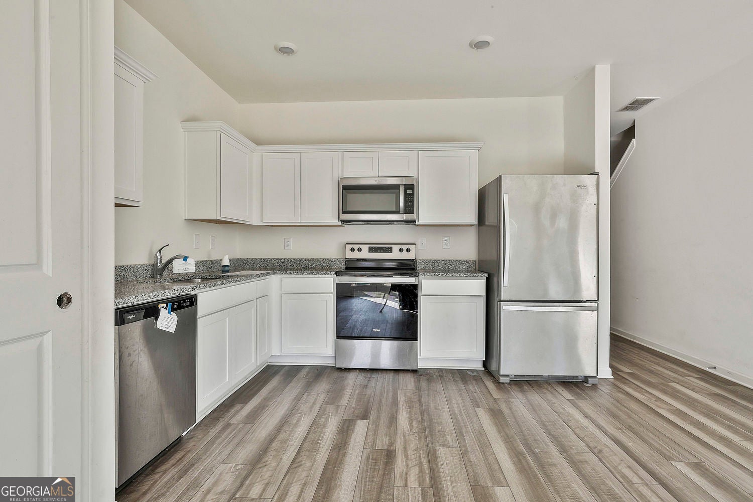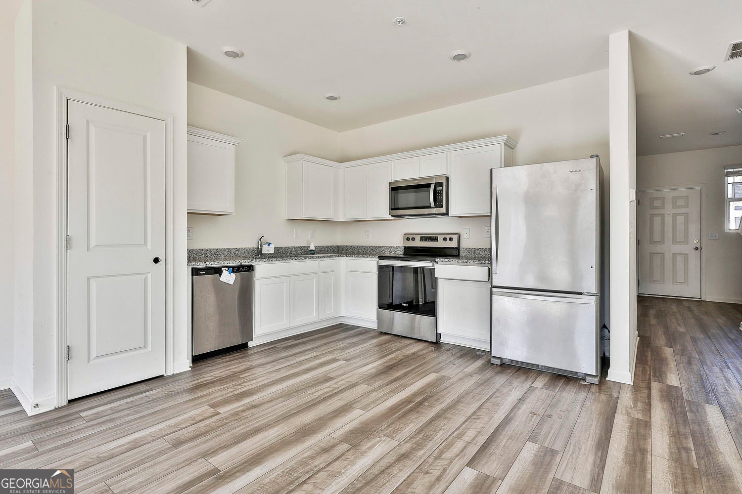 Spacious end-unit townhome offering modern design, functionality, and flexibility. Built in 2024, this home features a bright, open floor plan with a welcoming foyer, vaulted ceilings, luxury vinyl plank flooring, LED lighting, and Shaw carpet in the bedrooms. Granite countertops throughout add a clean, timeless finish to the kitchen and baths, while the open layout makes everyday living and entertaining easy. The kitchen is equipped with Whirlpool stainless steel appliances, including a washer and dryer conveniently located upstairs. As an end unit, this home enjoys added privacy and a larger yard, which is fully sodded, with lawn care included. The extended driveway and app-enabled garage door opener add to the home's everyday convenience. The community is well located with easy access to parks, shopping, restaurants, and the interstate, making commuting and daily errands simple. Be sure to check out the 3D virtual tour to explore the layout before you visit! Case #106-527394. HUD HOME sold AS IS. Equal housing opportunity.