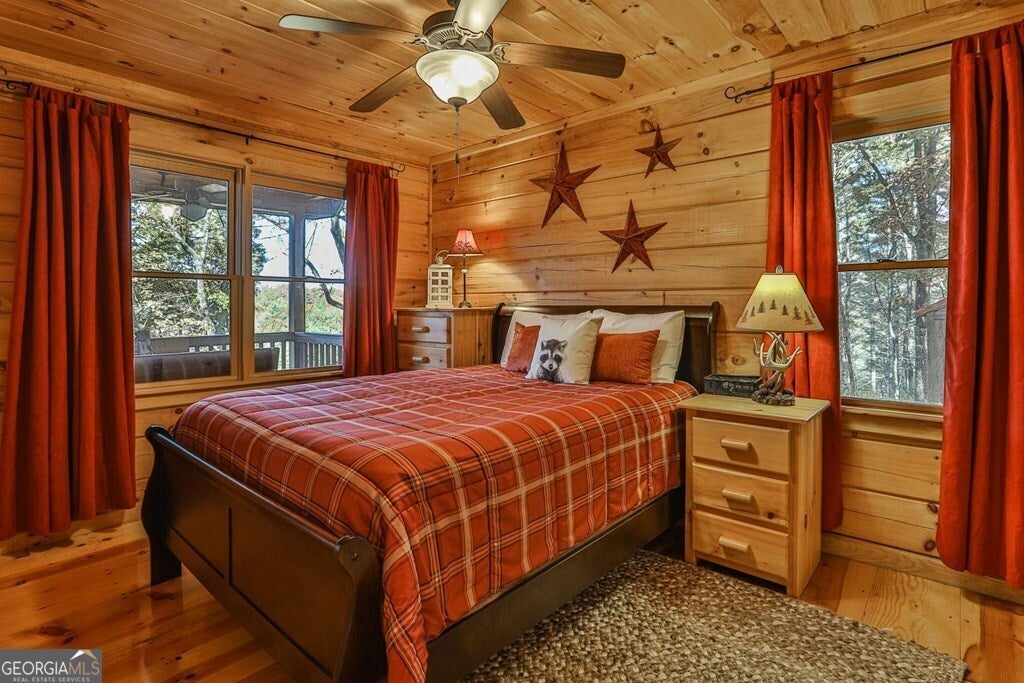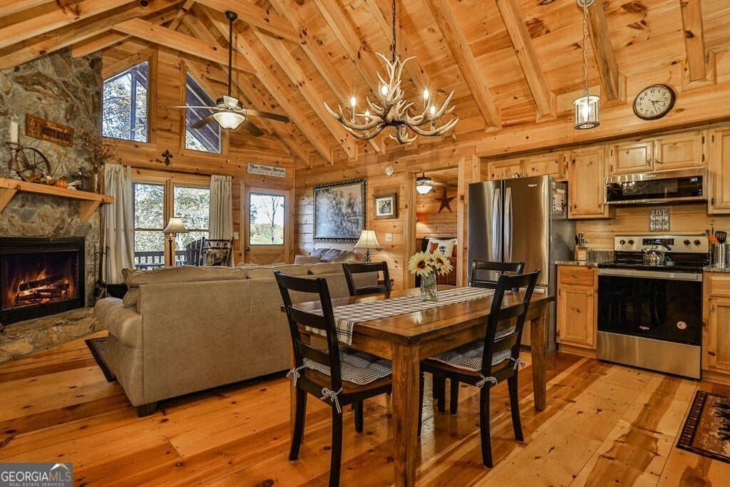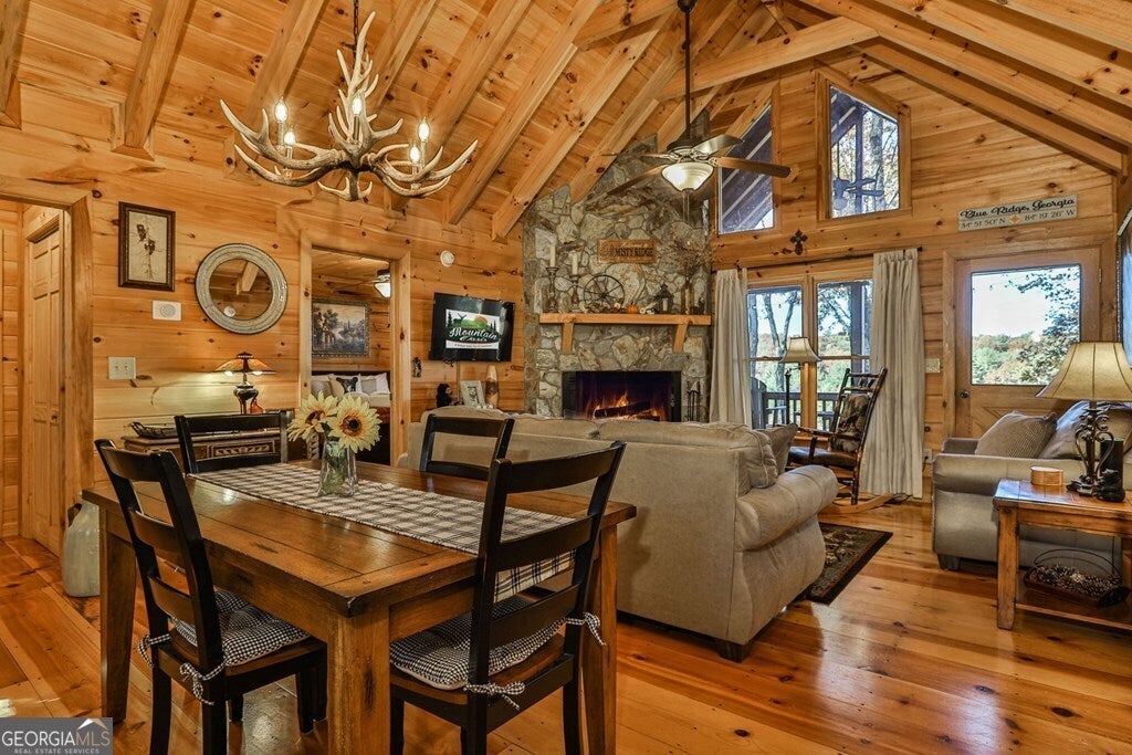^Adirondack Style Cozy Mountain Cabin^ This picture perfect postcard setting is the dream mountain escape. Real log cabin featuring 2BR's, 2BA's, both ensuites, w/ open concept living, kitchen & dining in between opening onto large, covered porch across the entire front of home overlooking gorgeous mountain views in the distance. From the time you pull in the driveway you'll be in love. The moment you step inside you'll feel the grandness of the soaring cathedral ceilings through the great rm/dining rm/kitchen area highlighted by exposed beam rafters & fixed glass windows on both gable ends allowing for great natural light. Wood floors throughout w/ custom kitchen cabinetry, granite countertops & stainless appliances. Upgraded lighting throughout including antler chandelier in the dining room area. Located in popular Cherry Log Mountain conveniently located centrally between Blue Ridge & Ellijay in prime ideal location. Enjoy access to several private community lakes great for fishing or canoeing + access to the Benton MacKaye Hiking Trail which runs through the community allowing for easy access. Travel time to either downtown Blue Ridge or Ellijay is less than 15 minutes. Enjoy the "great outdoors" in the evening roasting marshmallows by the outdoor rock firepit. This cabin is an established STR property & would make a prime investment & second home. Allow your investment to be paid for by others! Outbuilding great for extra storage also included in sale.
