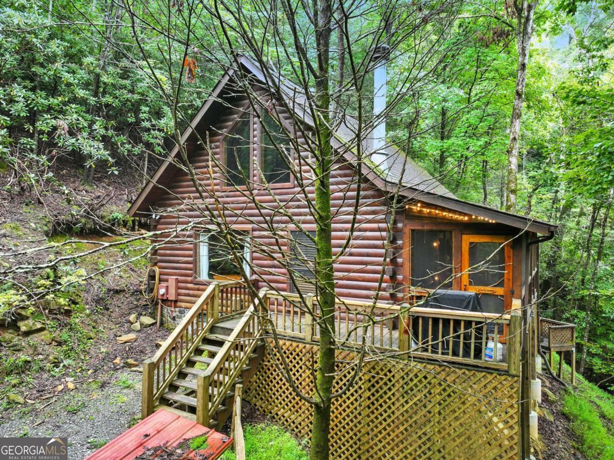 Your riverfront retreat awaits with this inviting 3-bedroom, 2-bath cabin perched on the Ellijay River, offering the ideal blend of tranquility, recreation, and convenience. Whether you're seeking a private mountain escape, a full-time residence, or a proven turnkey rental, this home is ready to deliver. Step inside this true log cabin to find a warm and inviting interior featuring a floor-to-ceiling stone wood-burning fireplace in the cozy living area. The rustic kitchen stainless steel appliances with a beautiful hammered metal farmhouse sink and dining space next to a large picture window. The main floor has two bedrooms, one overlooking the river, and a full bath with custom vessel sink, and a laundry closet. The upstairs loft has a king bed, cozy nook, its own arcade gaming system that is fun for all ages, plus a beautiful bathroom with tiled shower. Outdoor living is where this property truly shines. Sip morning coffee on the screened porch, soak in the hot tub under the stars, or unwind by the private fire pit right at the river's edge. Head down the steps to the riverfront dock that offers excellent fishing or the perfect spot for simply listening to the soothing sounds of flowing water. Nestled in a charming community that greets you with a quaint covered bridge, the cabin feels worlds away, yet you're just minutes from hiking in the Chattahoochee National Forest, apple orchards, wineries, and the boutique shops and variety of dining found in Historic Downtown Ellijay and Blue Ridge. This cabin comes fully furnished and turnkey making it move-in or rental ready from day one. Your riverfront retreat awaits!