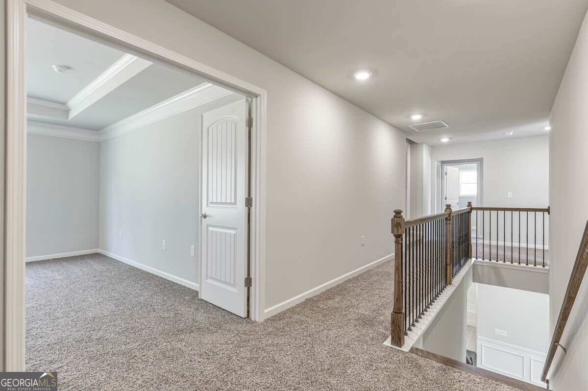 Introducing the Edinburgh, a two-story plan offered at the Thalley Creek Estates in Cumming, GA. The 3,557 square foot home boasts 5 bedrooms, 4 bathrooms, and a two-car garage. The two unique exterior elevations ensure variety and style options to suit a range of preferences. The Edinburgh aims to immediately impress when you step off of the front porch into a two-story foyer. The adjacent formal dining room flaunts coffered ceilings and a large window shaded by the front porch. The space would also make a handsome office to better suit the needs of the homeowners. A large powder bathroom is tucked away but still convenient for guests to use. The stunning kitchen flows seamlessly into a breakfast nook and spacious family room with trey ceilings and a stunning stacked-stone, wood-burning fireplace. The kitchen itself will stop anyone in their tracks with its oversized island, shaker-style cabinets, granite countertops, stainless-steel appliance suite, and corner pantry. The primary suite's large bedroom is complimented by a bathroom with a dual vanity, tiled shower, and separate soaking tub and an adjoining walk-in closet. Upstairs are three additional bedrooms, each with their own walk-in closet, and two full bathrooms. The loft space at the top of the stairwell is primed to serve as a game room or additional living space. Contact us today if the Edinburgh is your perfect fit at the Thalley Creek Estates!
