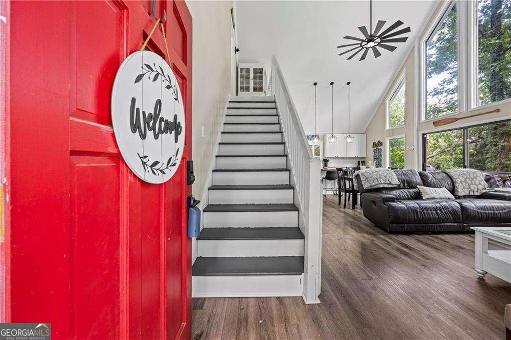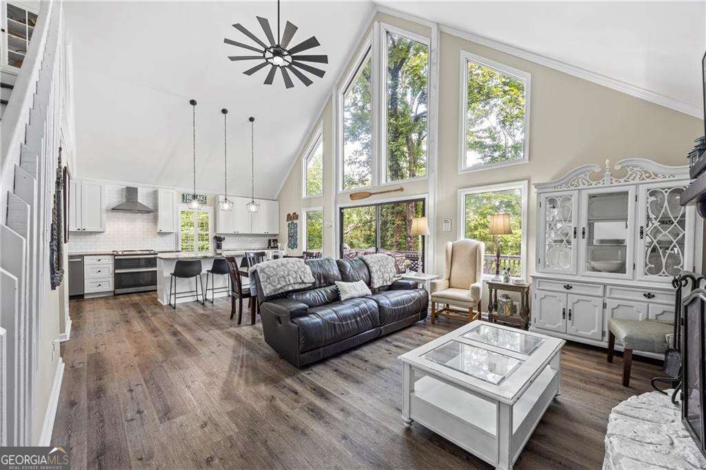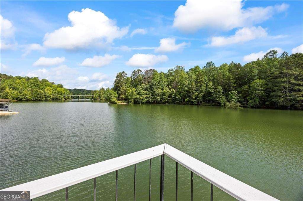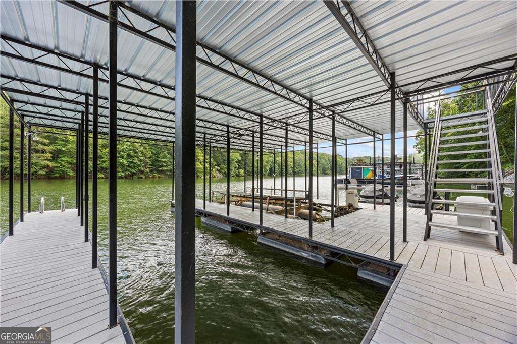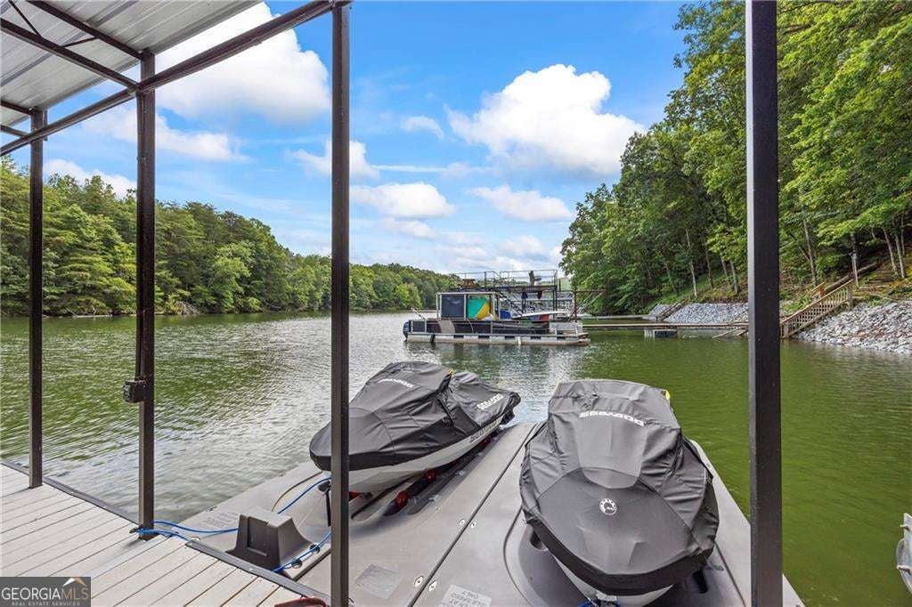 Welcome to your dream lakefront home in a peaceful cove right across from Toto Creek Park, where quiet waters and minimal boat traffic offer the perfect escape. Situated on deep water, this beautifully remodeled 4-bedroom, 3.5-bath home features a private 32x32 covered party dock with two boat slips, dual jet ski pallets, and a boat lift, ideal for lake lovers and entertainers alike. Enjoy breathtaking seasonal views of the lake from your gorgeous wraparound porch, perfect for morning coffee, sunsets, or simply soaking in the serenity of nature. Step inside to discover a bright and spacious open-concept layout with luxury vinyl plank flooring throughout, real wood plantation shutters, and matte black fixtures that blend modern style with timeless charm. The main level boasts a large living area anchored by a wood-burning fireplace, an elegant dining space, and a chef's kitchen complete with soft-close white cabinetry, stainless steel appliances, granite countertops, double ovens, a surface cooktop, a built-in microwave, and a massive walk-in pantry with barn doors. The main-level master suite offers serene views and a spa-like en-suite bath with a Moen double-headed shower, bench seating, dual vanities, and a custom walk-in closet featuring built-in drawers. Also on the main level is a spacious laundry room for added convenience. Upstairs features a private bedroom with a full bath, ample closet space, and extra storage. The fully finished basement is an entertainer's dream, featuring a second kitchen and wet bar, an expansive living area perfect for a pool table, a bedroom with a full bath, and an additional bonus room currently used as a bedroom. Outside, you'll find a detached 2-car garage with epoxy floors, wakeboard storage, two workbenches, and a gun safe. The home is also equipped with a whole-house generator for peace of mind. All furniture is negotiable with purchase. Located in a quiet, friendly neighborhood, yet just minutes from shopping, dining, and entertainment-this is lake living at its finest. This home would make an ideal short-term rental or Airbnb getaway, offering the perfect blend of comfort, space, and lakefront amenities guests love.