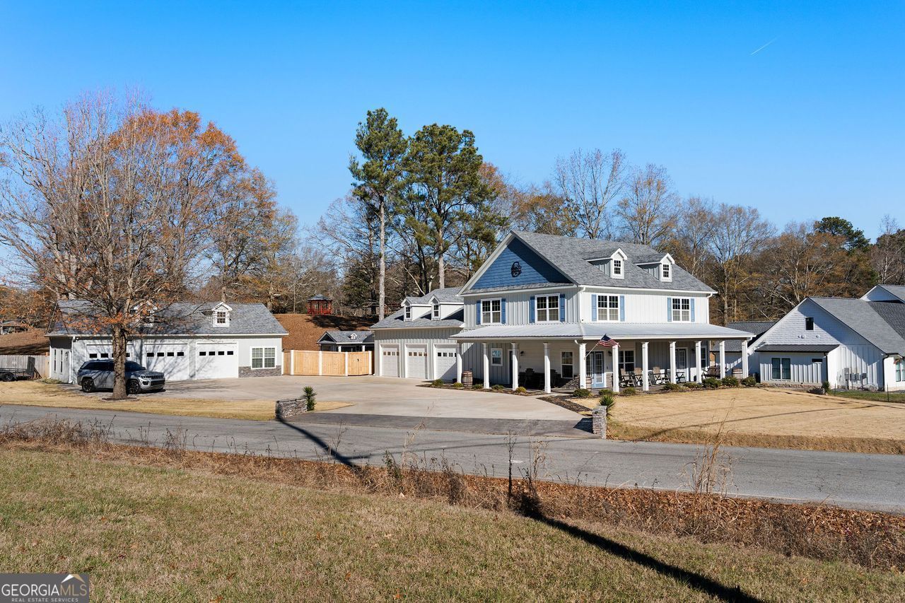 Entertainer's Dream Home! This stunning property offers the perfect blend of comfort, style, and entertainment. Featuring 3 bedrooms with the primary suite on the main level, 3 full bathrooms and 2 half baths, this home is designed for both everyday living and hosting. Enjoy LVP flooring, solid-surface countertops, and stainless-steel appliances, along with high ceilings and an abundance of natural light throughout. The attached three-car garage is 36x40 with 9 foot doors includes a game room with a half bath, making it ideal for a game of pool or game nights with friends and family. Step outside to your own private oasis-complete with a rock pool with waterfall that can be heated , rock outdoor fireplace, stage for entertaining, and a fully equipped outdoor kitchen/pool house. A detached three-car garage is 45x28 offers high ceilings and ample storage, with one bay currently finished as an apartment with a full bath, easily convertible back to garage space. Tons of parking make hosting effortless. Relax on the beautiful front porch, perfect for morning coffee or evening sunsets. This home truly checks every box for entertaining and lifestyle living.