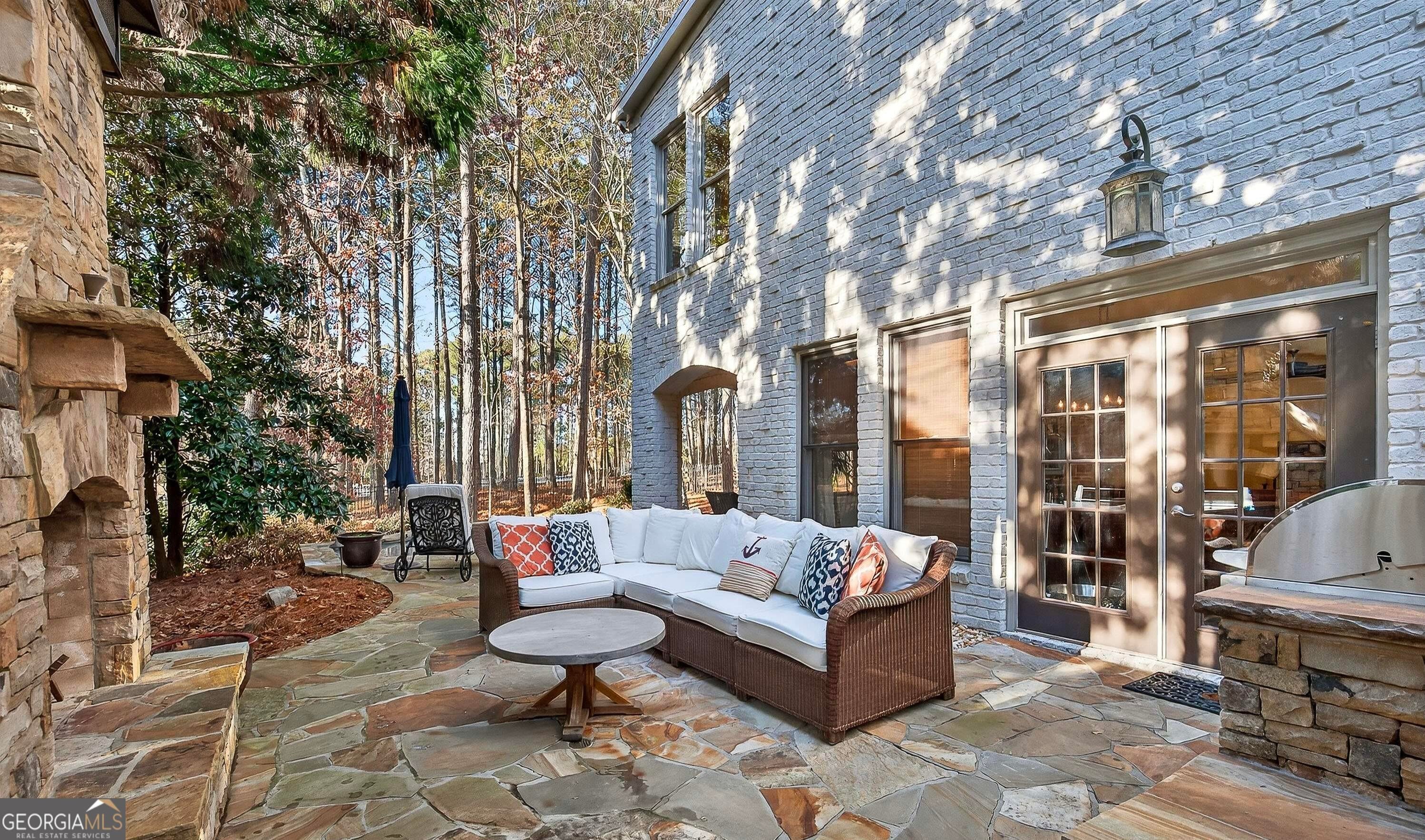 Exquisite brick residence in the gated Ardsley Park community of Windward, featuring castle-style iron doors and a striking grand entry with curved staircase. Sophisticated living spaces flow into a chef's kitchen with expansive island and sunlit breakfast room, opening to a covered screened porch for year-round enjoyment. The upper-level owner's retreat displays a private sitting area and an oversized custom walk-in closet. Designed for entertaining, the terrace level includes a custom kitchen and bar, recreation space, and private guest suite-all overlooking a resort-style backyard with saltwater pool, stacked-stone fireplace, and built-in grill. Flat driveway, three-car garage, and cul-de-sac location. Walk to the Golf Club of Georgia. Minutes to Avalon and Downtown Alpharetta.