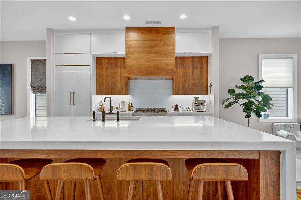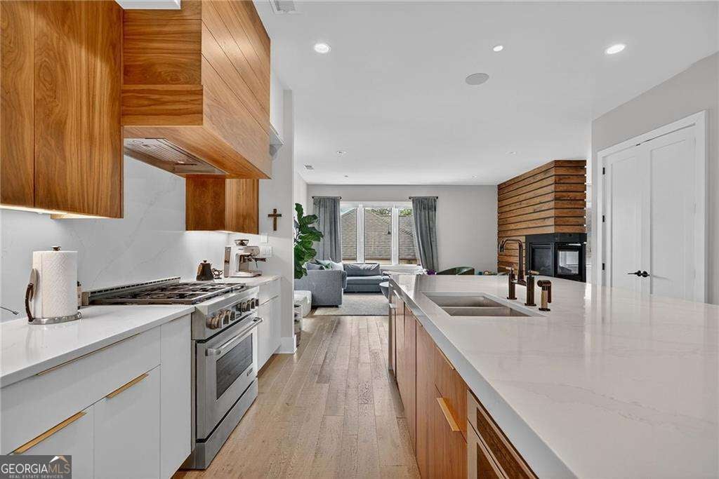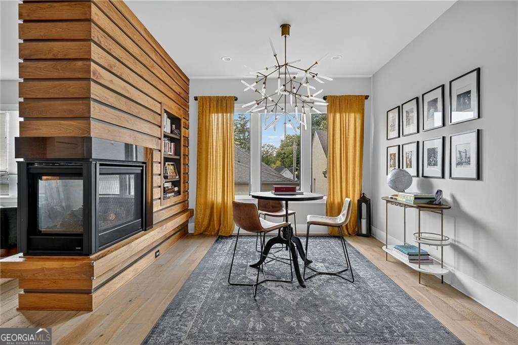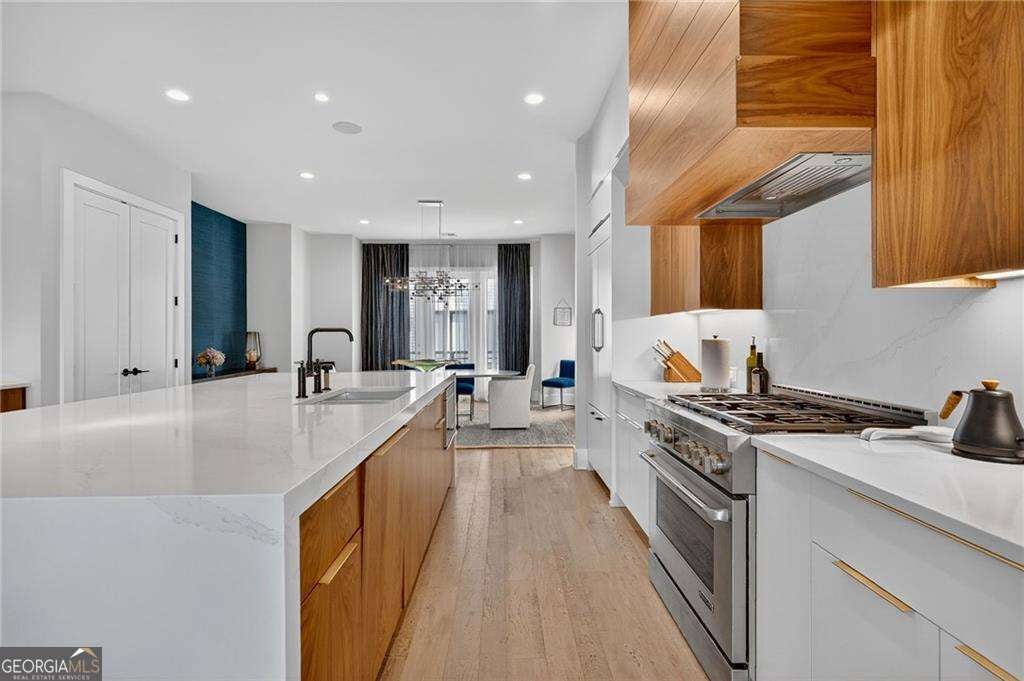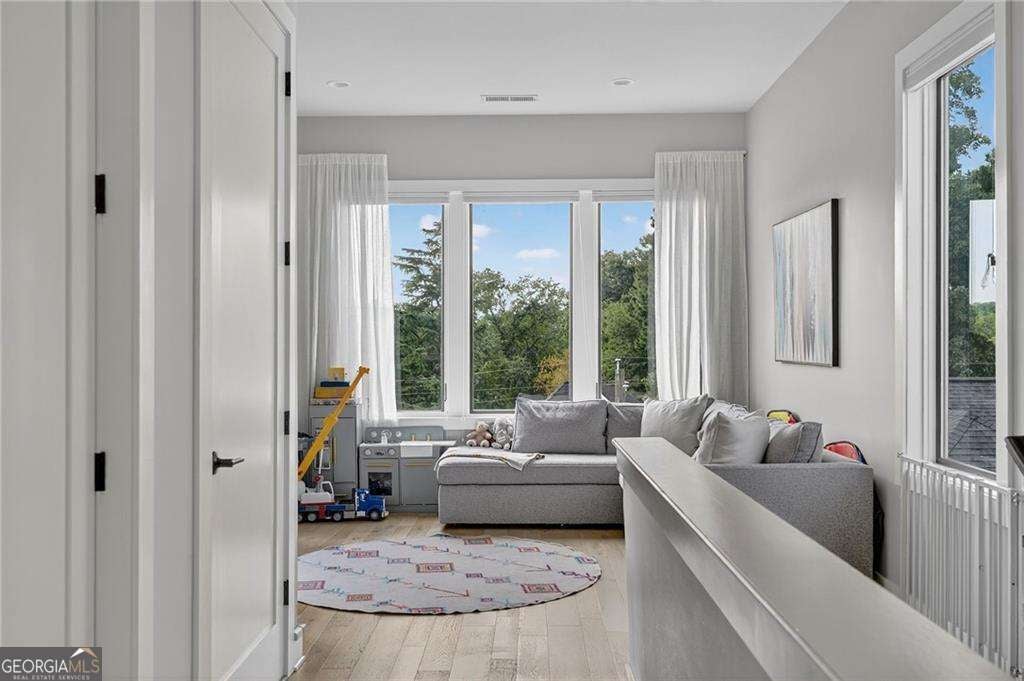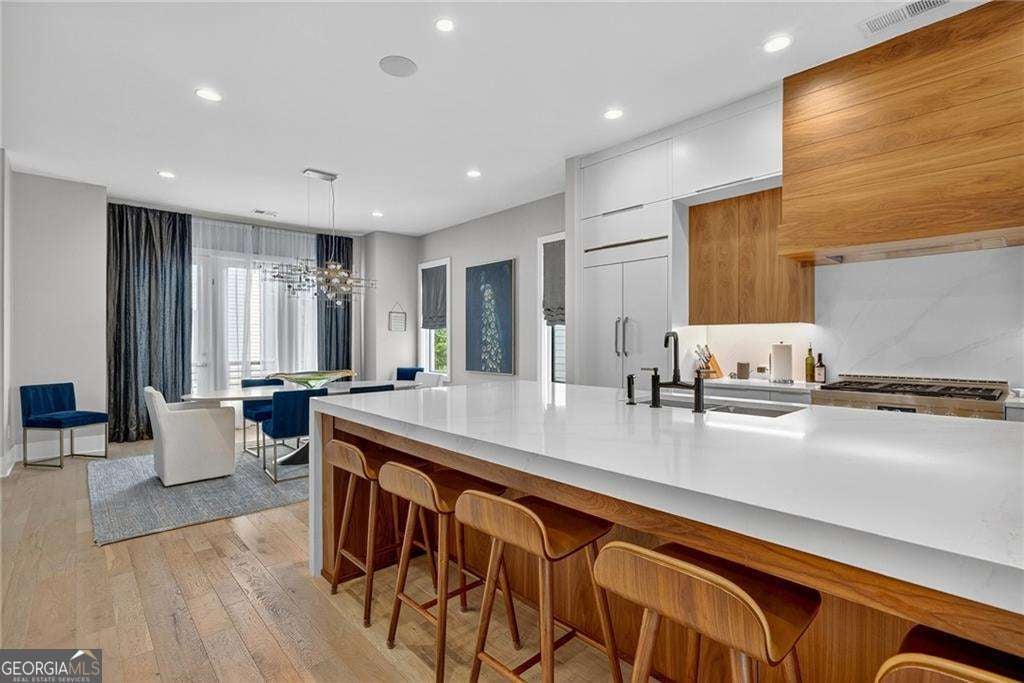 A sun-drenched 4-bedroom, 4 full and 1 half bath home ideally positioned in the heart of Buckhead/Chastain Park, just minutes from top-rated dining, shopping, schools, and entertainment. Contemporary design is thoughtfully balanced with the quiet beauty of nature, offering a light-filled, open floor plan with soaring 10-foot ceilings, hardwood flooring throughout, custom Hunter Douglas privacy blinds, designer lighting, and elevated finishes at every turn. The gourmet kitchen anchors the main level and features custom Bell cabinetry, quartz countertops, an oversized island, and top-of-the-line JennAir stainless steel appliances. The space opens seamlessly to the eat-in kitchen, breakfast bar with Zephyr beverage fridge, and a cozy fireside keeping room-perfect for both everyday living and entertaining. A spacious owner's suite offers a private retreat with a spa-like bath featuring Bell cabinetry in the vanities, Brizo plumbing finishes, a freestanding soaking tub, dual vanities, and a custom walk-in closet with Bell cabinetry. Additional bedrooms are generously sized and include stylish en suite baths with quartz countertops and Serenity Series glass sliding door systems. Additional highlights include an operational elevator to all floors, a 2-car garage, fenced yard with turf, multiple decks and outdoor living spaces, and several flexible office or bonus areas. Located within the Enclave at Chastain, this special community pairs sleek contemporary architecture with the serenity of a surrounding nature preserve. Enjoy easy living with modern convenience, guest and overflow parking on both side streets, and walkability to Blue Heron Nature Preserve, nearby restaurants, and more.