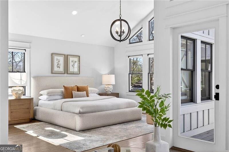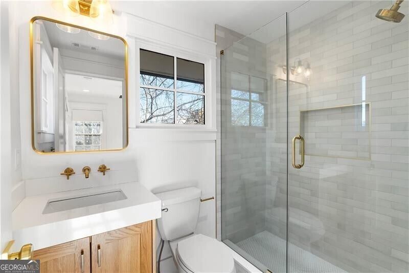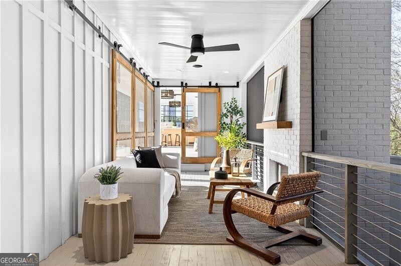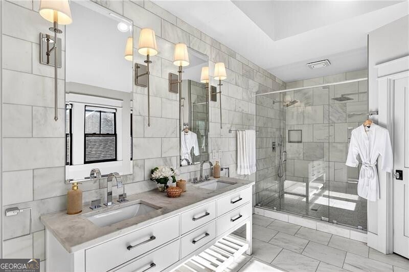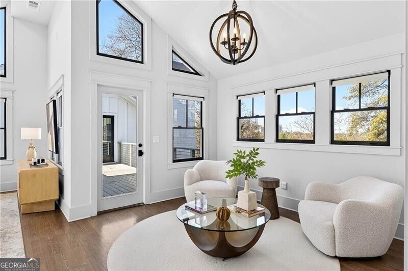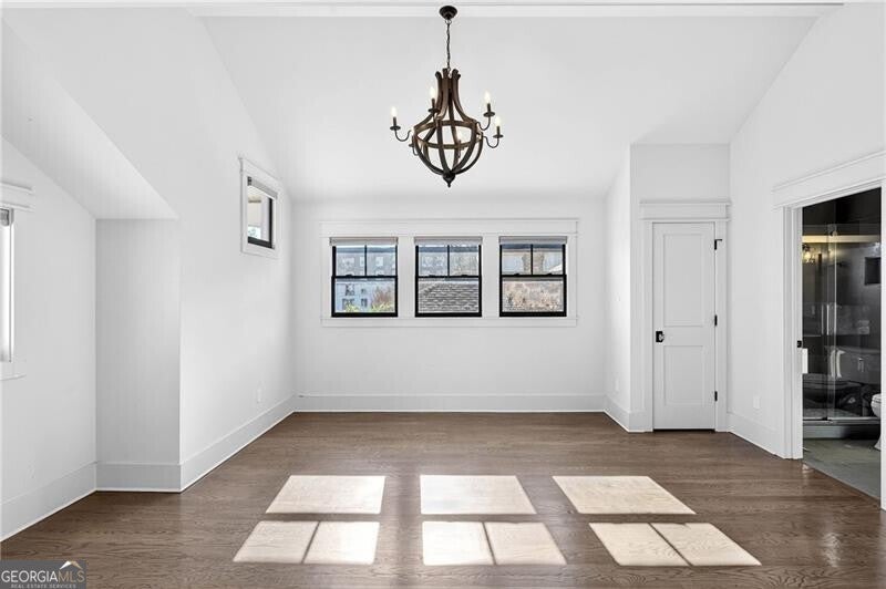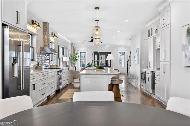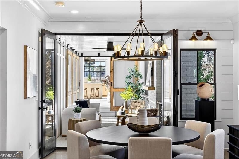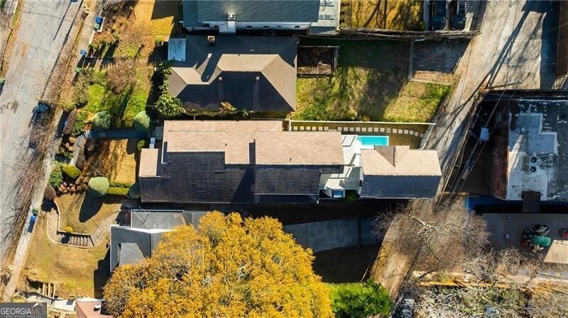 Perched atop a hill in the heart of Old Fourth Ward, this completely renovated and expanded bungalow offers a rare combination of architectural character, modern sophistication, and resort-style outdoor living, all within walking distance of the Atlanta BeltLine, Ponce City Market, Krog Market, and Piedmont Park. A welcoming covered front porch opens to a gracious, open-concept main level designed for both everyday living and effortless entertaining. Three distinct sitting and living areas provide remarkable versatility, anchored by a fireplace and a stunning chef's kitchen featuring an oversized island, marble countertops, and a professional-grade stainless steel appliance package. The main level is thoughtfully appointed with a junior primary suite offering a beautifully marble-clad bath, along with an additional guest suite perfectly suited for a home office. A dramatic wall of accordion doors spans the rear of the home, seamlessly connecting the interior living space to a covered outdoor living room with fireplace. Beyond, a private pool and attached guest house create an exceptional indoor-outdoor retreat. The guest house includes an outdoor entertaining kitchen, efficiency suite, indoor kitchen, and dedicated pool bath-ideal for guests, extended stays, or rental income. Upstairs, the primary suite is a true sanctuary, featuring vaulted ceilings, an adjoining sitting room, and a spa-inspired marble bathroom with dual vanities, a large frameless glass walk-in shower, and a custom walk-in closet with integrated laundry. The suite opens to a private outdoor deck with an additional fireplace and captivating skyline views. A second vaulted ensuite guest bedroom completes the upper level. Alley access leads to a one-car drive-under garage, enhancing both convenience and privacy. Unmatched in both design and location, this home sits just steps from Old Fourth Ward Park, the FORTH Hotel, Ponce City Market, and the vibrant dining, retail, and cultural offerings that define one of Atlanta's most dynamic neighborhoods.