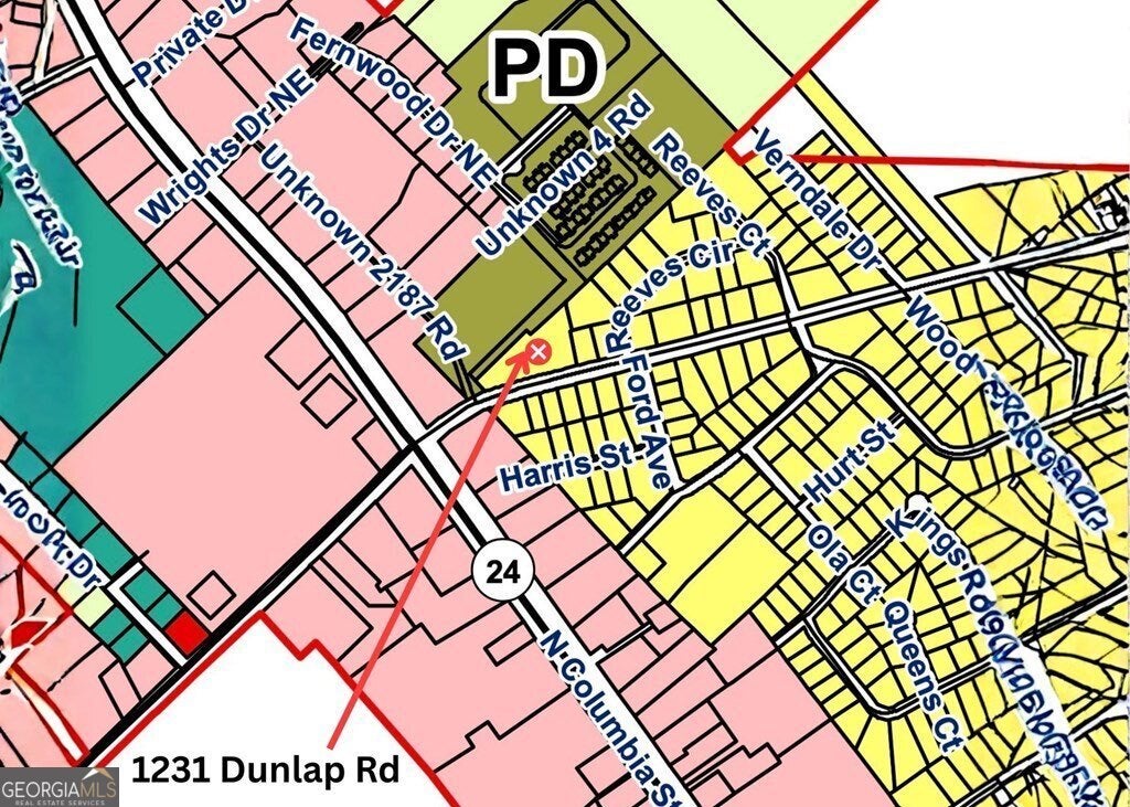 Located on 1.76 acres just off the prominent intersection of Dunlap Road and North Columbia Street (Hwy 441), this in-town property offers an exceptional setting within the City of Milledgeville. The site benefits from immediate adjacency to community commercial and planned development zoning, providing strong visibility, accessibility, and long-term flexibility, subject to applicable zoning and approvals. Improvements include an approximately 2,300 square foot main structure and an additional 800+ square foot accessory structure. The expansive parcel allows for a variety of potential uses while maintaining close proximity to major corridors, nearby businesses, and city amenities. Home and ADU are being sold where-is, as-is.