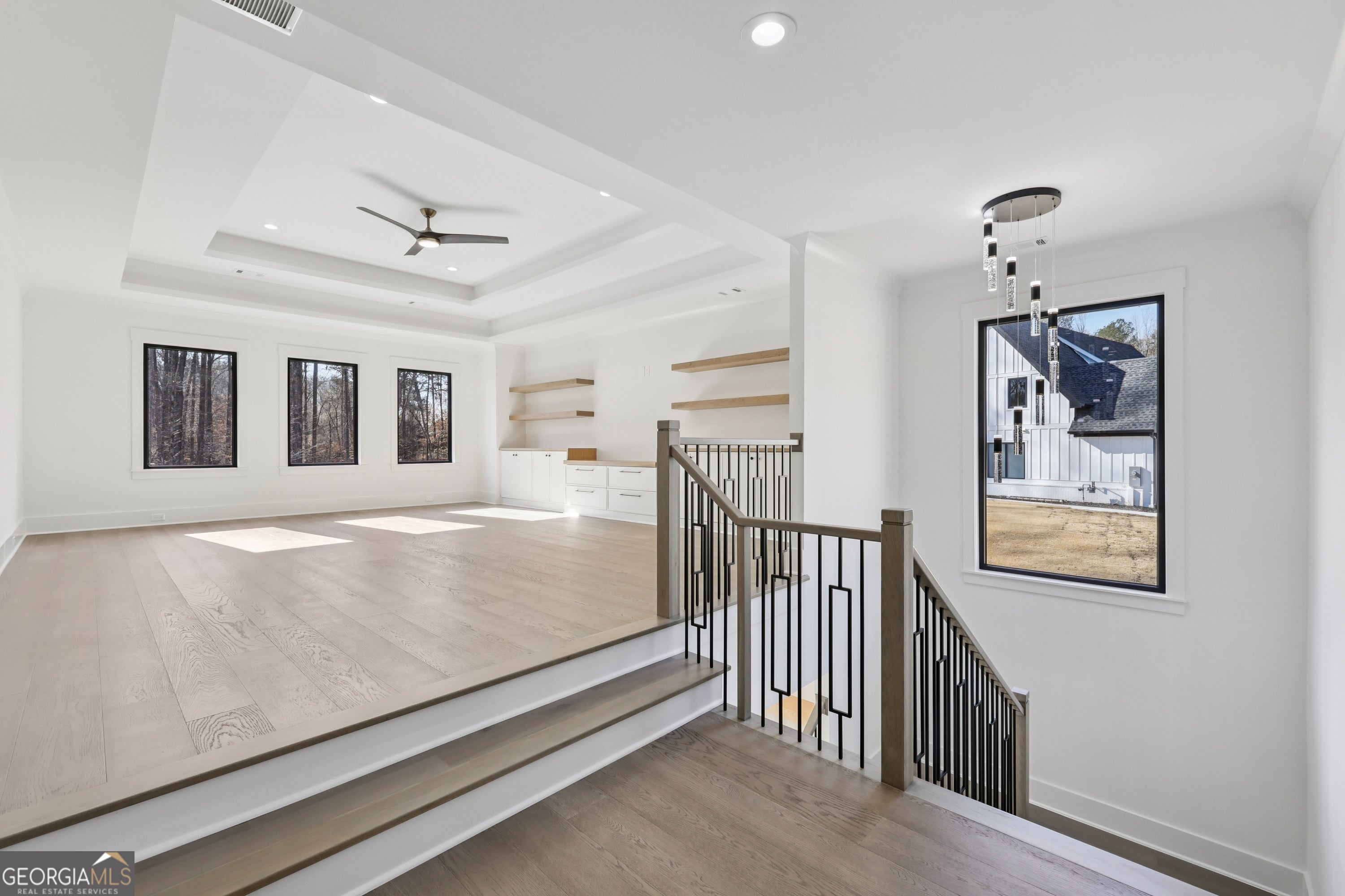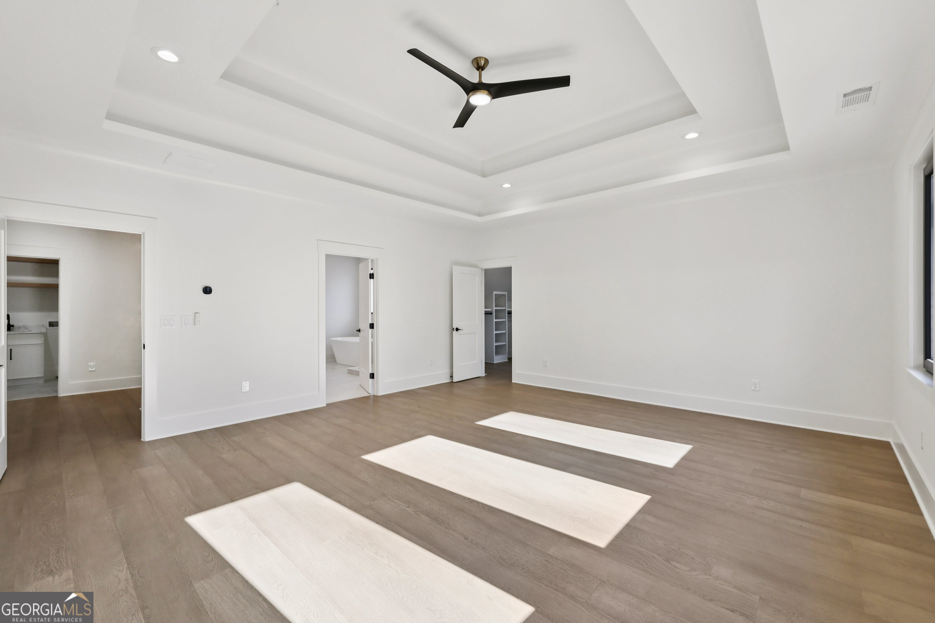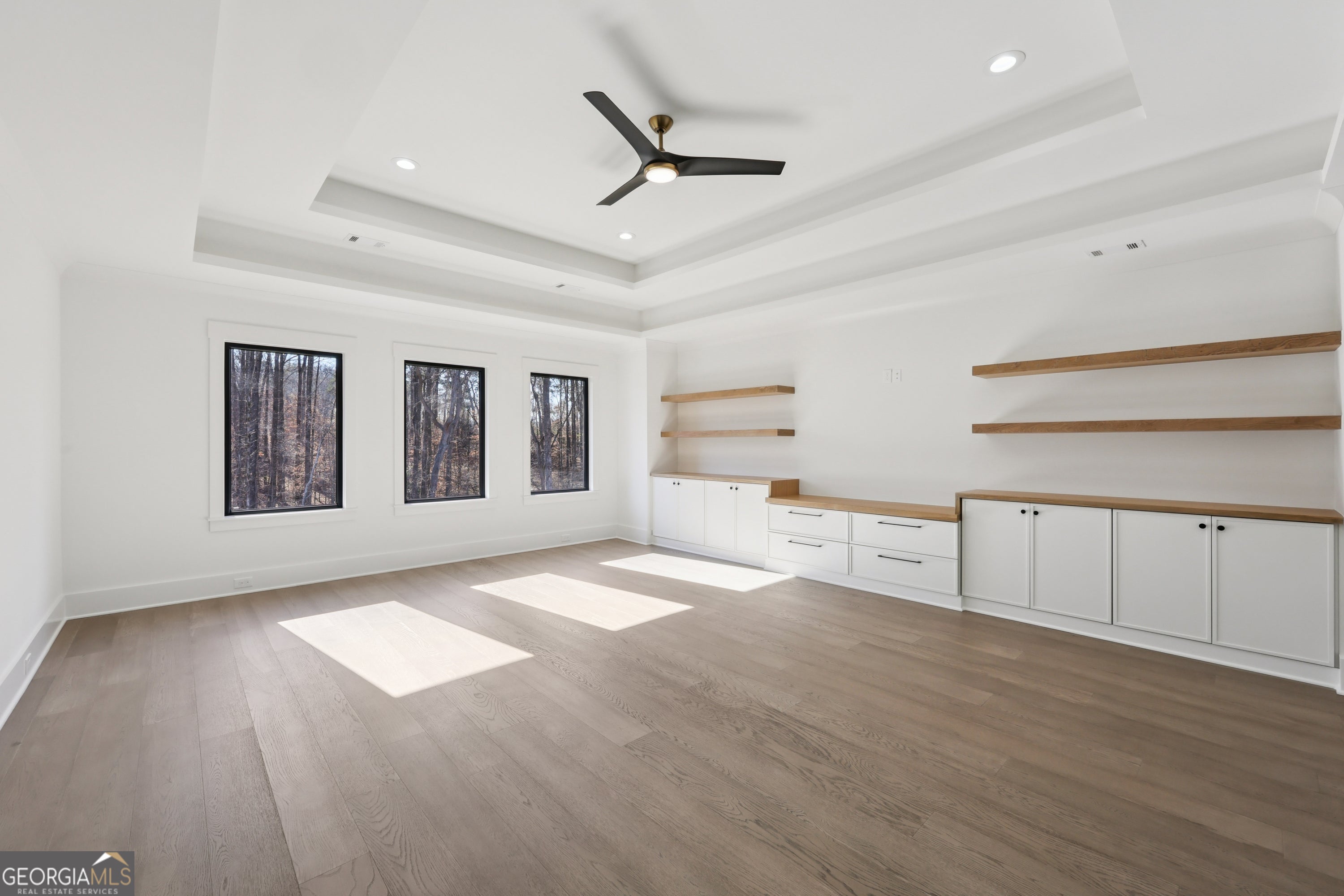 - Interior FeaturesBookcases, Double Vanity, Tray Ceiling(s), Beamed Ceilings, Wet Bar