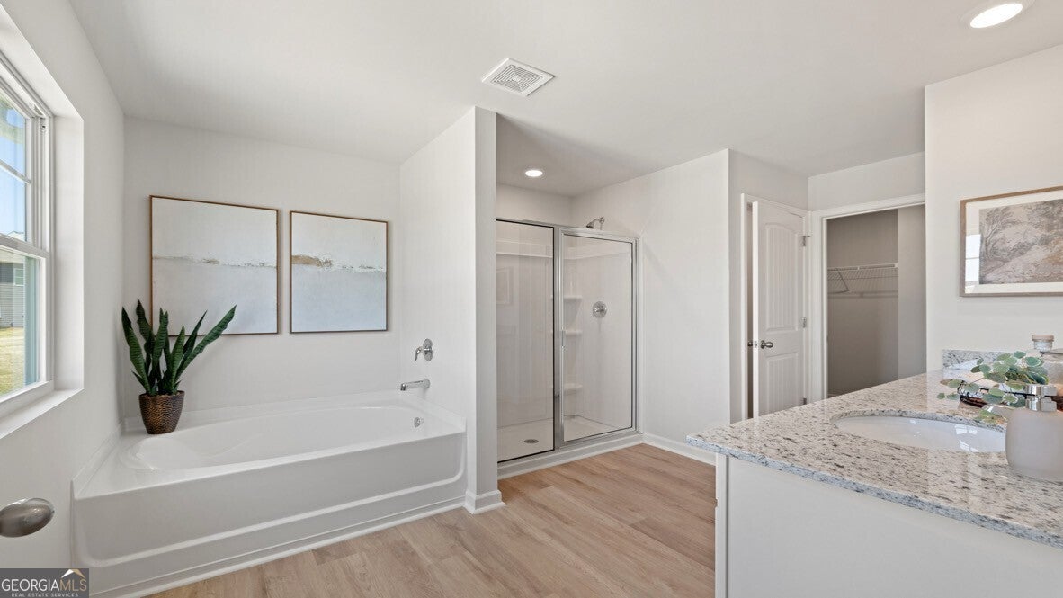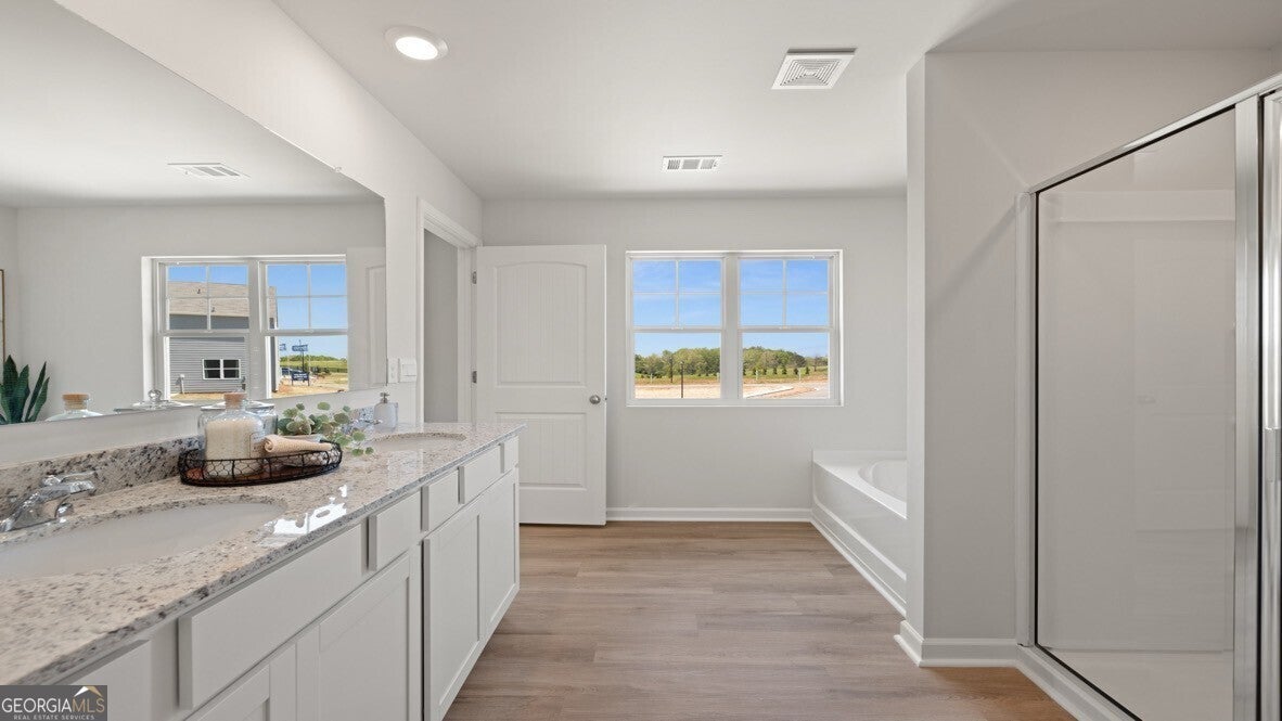 - Interior FeaturesDouble Vanity, High Ceilings, Pulldown Attic Stairs, Separate Shower, Soaking Tub, Walk-In Closet(s)
