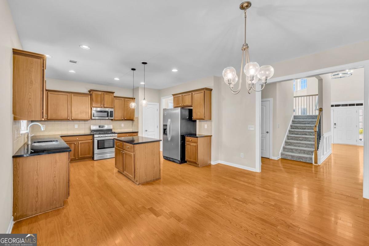 This expansive three-story residence offers 5,268 sq ft of flexible living space with 7 bedrooms and 5 full baths, highlighted by dramatic 20+ foot ceilings in the entry and family room. Located in Atlanta with a 30331 postal city, 5401 Stone Cove Dr features a well-designed main level with hardwood floors, abundant natural light, a formal dining room, and an open family room with fireplace and built-in shelving. The eat-in kitchen is finished with granite countertops, stained cabinetry, stainless steel appliances, a center island, and recessed lighting, creating a functional hub that connects easily to the main living areas. A main-level bedroom with a full bath provides convenience for guests or flexible daily use. Upstairs, the third floor expands the home's versatility with a loft-style space ideal for a media room, home office, or gym, along with two additional bedrooms and a full bath. The layout supports multiple uses while maintaining privacy across levels. Outdoor living includes a rear patio and a level backyard set on approximately 0.28 acres. A two-car attached garage adds practicality. The community HOA offers a pool, tennis courts, and a dog park for $600 per year. Built in 2007, this home combines scale, light, and adaptable spaces within an established neighborhood setting.