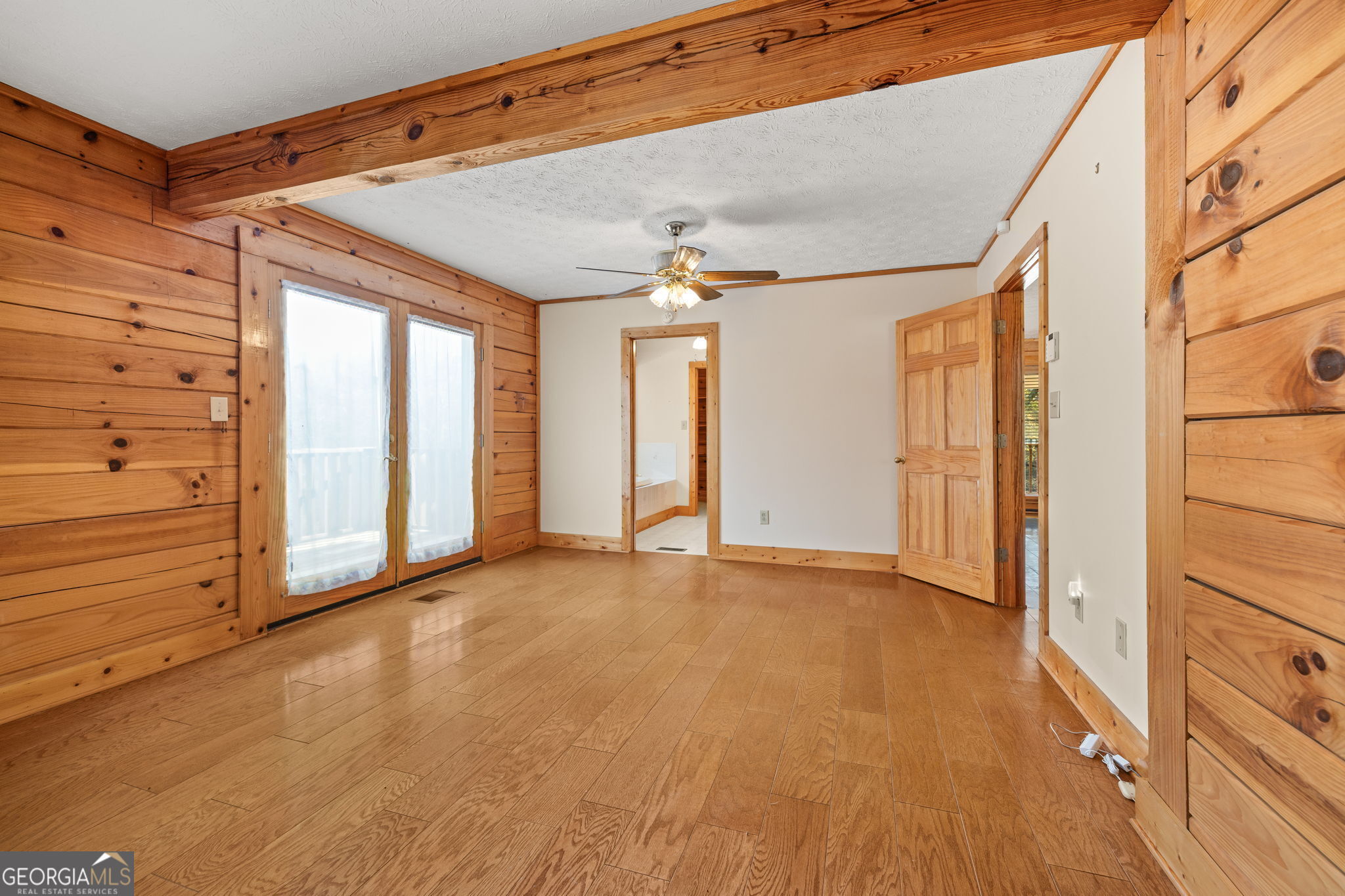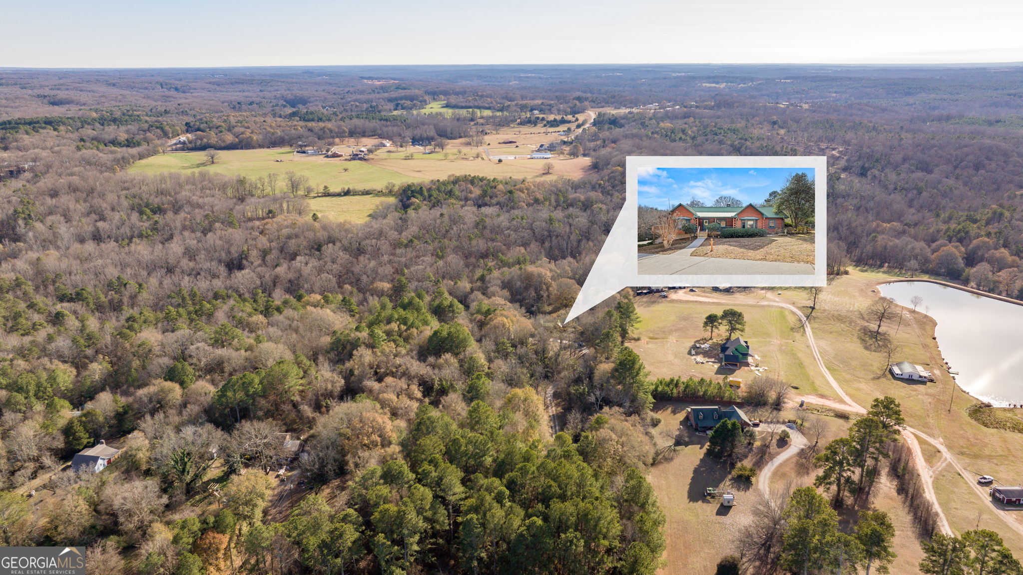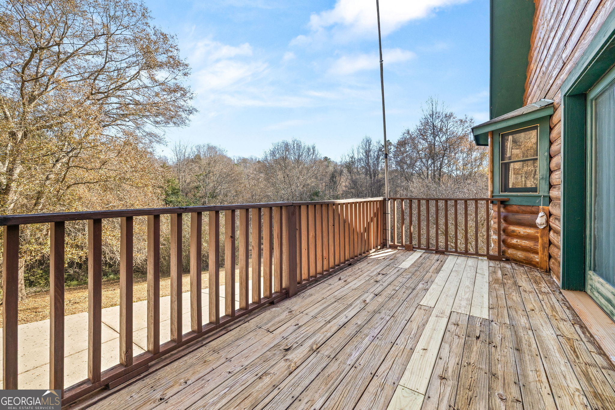 Tucked away on 20.35 wooded acres, this log cabin offers privacy, rolling hills, and peaceful natural surroundings. A long driveway leads to the home and provides a private setting. The home features one-level living with an unfinished basement. A covered front porch welcomes you home and creates a quiet place to slow down-ideal for rocking chairs and taking in the sounds of nature. The family room features a fireplace, wooded views, and double French doors leading to a covered porch/deck for outdoor living. The primary suite includes double French doors opening to a private deck-an ideal spot to enjoy the surrounding woods. The split-bedroom floor plan offers two additional bedrooms and a shared bath on the opposite side of the home. Eat-in country kitchen with pantry. Fenced backyard for children, pets, or everyday outdoor enjoyment. Mostly wooded with a small creek. Located just 2 miles from Interstate 85, this property offers the rare combination of privacy, acreage, and convenience-well suited for buyers seeking a full-time residence or private retreat with room to grow. This home offers a solid foundation for someone ready to make it their own.