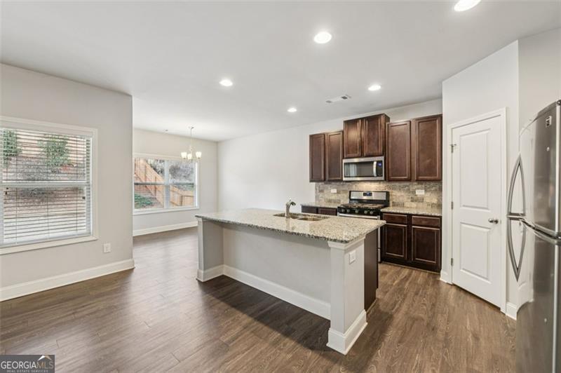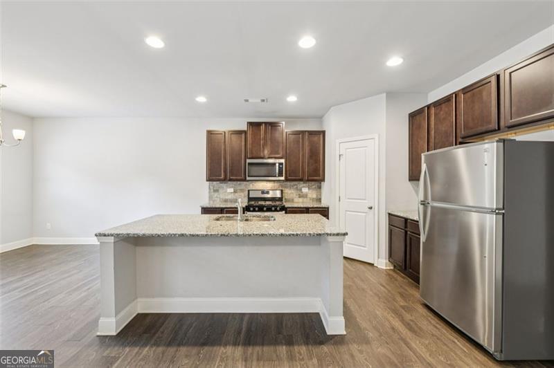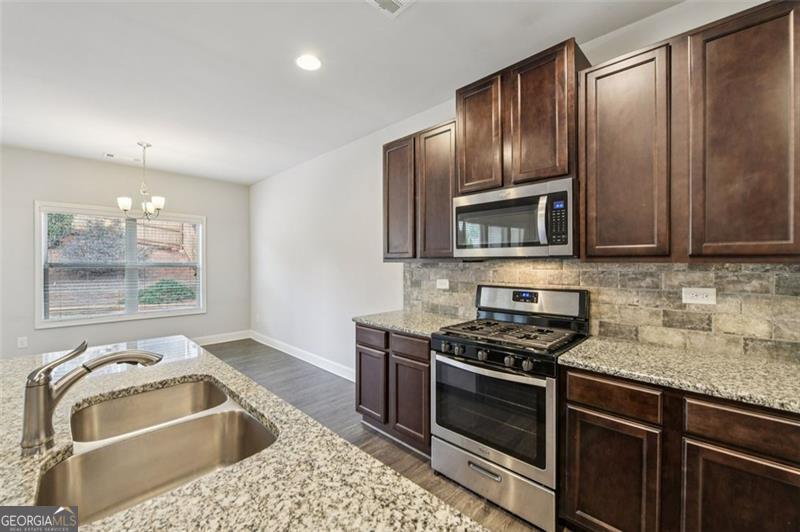 Move-in ready ranch home in Gainesville, GA with buyer incentives available. Qualified buyers may receive up to $10,000 toward closing costs, rate buy-down, or financing assistance when using the preferred lender. Buyer must meet lender qualifications and program terms. Located in Hall County, Gainesville, GA, this one-level home offers a bright open floor plan designed for comfortable everyday living and entertaining. Hardwood-style flooring, decorative wainscoting, and neutral finishes create a clean and welcoming interior. The kitchen features granite countertops, stainless steel appliances, tile backsplash, abundant cabinetry, and a large center island with seating. A dedicated dining area opens to the covered back patio, creating ideal indoor-outdoor living. The primary suite includes a tray ceiling and private bath with double vanities, tiled walk-in shower with glass enclosure, and a spacious walk-in closet. Secondary bedrooms provide flexibility for guests, home office space, or additional living needs. A separate laundry room adds everyday convenience. Enjoy a fully fenced backyard, usable lawn space, and a covered patio perfect for relaxing or entertaining. Additional highlights include a two-car garage and convenient access to shopping, dining, medical facilities, commuter routes, and Lake Lanier.