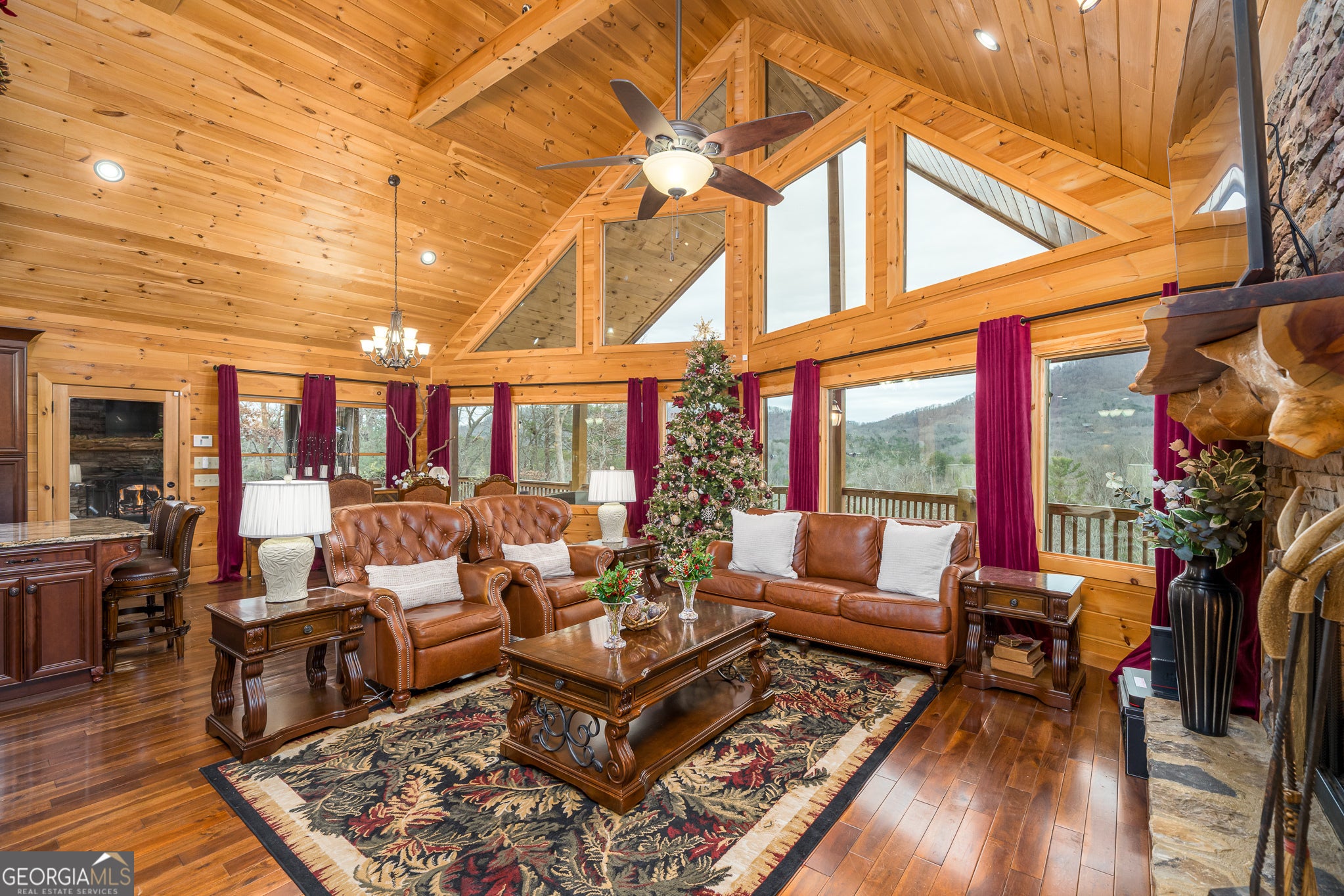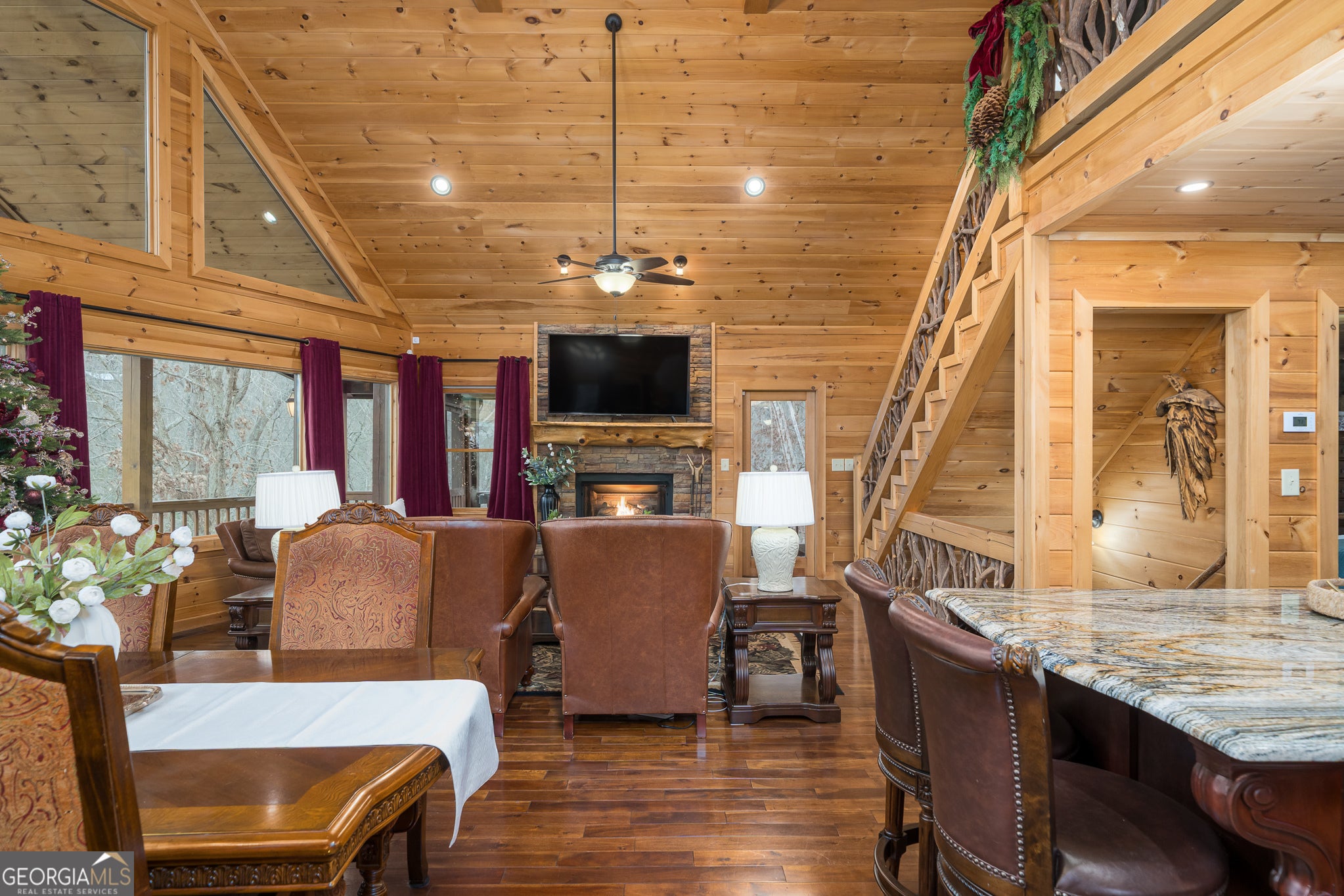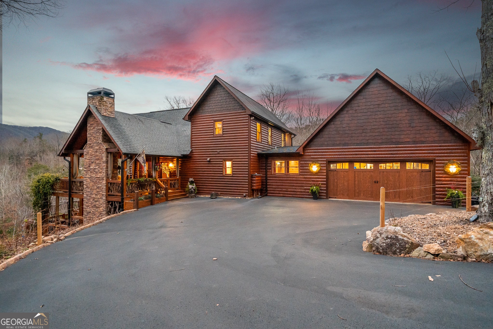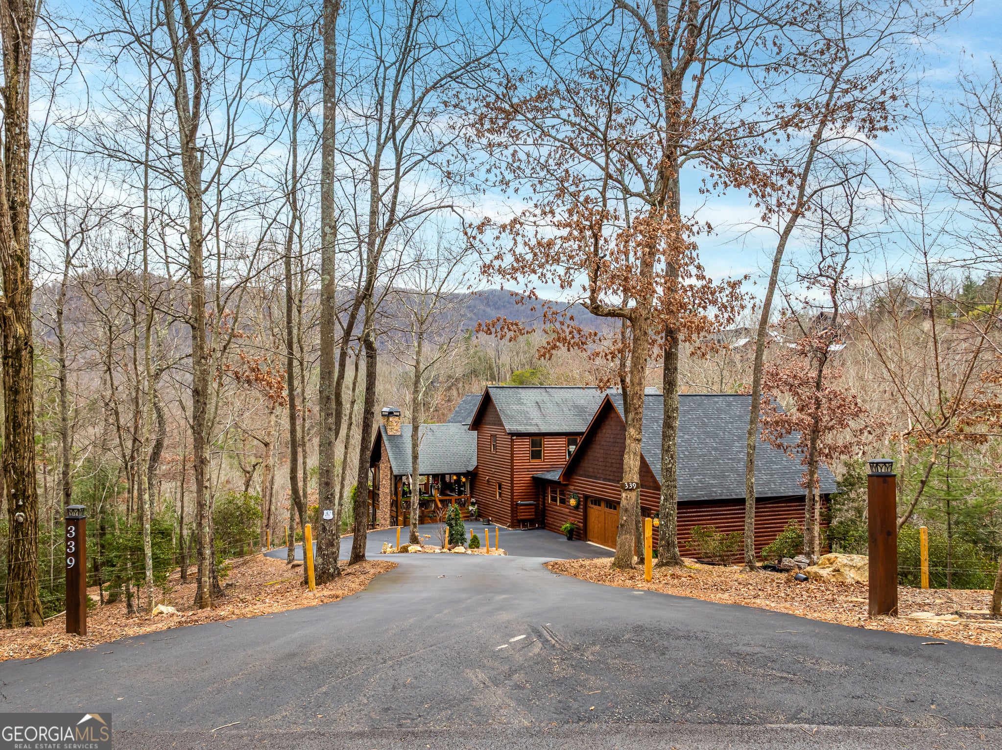 Massive long-range mountain views and a rare combination of privacy and proximity to town define this exceptional cabin, set on a large, well-maintained private lot. Hand-scraped log siding and tongue & groove interior walls create an authentic mountain feel, with thoughtful craftsmanship that includes railings made from mountain laurel branches harvested from the property itself. The main level offers an open concept living area, beautiful hardwood floors, and loads of windows that showcase the view. The well-appointed kitchen anchors the space with soft-close cabinetry, GE Cafe stainless steel appliances, a 4-burner gas stove with center griddle, dual ovens, vertical storage pullouts, cabinet pullouts, and a generous island with a composite granite farmhouse sink w/ touchless faucet, and built-in microwave, making it ideal for everyday living and entertaining. The impressive main level primary suite features a hidden cabinet door entry into the spa-like bath with porcelain floors, a Finnleo sauna, a roll-in shower, a GE towering washer/dryer, and exterior access directly from the bedroom. Enjoy step-free, covered access to the oversized 2-car garage w/ extra-tall doors, loads of cabinetry, approx. 444 sq. ft of attic storage, & a built-in lift for easy transport of seasonal items. The terrace level expands the living space with a large entertainment area complete with a FP and wet bar, a spacious guest bedroom, a well-appointed bath, & sweeping views from both covered & open decks. Upstairs, a loft-style primary bedroom enjoys stunning gable-end mountain views, a private screened deck, a dedicated bath & closet, and an additional loft stoop currently used as an office. With a Generac generator, low-maintenance gutter guards, an asphalt driveway, newer paved roads, and quality construction by respected local builder Brandon Mathis, this home blends classic cabin charm, traditional design, and refined luxury. This cabin truly puts the EXTRA in extraordinary!
