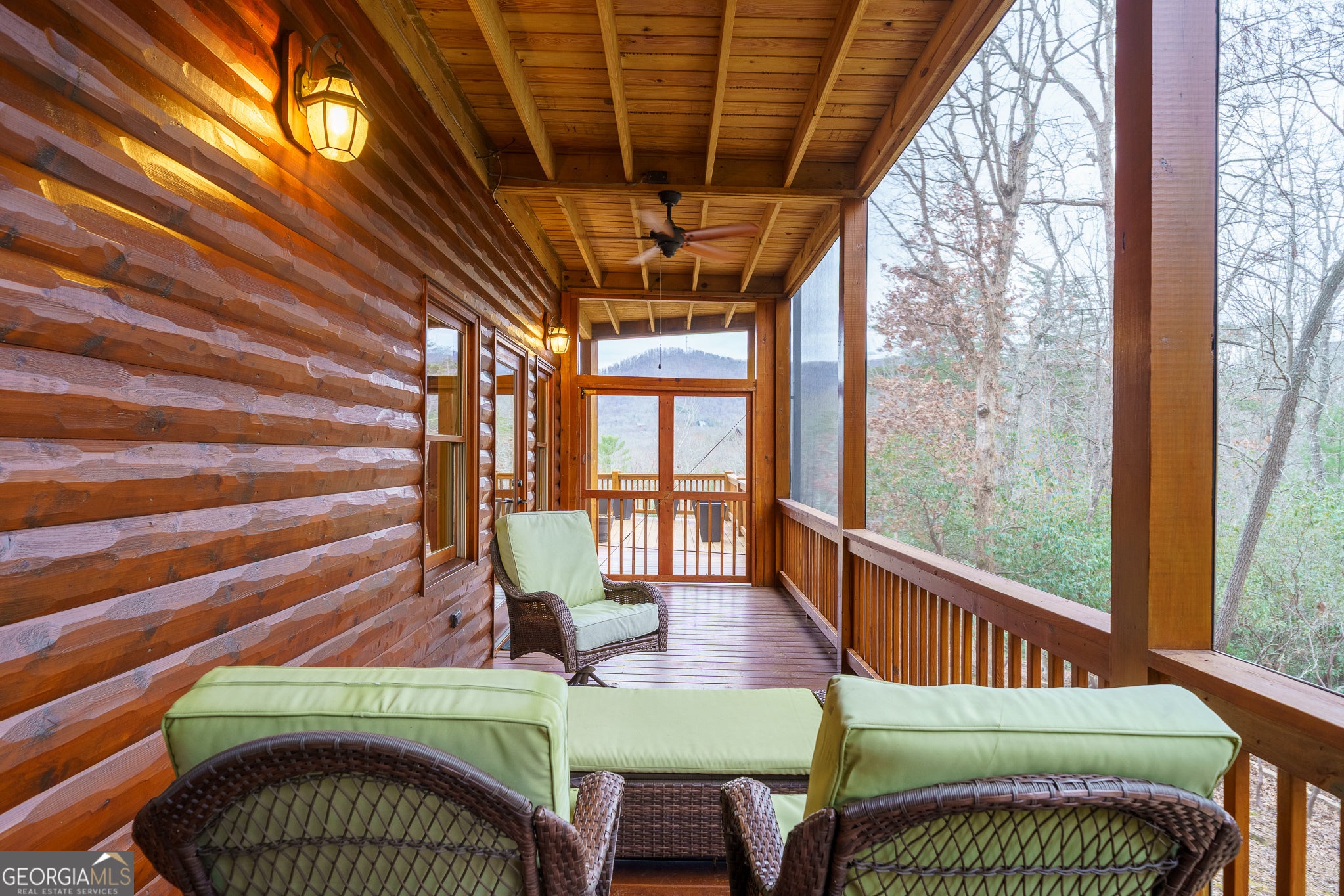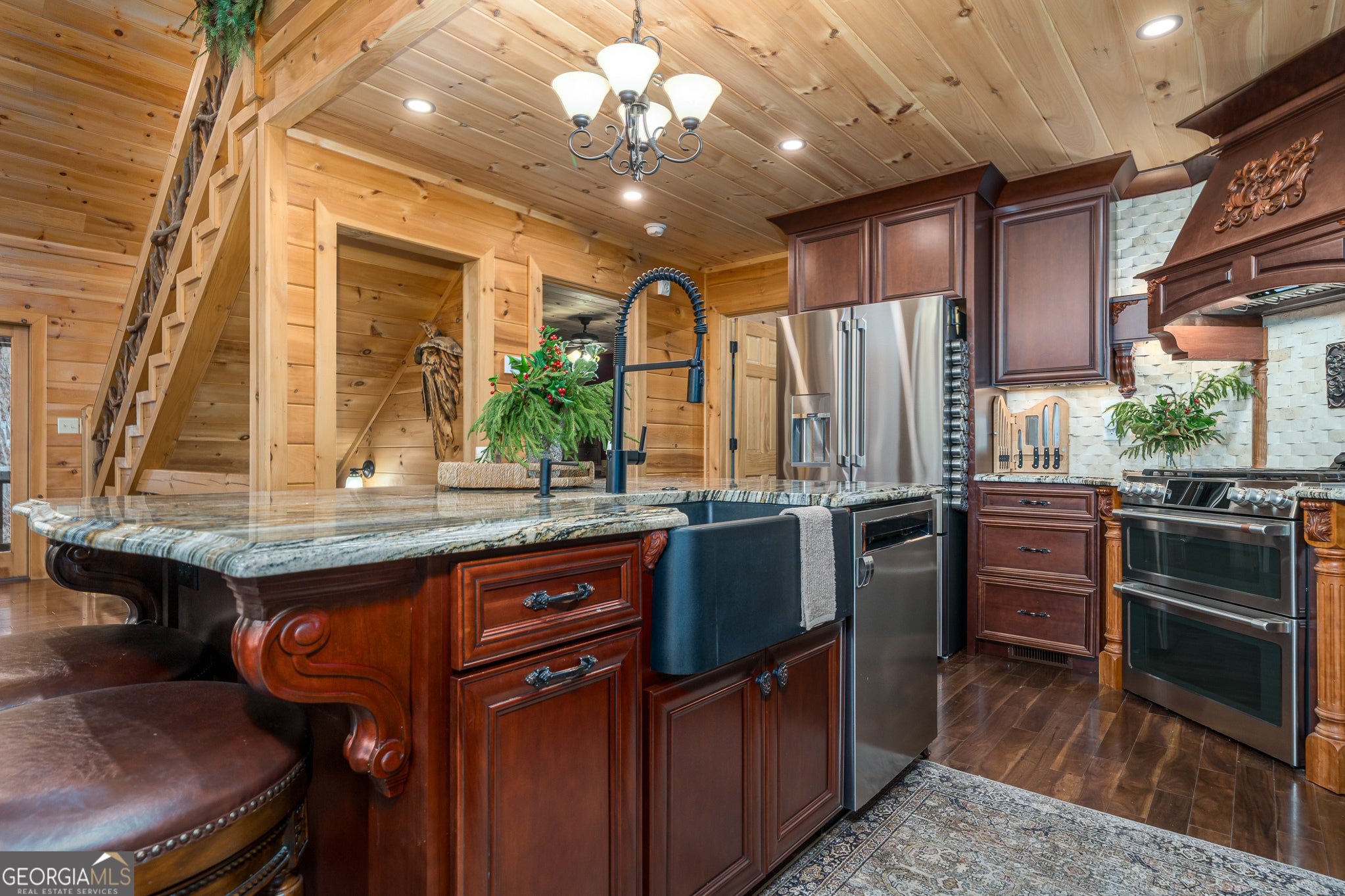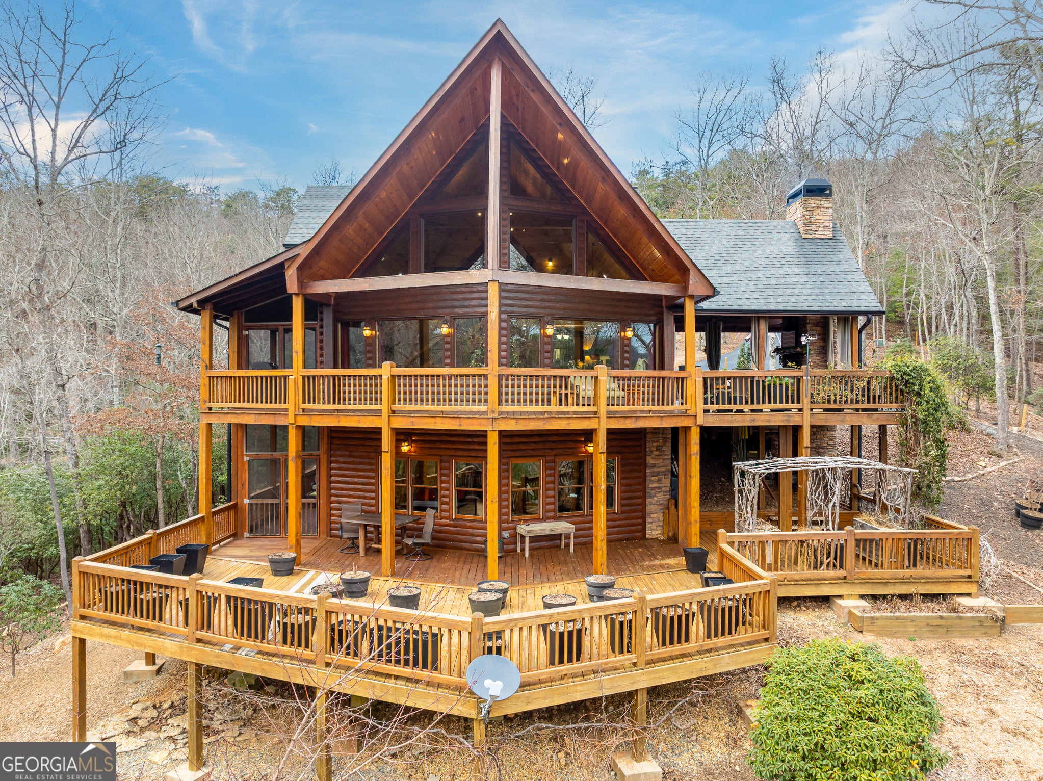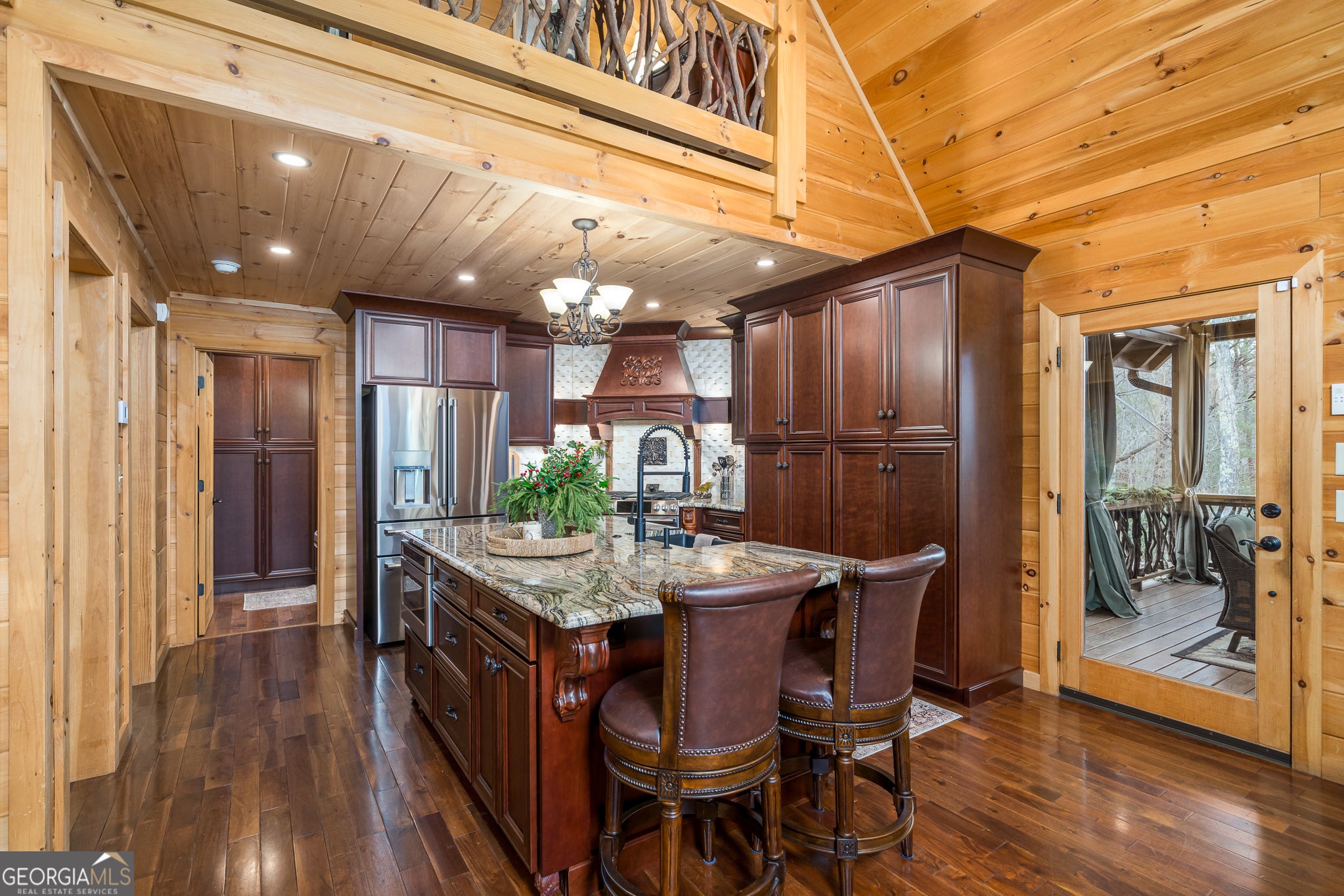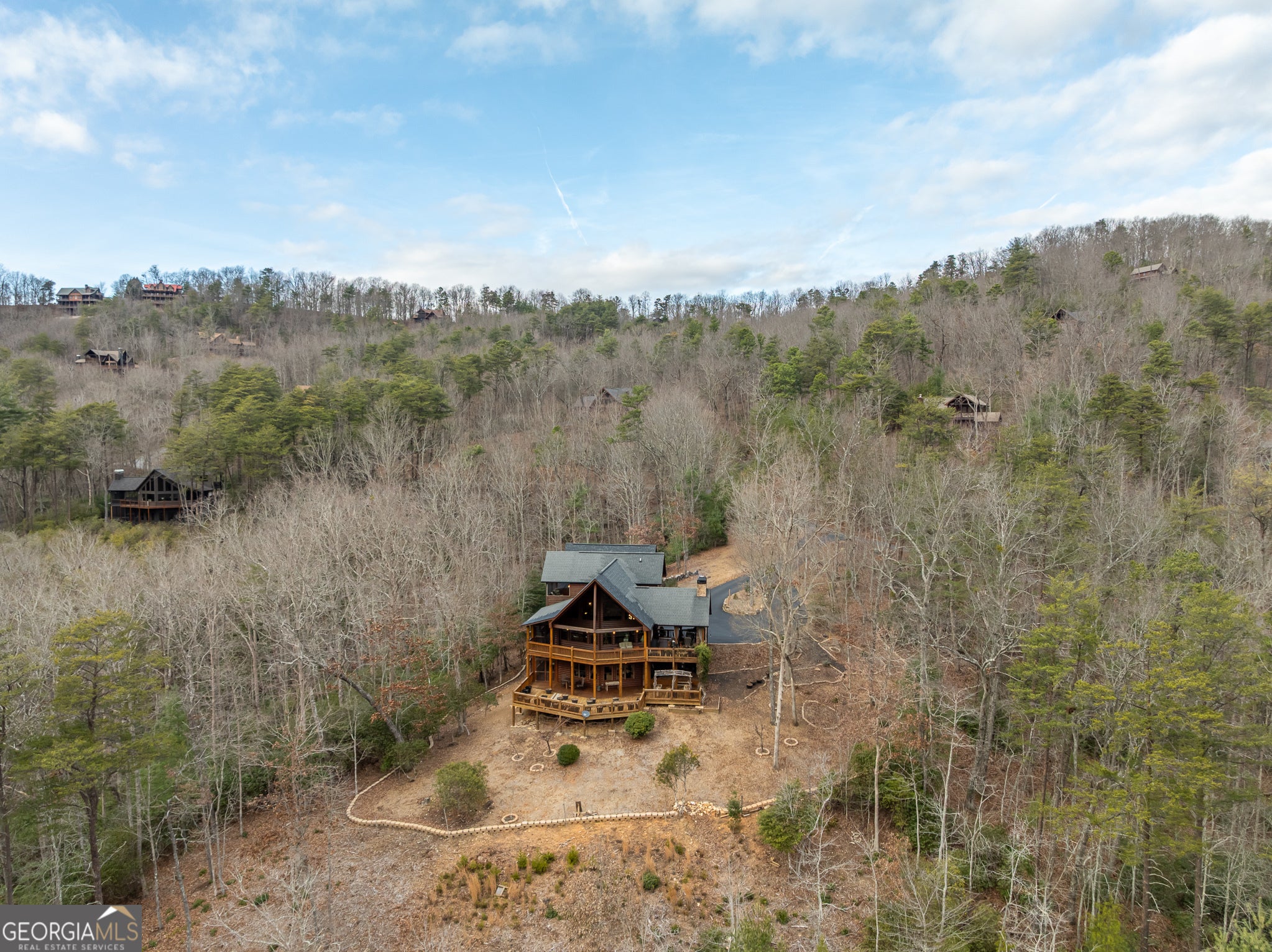 Massive long-range mountain views and a rare combination of privacy and proximity to town define this exceptional cabin, set on a large, well-maintained private lot. Hand-scraped log siding and tongue & groove interior walls create an authentic mountain feel, with thoughtful craftsmanship that includes railings made from mountain laurel branches harvested from the property itself. The main level offers an open concept living area, beautiful hardwood floors, and loads of windows that showcase the view. The well-appointed kitchen anchors the space with soft-close cabinetry, GE Cafe stainless steel appliances, a 4-burner gas stove with center griddle, dual ovens, vertical storage pullouts, cabinet pullouts, and a generous island with a composite granite farmhouse sink w/ touchless faucet, and built-in microwave, making it ideal for everyday living and entertaining. The impressive main level primary suite features a hidden cabinet door entry into the spa-like bath with porcelain floors, a Finnleo sauna, a roll-in shower, a GE towering washer/dryer, and exterior access directly from the bedroom. Enjoy step-free, covered access to the oversized 2-car garage w/ extra-tall doors, loads of cabinetry, approx. 444 sq. ft of attic storage, & a built-in lift for easy transport of seasonal items. The terrace level expands the living space with a large entertainment area complete with a FP and wet bar, a spacious guest bedroom, a well-appointed bath, & sweeping views from both covered & open decks. Upstairs, a loft-style primary bedroom enjoys stunning gable-end mountain views, a private screened deck, a dedicated bath & closet, and an additional loft stoop currently used as an office. With a Generac generator, low-maintenance gutter guards, an asphalt driveway, newer paved roads, and quality construction by respected local builder Brandon Mathis, this home blends classic cabin charm, traditional design, and refined luxury. This cabin truly puts the EXTRA in extraordinary!
