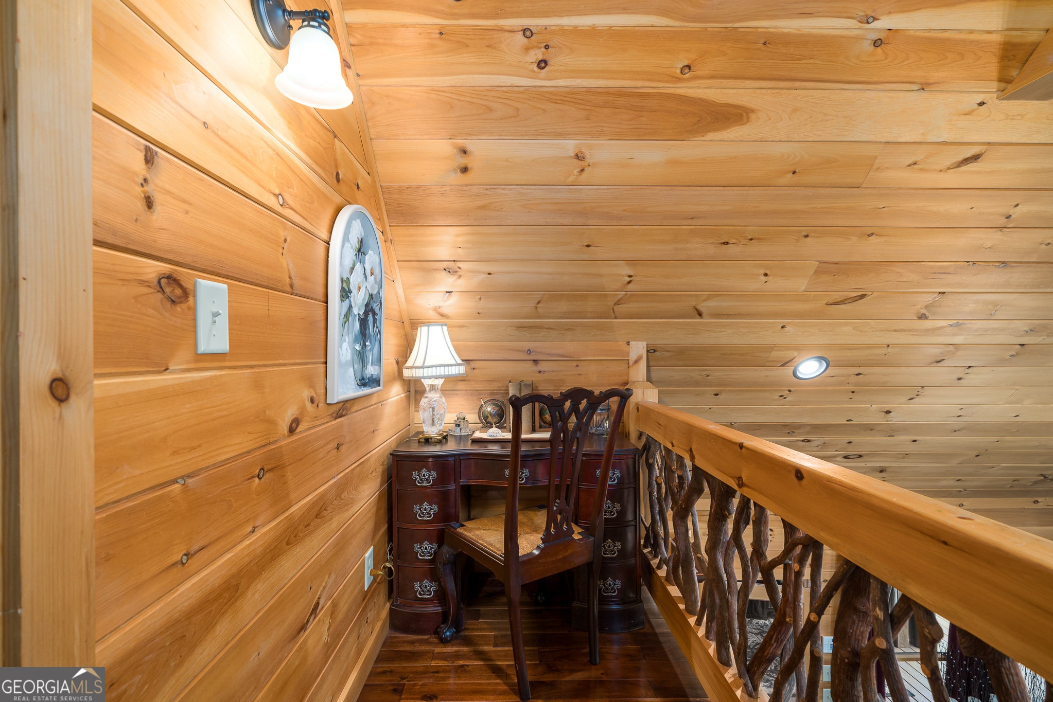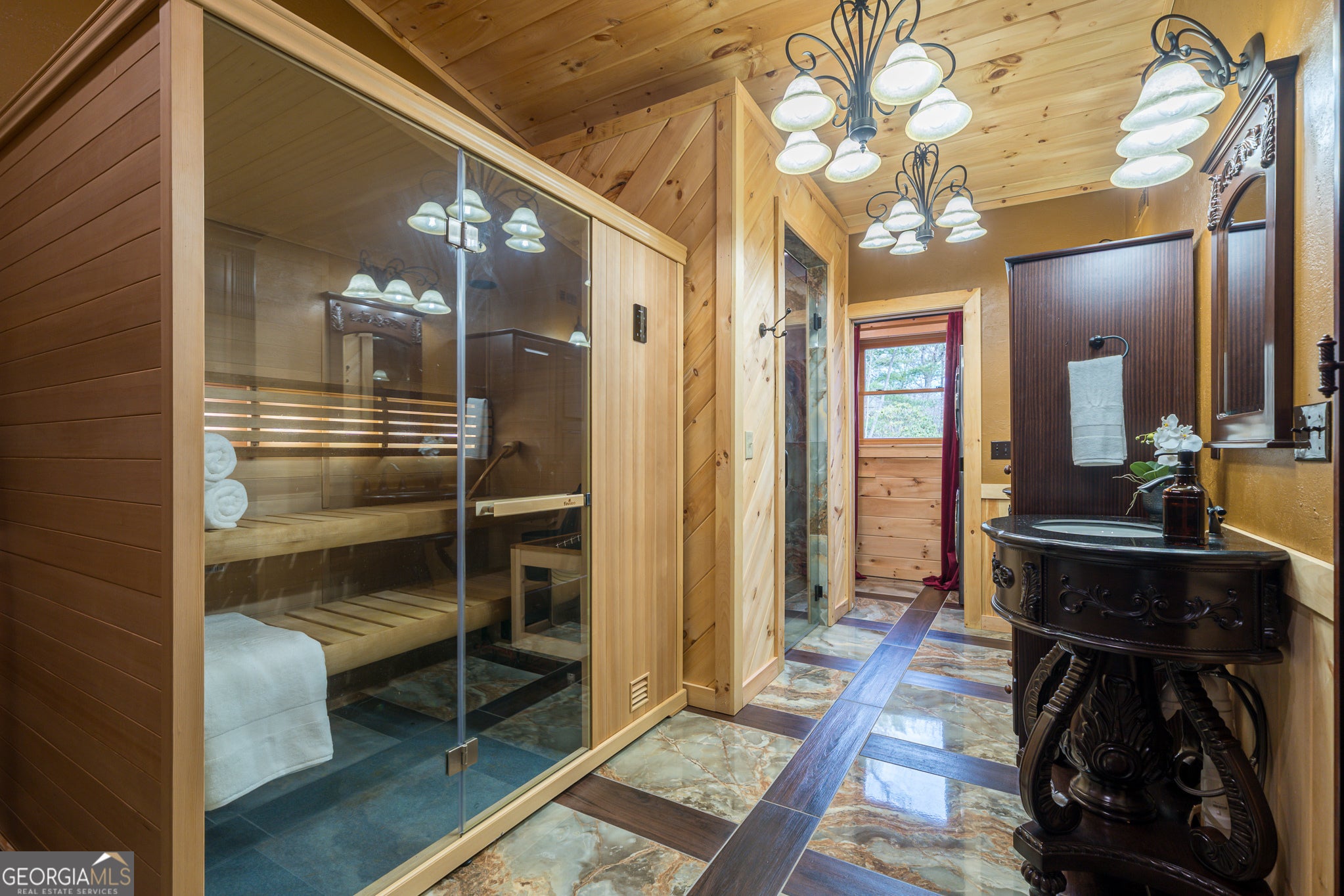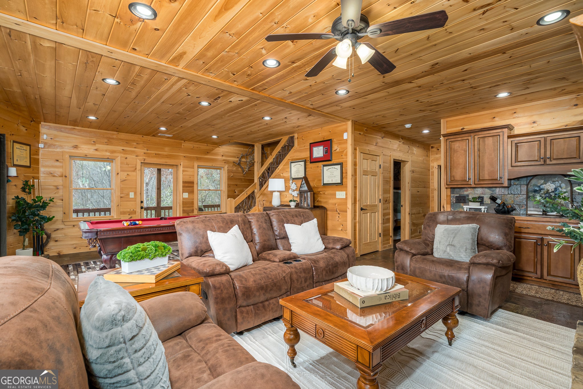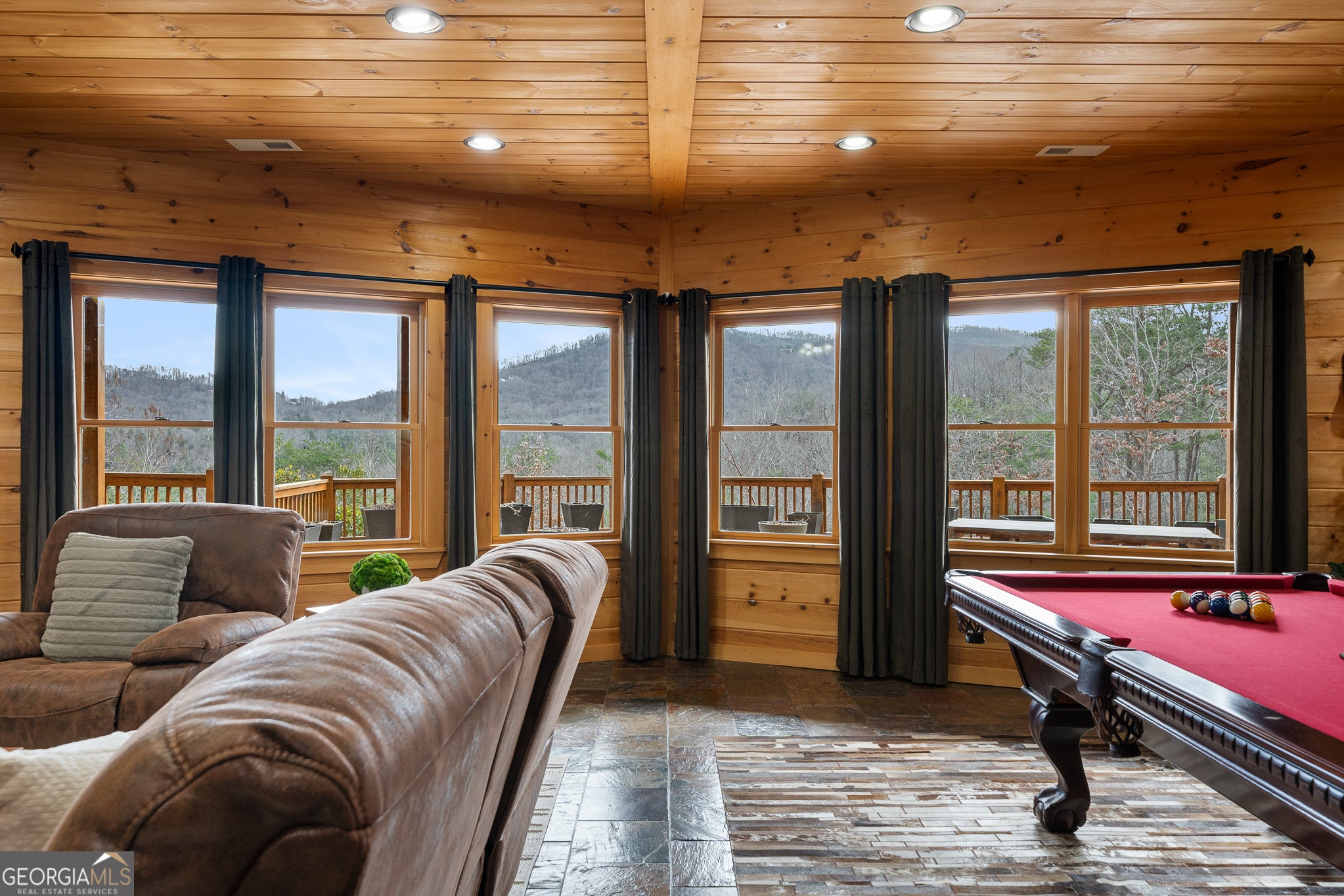 Massive long-range mountain views and a rare combination of privacy and proximity to town define this exceptional cabin, set on a large, well-maintained private lot. Hand-scraped log siding and tongue & groove interior walls create an authentic mountain feel, with thoughtful craftsmanship that includes railings made from mountain laurel branches harvested from the property itself. The main level offers an open concept living area, beautiful hardwood floors, and loads of windows that showcase the view. The well-appointed kitchen anchors the space with soft-close cabinetry, GE Cafe stainless steel appliances, a 4-burner gas stove with center griddle, dual ovens, vertical storage pullouts, cabinet pullouts, and a generous island with a composite granite farmhouse sink w/ touchless faucet, and built-in microwave, making it ideal for everyday living and entertaining. The impressive main level primary suite features a hidden cabinet door entry into the spa-like bath with porcelain floors, a Finnleo sauna, a roll-in shower, a GE towering washer/dryer, and exterior access directly from the bedroom. Enjoy step-free, covered access to the oversized 2-car garage w/ extra-tall doors, loads of cabinetry, approx. 444 sq. ft of attic storage, & a built-in lift for easy transport of seasonal items. The terrace level expands the living space with a large entertainment area complete with a FP and wet bar, a spacious guest bedroom, a well-appointed bath, & sweeping views from both covered & open decks. Upstairs, a loft-style primary bedroom enjoys stunning gable-end mountain views, a private screened deck, a dedicated bath & closet, and an additional loft stoop currently used as an office. With a Generac generator, low-maintenance gutter guards, an asphalt driveway, newer paved roads, and quality construction by respected local builder Brandon Mathis, this home blends classic cabin charm, traditional design, and refined luxury. This cabin truly puts the EXTRA in extraordinary!