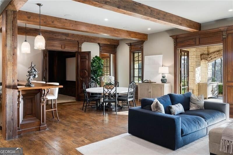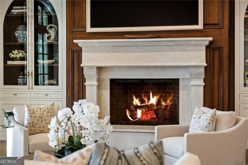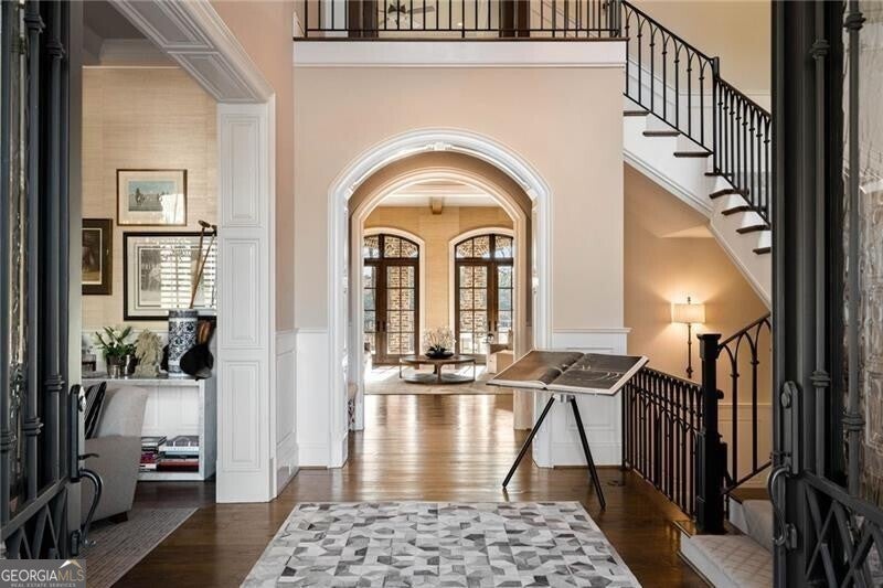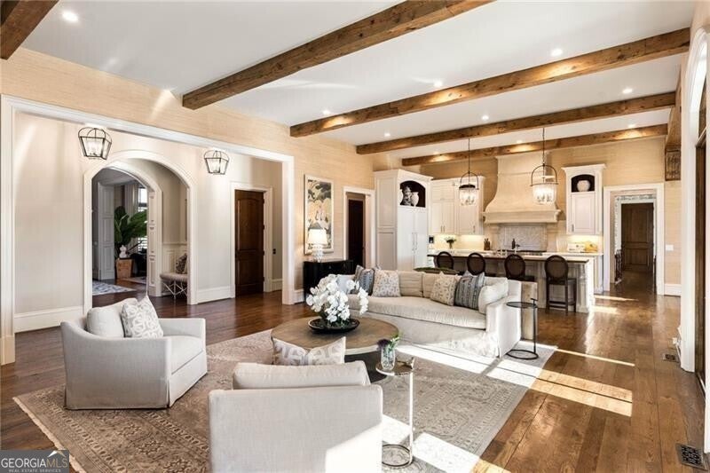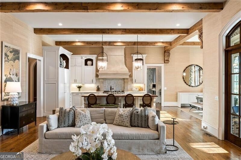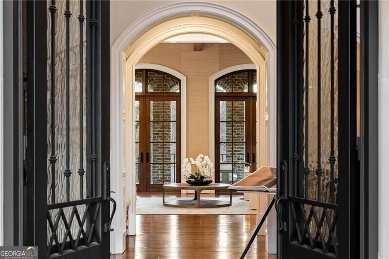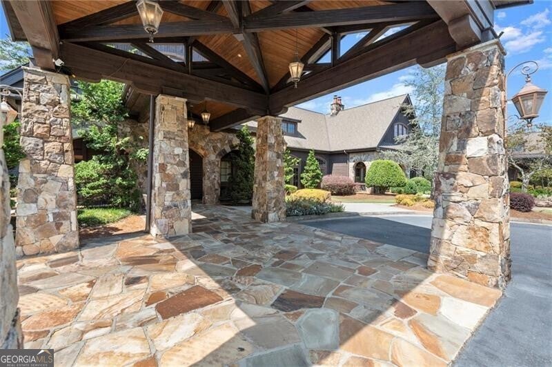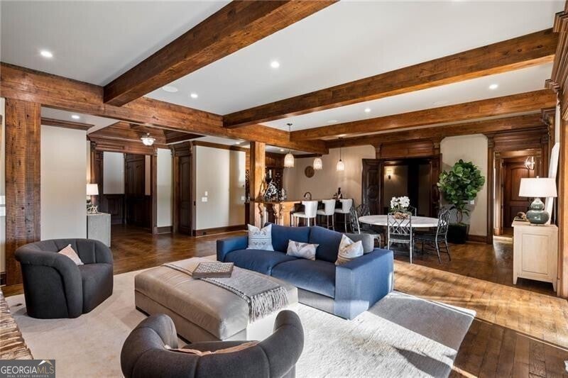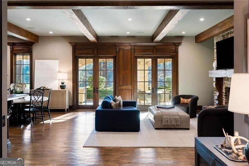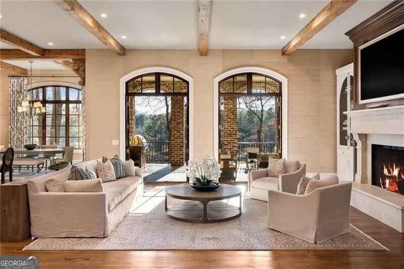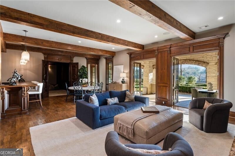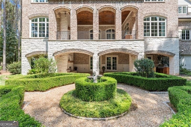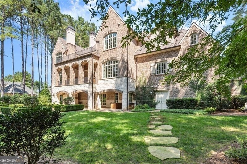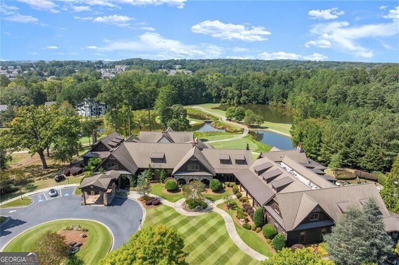 Discover an unparalleled experience in The River Club, where luxurious living meets a refined community, creating an experience unmatched anywhere else. Embrace a lifestyle of sophistication and leisure, where every day feels like a getaway in an exceptional neighborhood. This magnificent estate offers designer elegance with breathtaking views of the 13th hole of the golf course and lake, ensuring total privacy with the serene Chattahoochee River just beyond. The backyard is beautifully enhanced by an elegant English Garden-style landscape, creating a tranquil outdoor retreat. Upon entering, you are greeted by a welcoming foyer that flows seamlessly into the stylishly appointed martini room, which exudes a moody and sophisticated ambiance while also offering the versatility to serve as a formal dining room. The attention to detail is immediately apparent, with custom metal handrails adorning the staircase leading to the second floor. The expansive fireside great room, adorned with rustic wood beams, opens to a meticulously designed kitchen and breakfast room, perfect for both entertaining and everyday living. The kitchen extends to include a charming coffee bar area, complemented by a gorgeous walk-in butler's pantry, enhancing functionality and style. Double french doors lead to an outdoor retreat featuring a cozy fireplace, creating a seamless indoor-outdoor flow that enhances the overall ambiance. The luxurious primary suite is conveniently located on the main level and features distinctive herringbone-pattern hardwood floors that highlight the elegance of the space. The en-suite bath includes a separate soaking tub, an oversized zero-entry shower, dual vanities, a ladies' makeup vanity, and spacious his and her closets. A light-filled sitting room completes this exceptional suite. Ascending to the second floor, you will find three well-appointed secondary bedrooms. Two of these bedrooms are mirror images of each other, each boasting spa-like baths, sitting areas, and expansive closet space. Both suites enjoy access to private rooftop terraces with picturesque views of the lake and golf course. Additionally, convenient elevator service provides access to all three floors. The lower level is designed for entertaining and includes a custom bar, media room, state-of-the-art home theater, home gym, a massage room, and an oversized en suite guest bathroom. This home features an array of unique finishes that are truly one-of-a-kind, including reclaimed beams, exquisite ceiling treatments, distinctive door hardware, and custom lighting fixtures. Welcome home to The River Club where residents enjoy a wealth of amenities, including a championship golf course, a state-of-the-art fitness center, and a stunning clubhouse with elegant dining and event spaces. The resort-style swimming pool features Olympic lanes, a thrilling waterslide, and comfortable cabanas, while tennis and pickleball courts offer additional recreational opportunities. With picturesque walking trails, serene lakes, and beautifully landscaped parks, residents can embrace an active lifestyle and a strong sense of community.