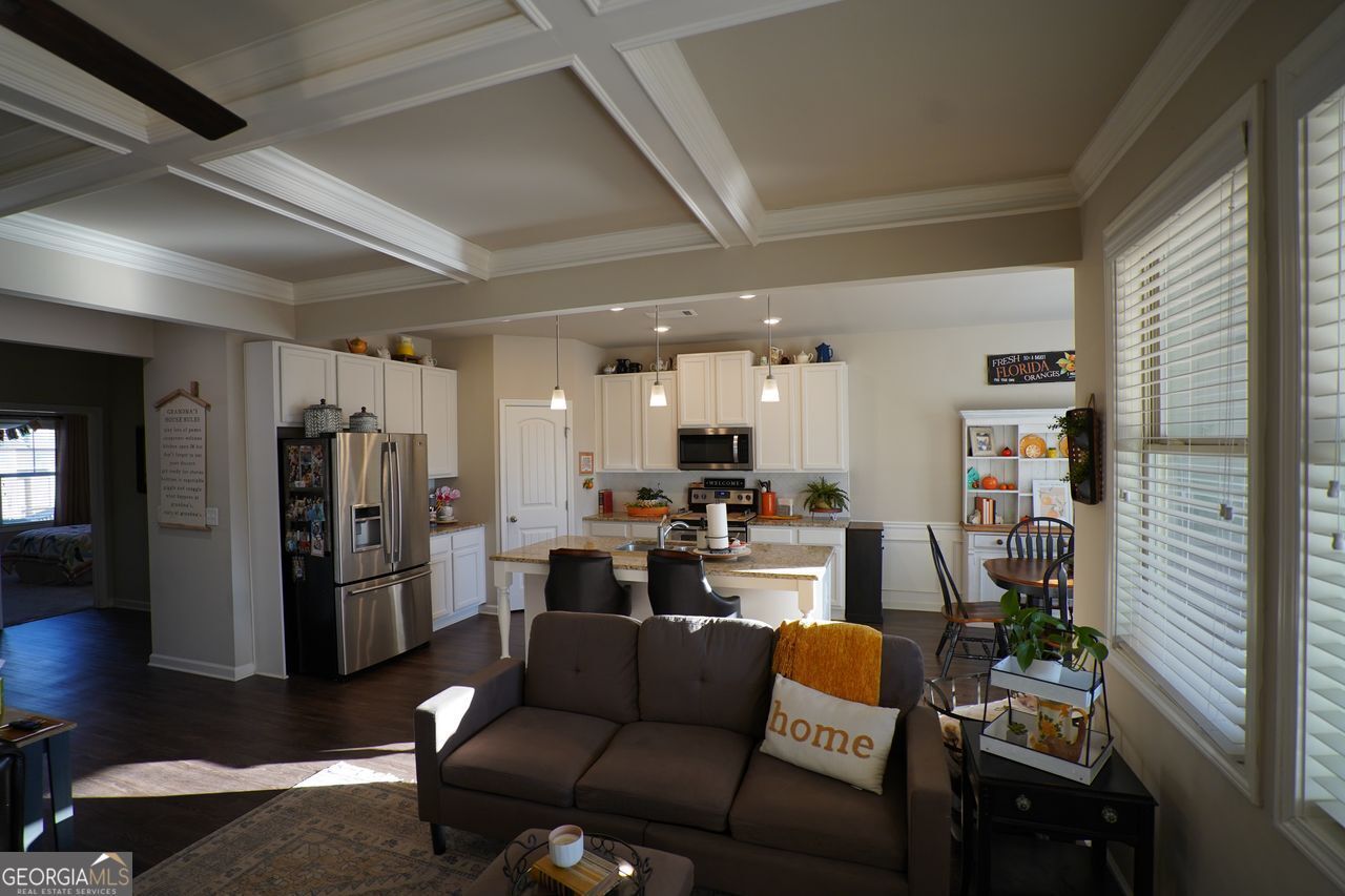 Don't miss this opportunity. $10K Price Reduction. Location, Location, LOCATION! Stunning 3BR/2BA Ranch with 2 car garage. This home features a spacious open floor plan, perfect for modern living and entertaining, in the charming city of Braselton, GA! As you enter, you'll be greeted by an inviting foyer that leads to a bright and airy living room with a corner fireplace, showcasing high coffered ceilings and large windows that fill the space with natural light. The kitchen has a walk in pantry and is a chef's delight, complete with stainless steel appliances, granite countertops, and a large island that provides ample prep space and seating. Dining area is open to the kitchen. The Master suite is a true retreat, featuring a luxurious en-suite bathroom with large shower, and dual vanities with granite tops. Large walk-in closet and laundry. Additional bedrooms are generously sized and share a bath, offering plenty of room for family or guests. Step outside to your private backyard oasis, ideal for outdoor gatherings or peaceful relaxation. Custom covered back porch with outdoor fireplace. Located in Creekside at Mulberry Park, with easy access to shopping dining, parks, and schools, this home is not just a place to live, but a lifestyle. Neighborhood amenities include a pool, playground and walking trails.